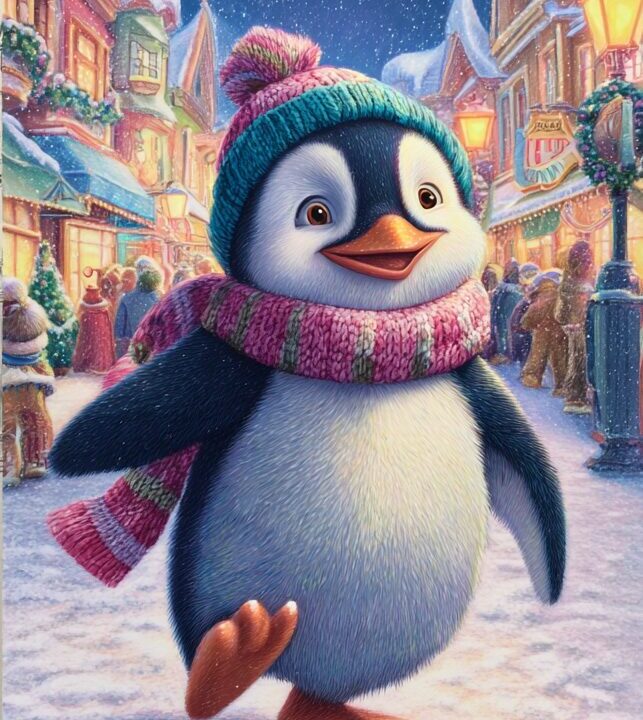 無料塗り絵:かわいいニットとマフラーをまいたペンギン(大人の塗り絵)