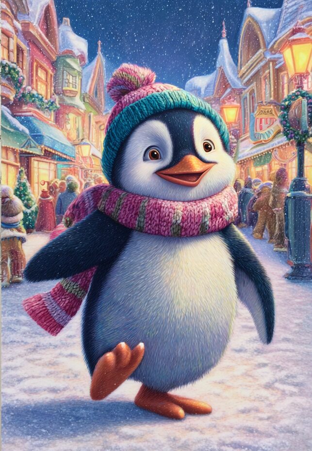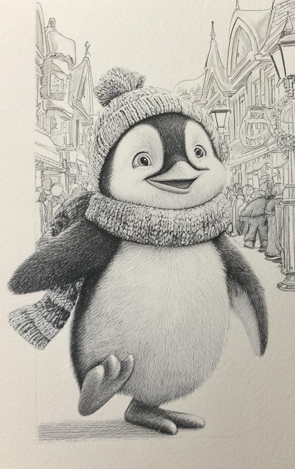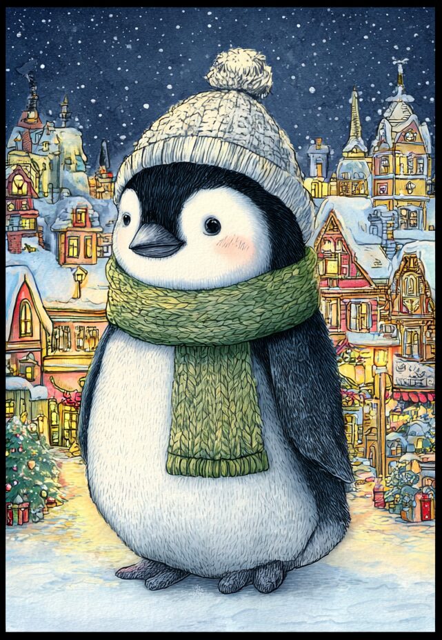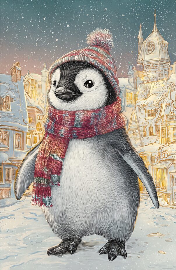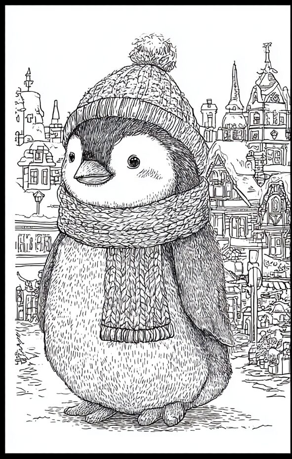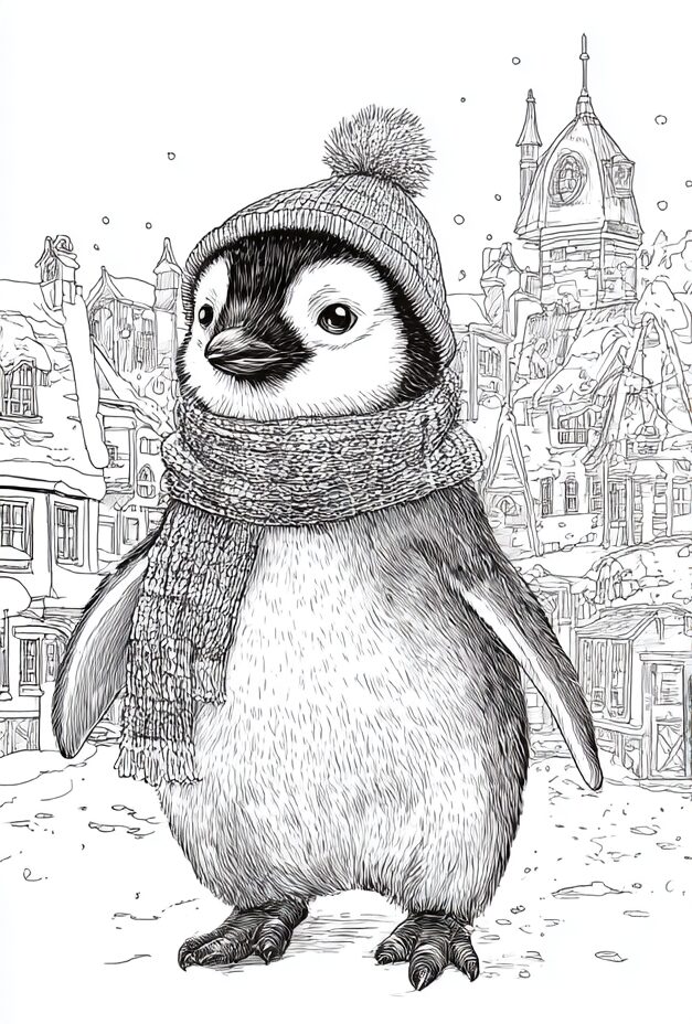 無料塗り絵:かわいいニットとマフラーをまいたペンギン(大人の塗り絵)