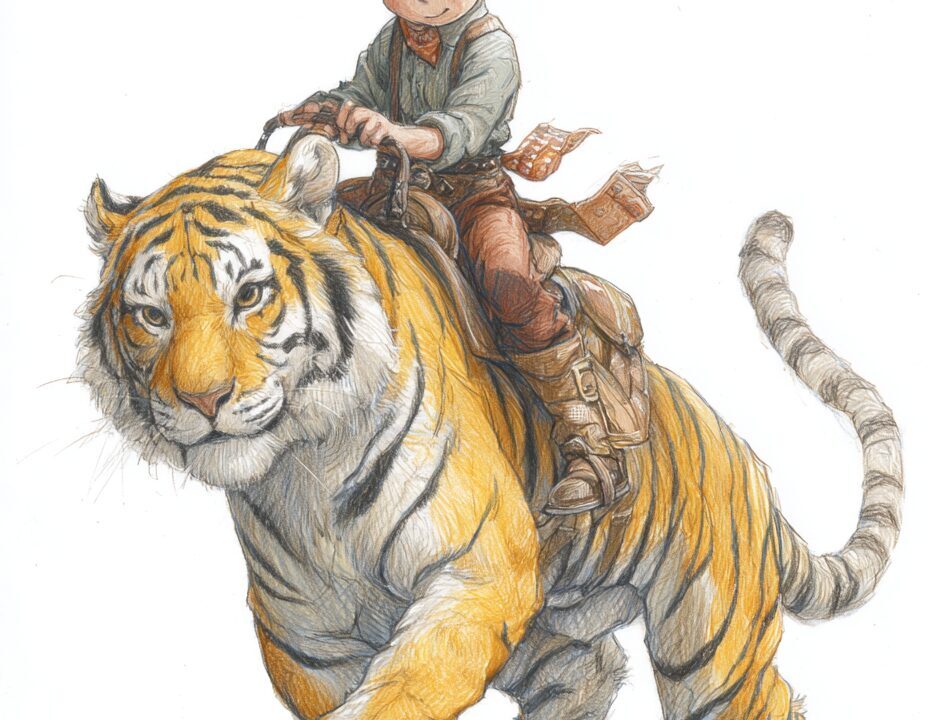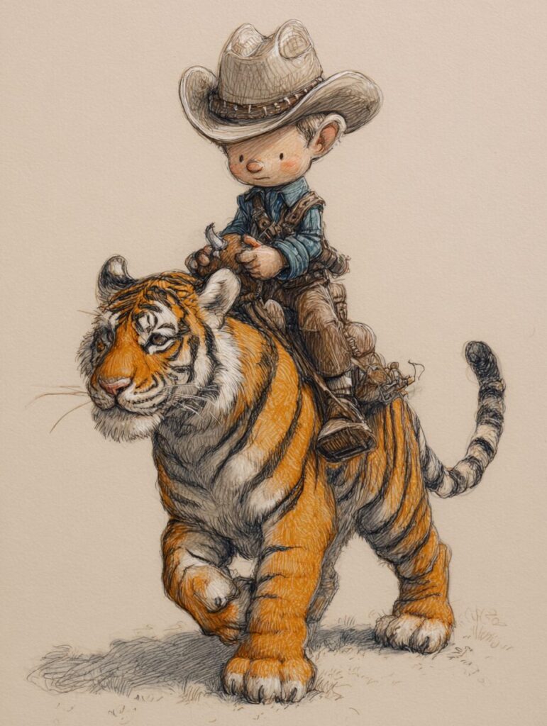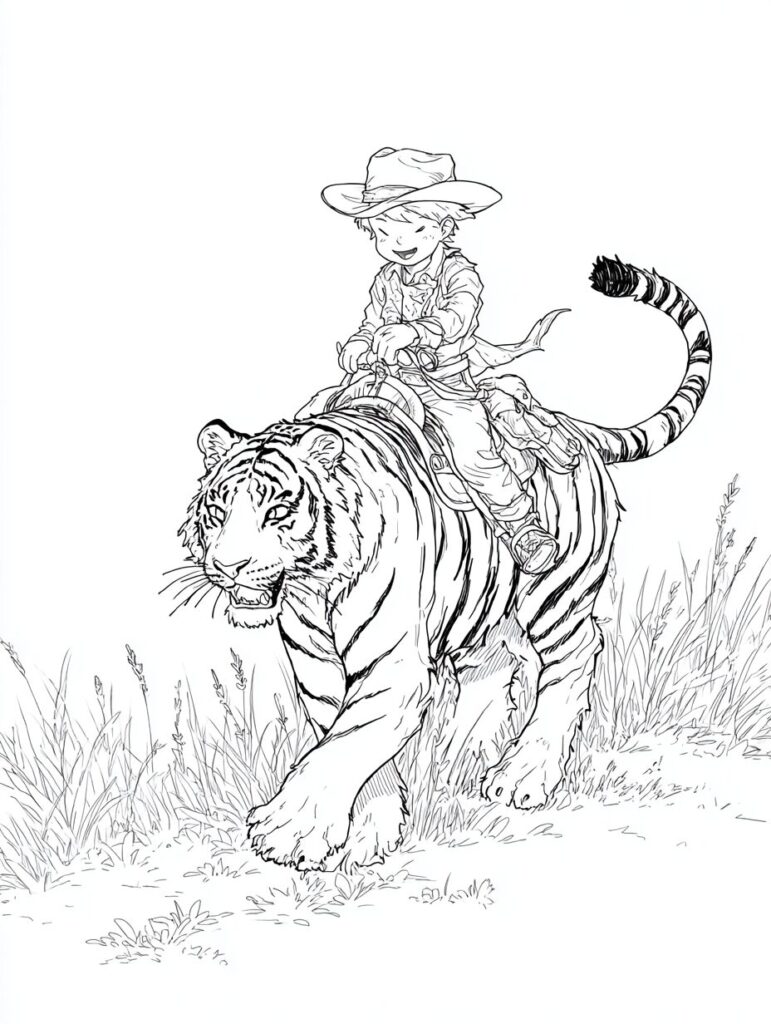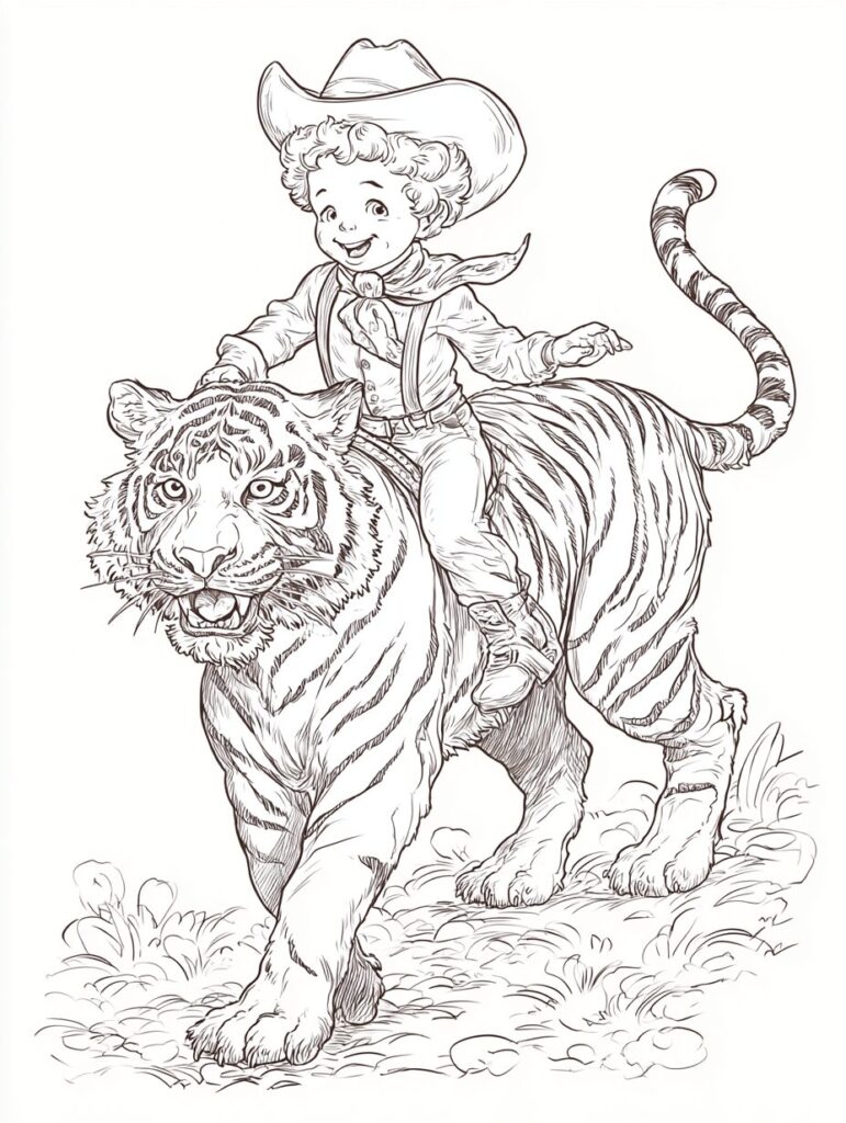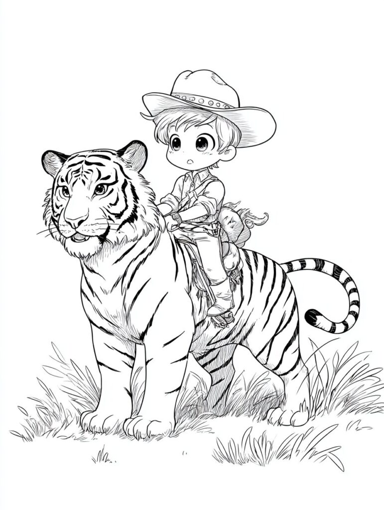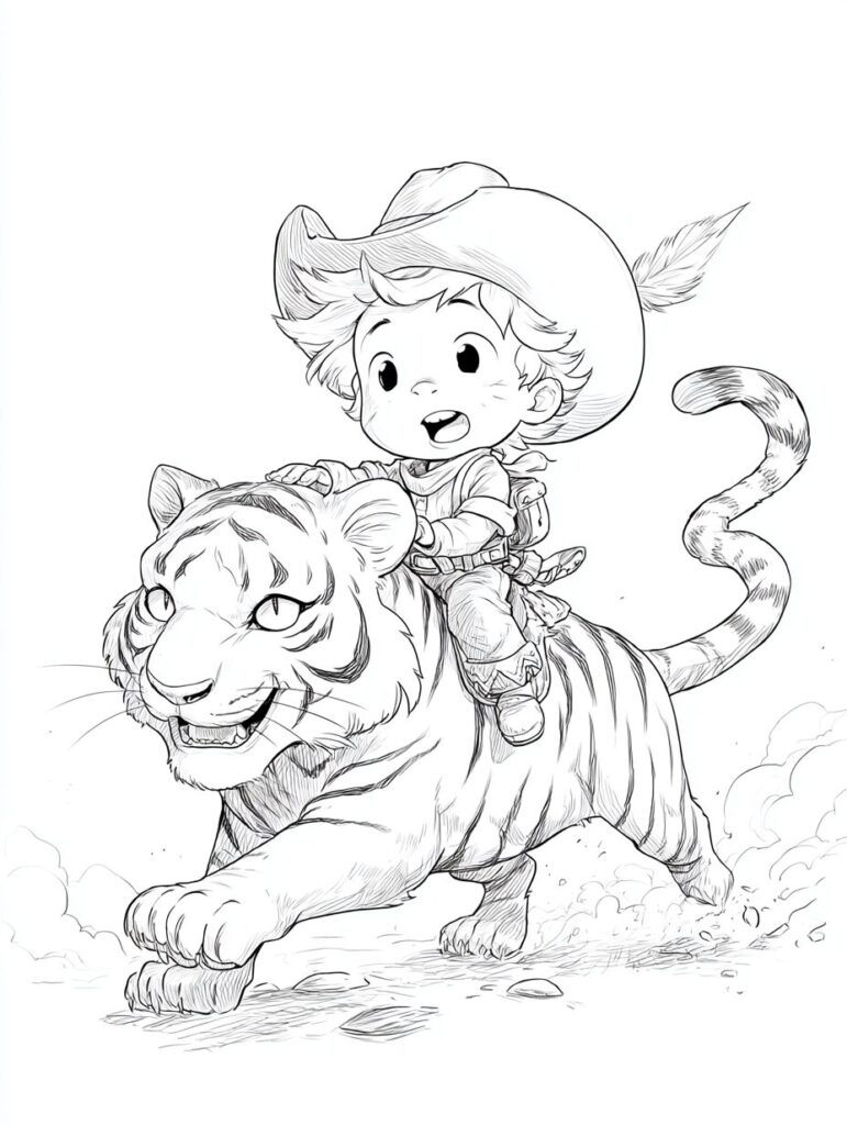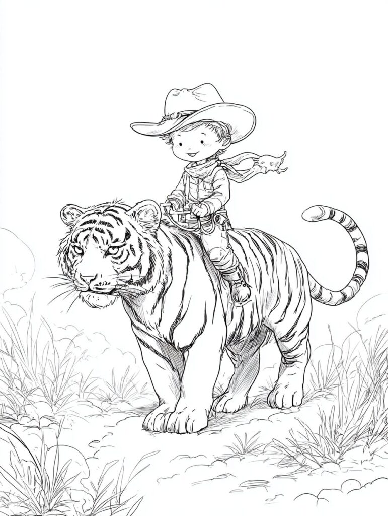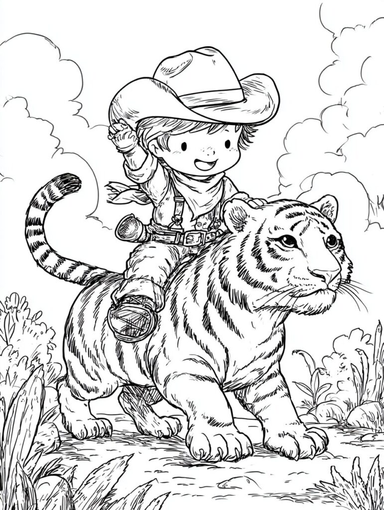 無料塗り絵:かわいいカウボーイと虎(大人の塗り絵)