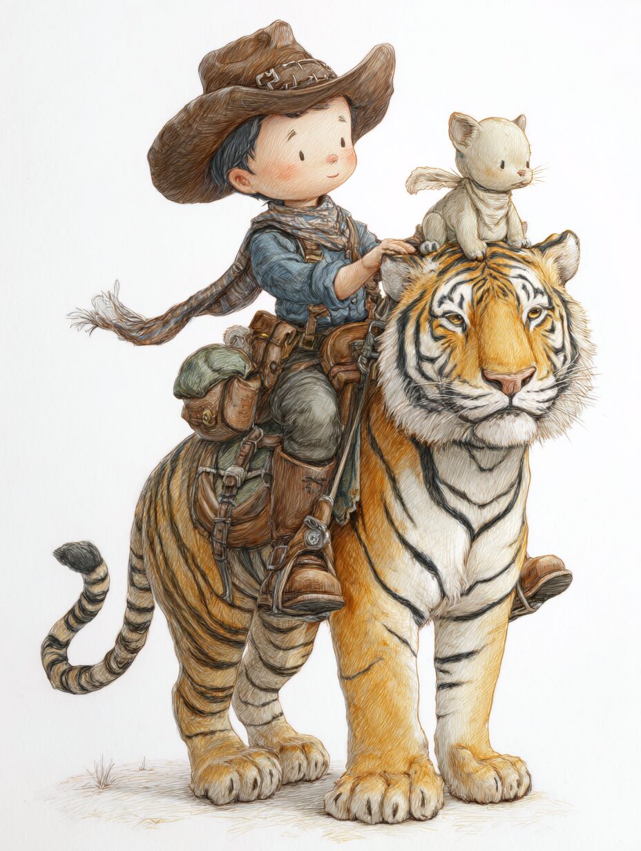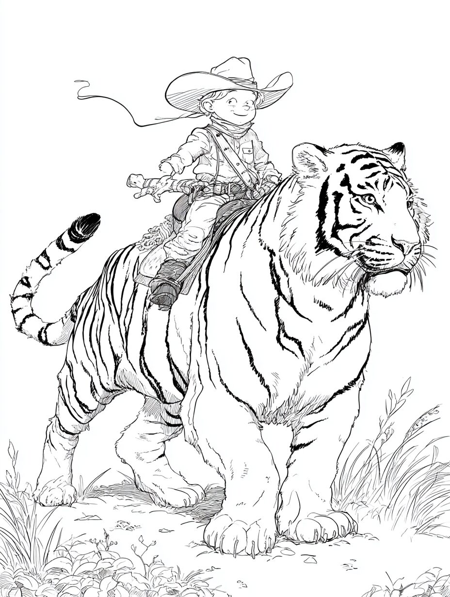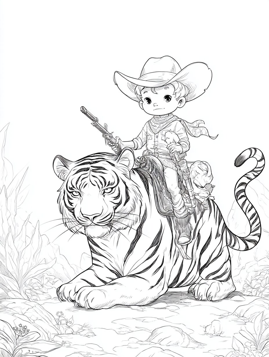 無料塗り絵:かわいいカウボーイと虎(大人の塗り絵)