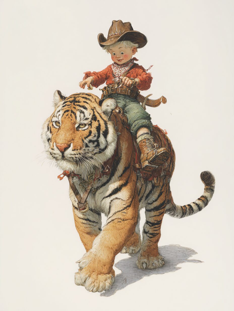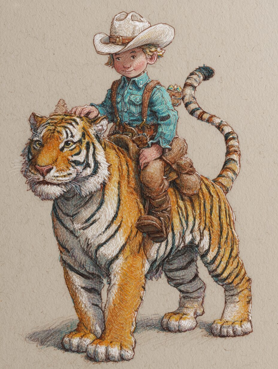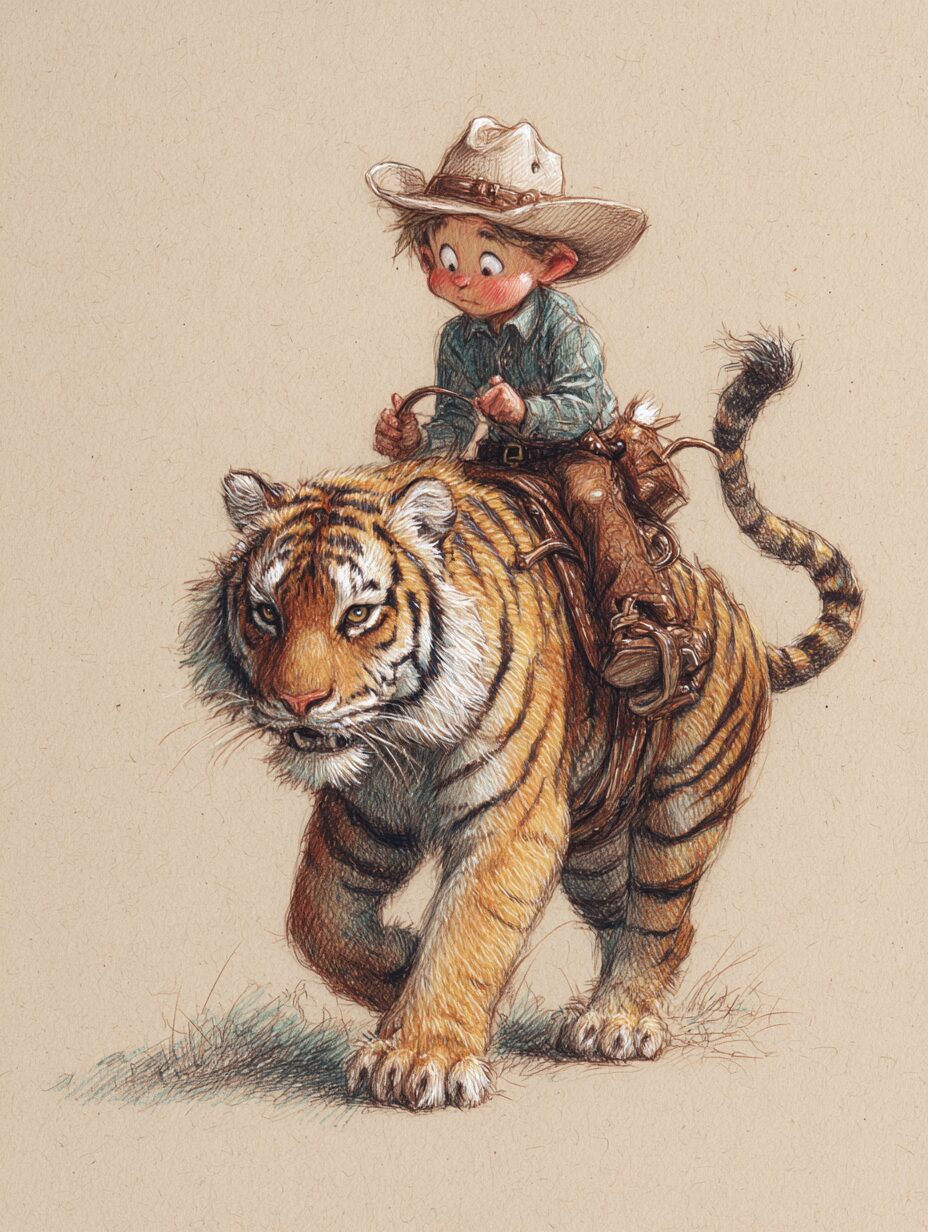 無料塗り絵:かわいいカウボーイと虎(大人の塗り絵)