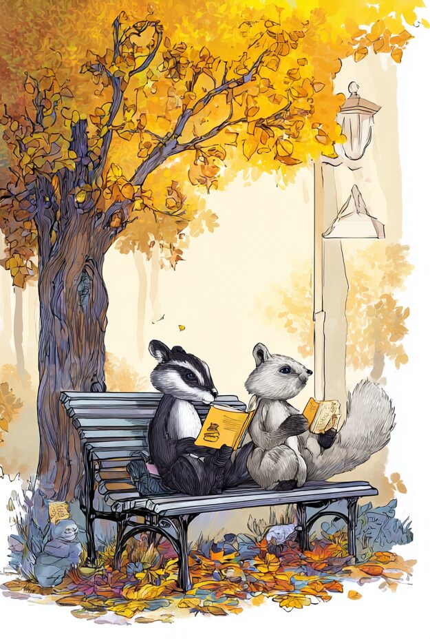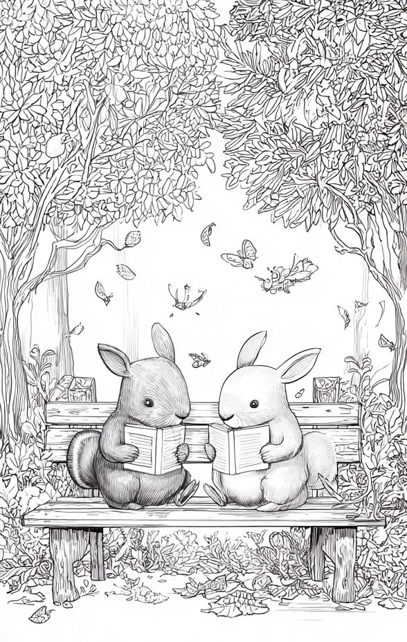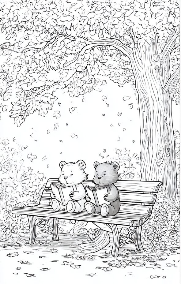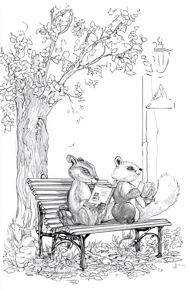 無料塗り絵:秋に読書する動物たち(大人の塗り絵)