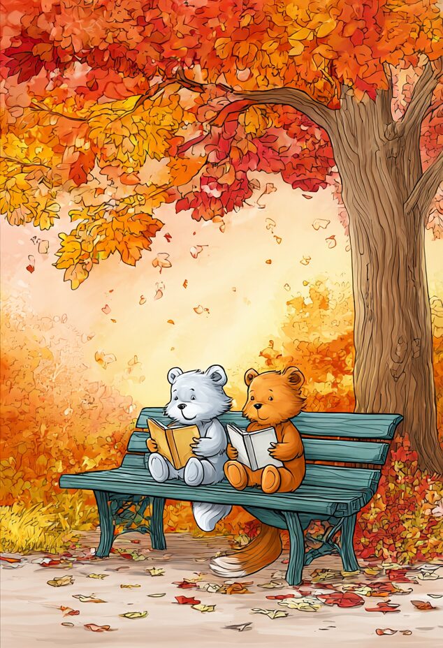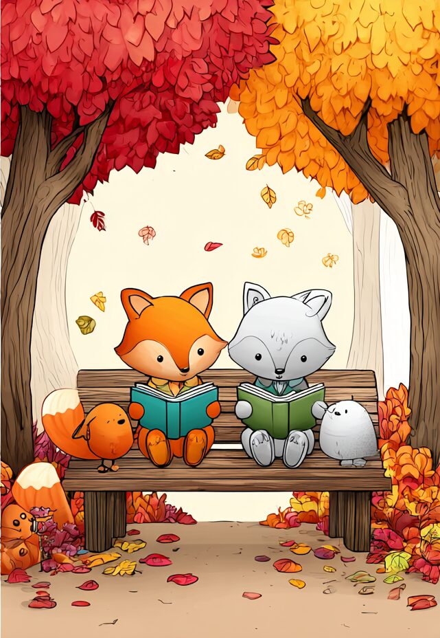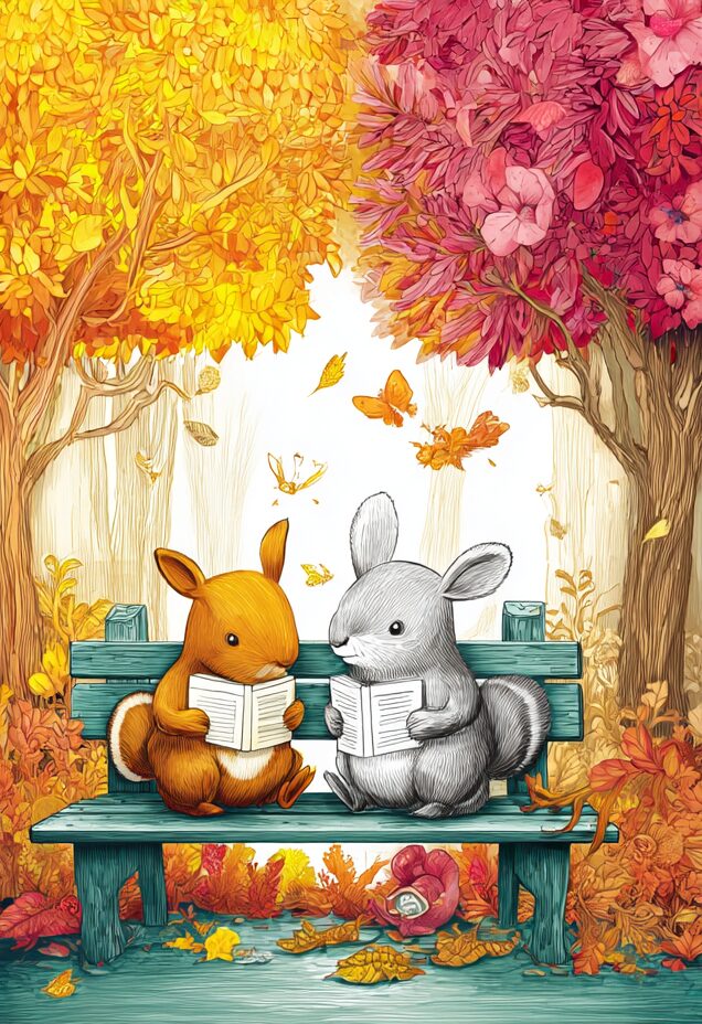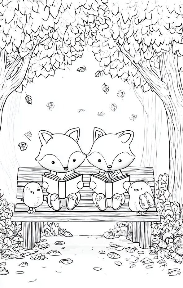 秋に読書する動物たちの塗り絵|無料塗り絵プリント/高齢者用