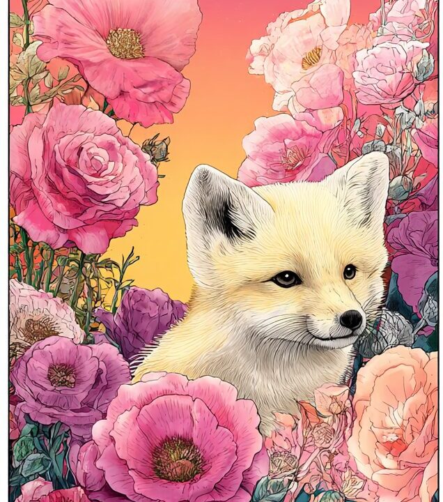 無料塗り絵:赤ちゃんキツネとバラ園(大人の塗り絵)
