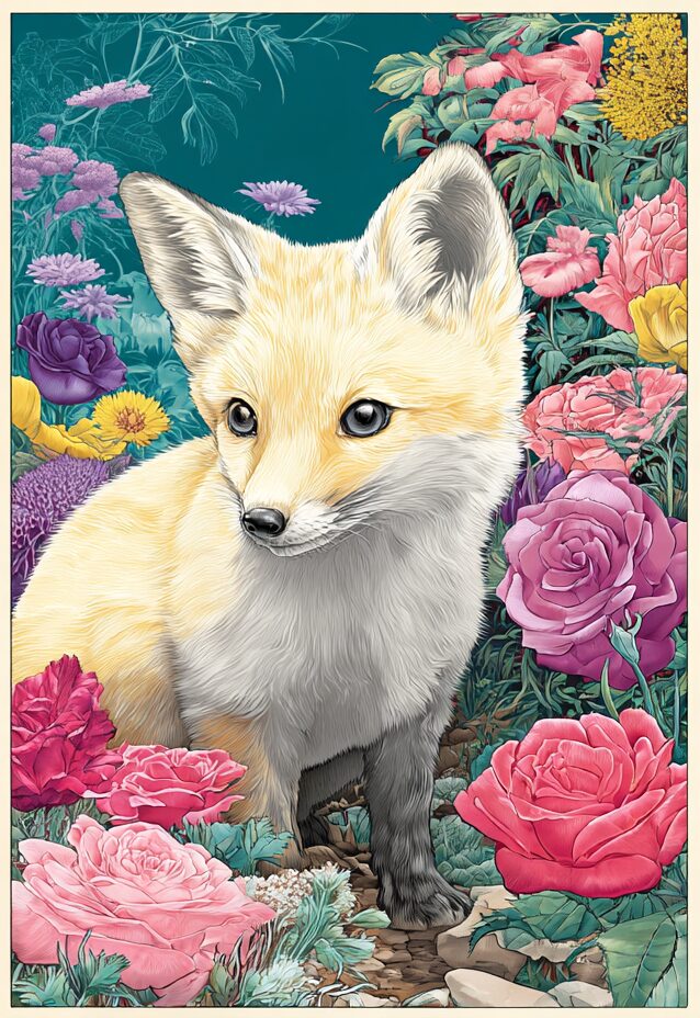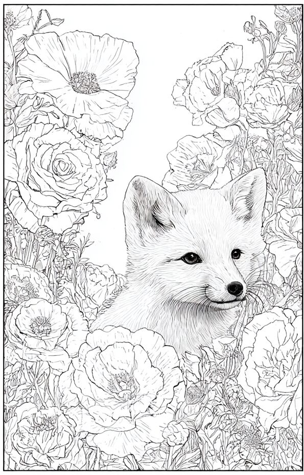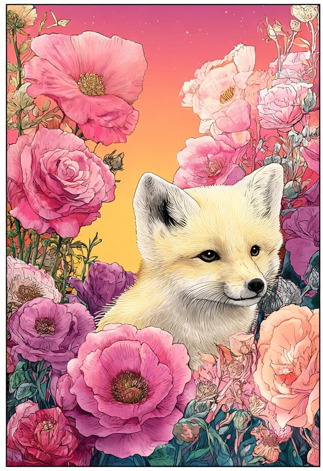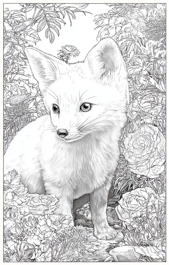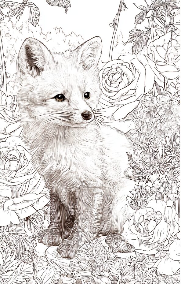 無料塗り絵:赤ちゃんキツネとバラ園(大人の塗り絵)