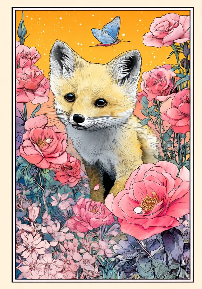 赤ちゃんキツネとバラ園の塗り絵|無料塗り絵プリント/高齢者用