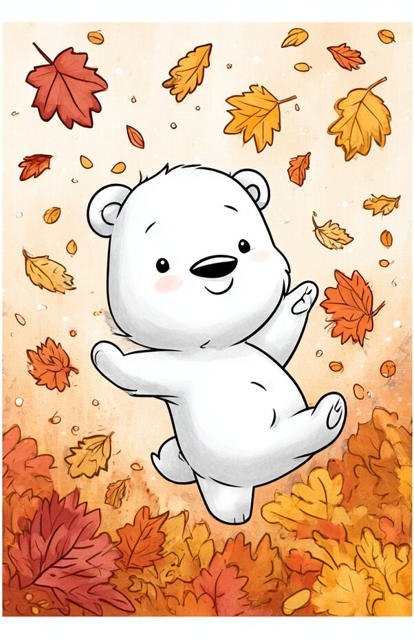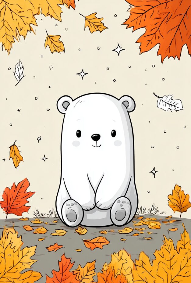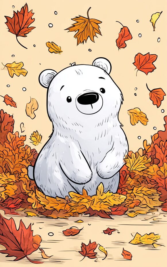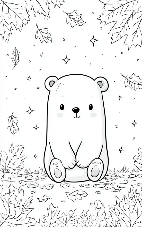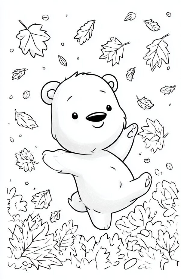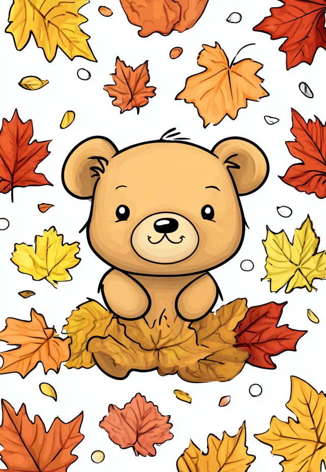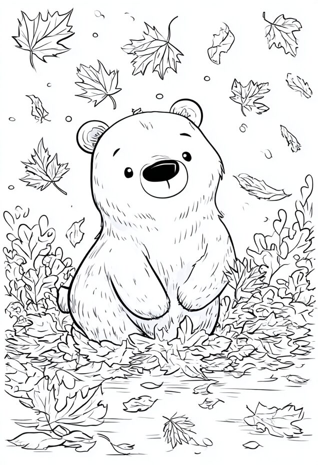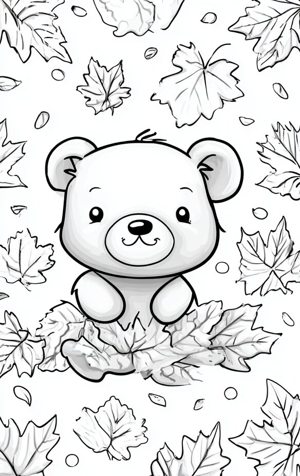 無料塗り絵:クマと秋の葉(大人の塗り絵)