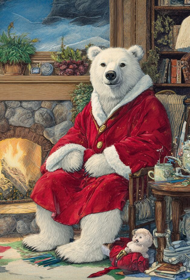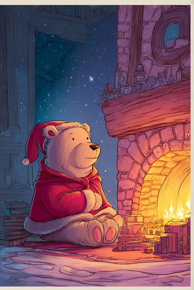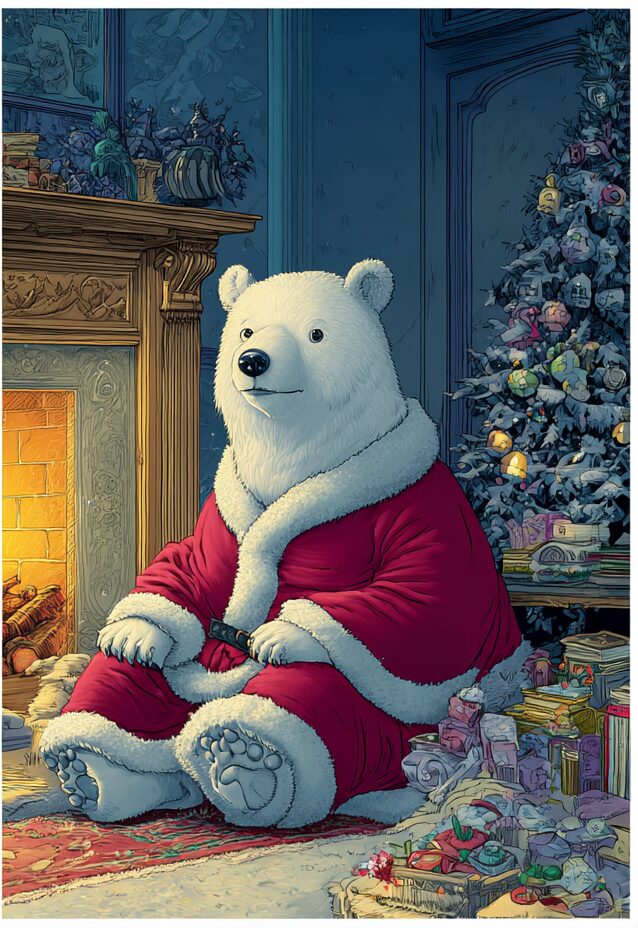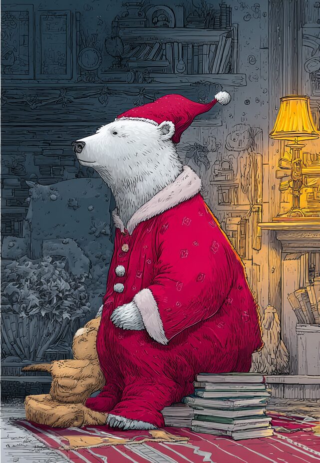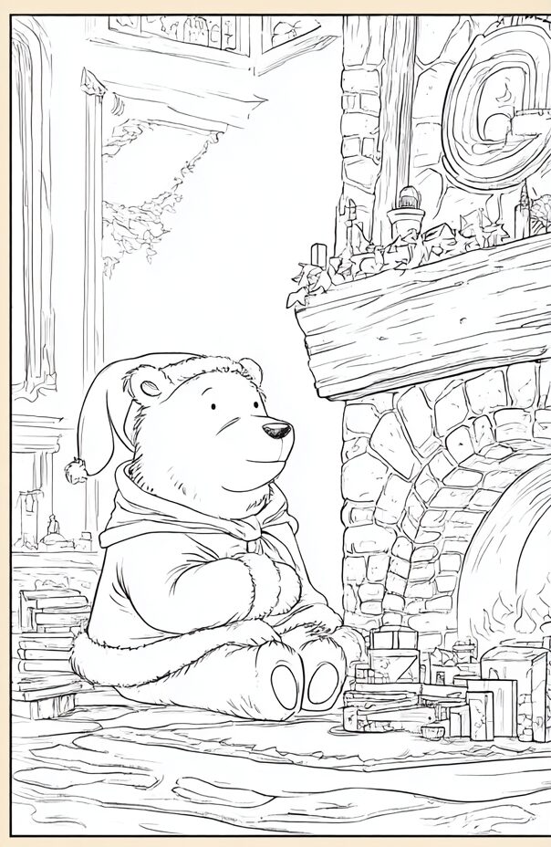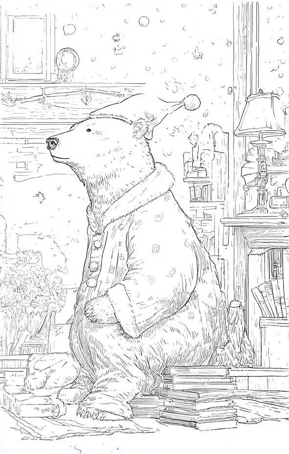 無料塗り絵:クリスマスを待っているクマ(大人の塗り絵)