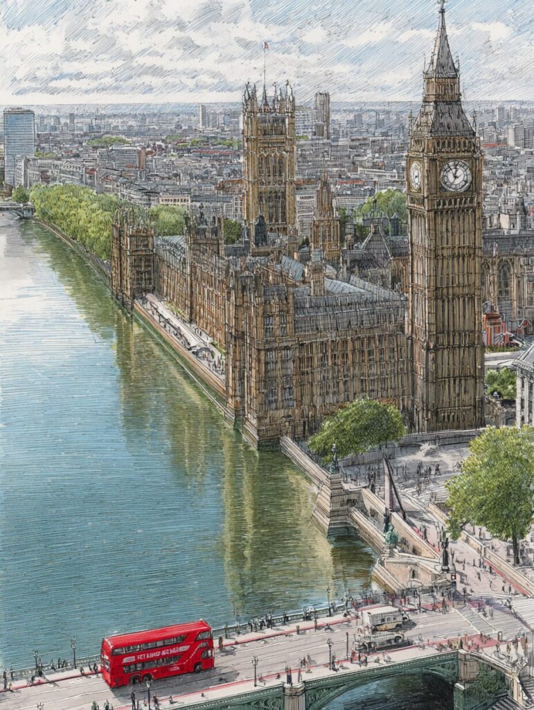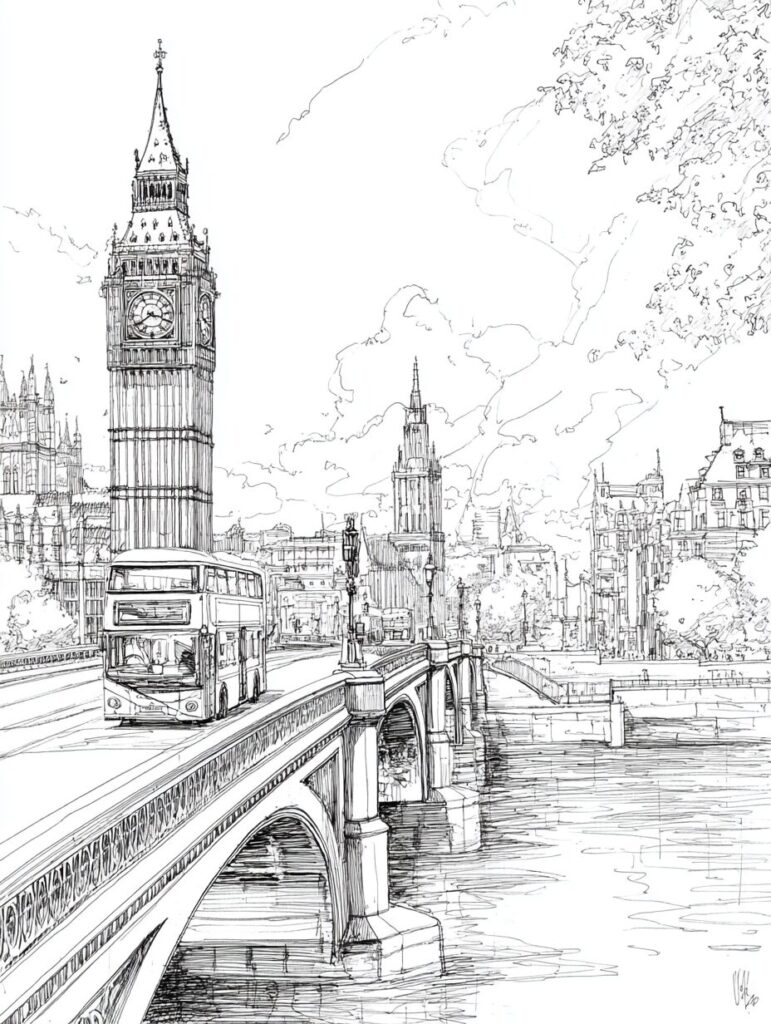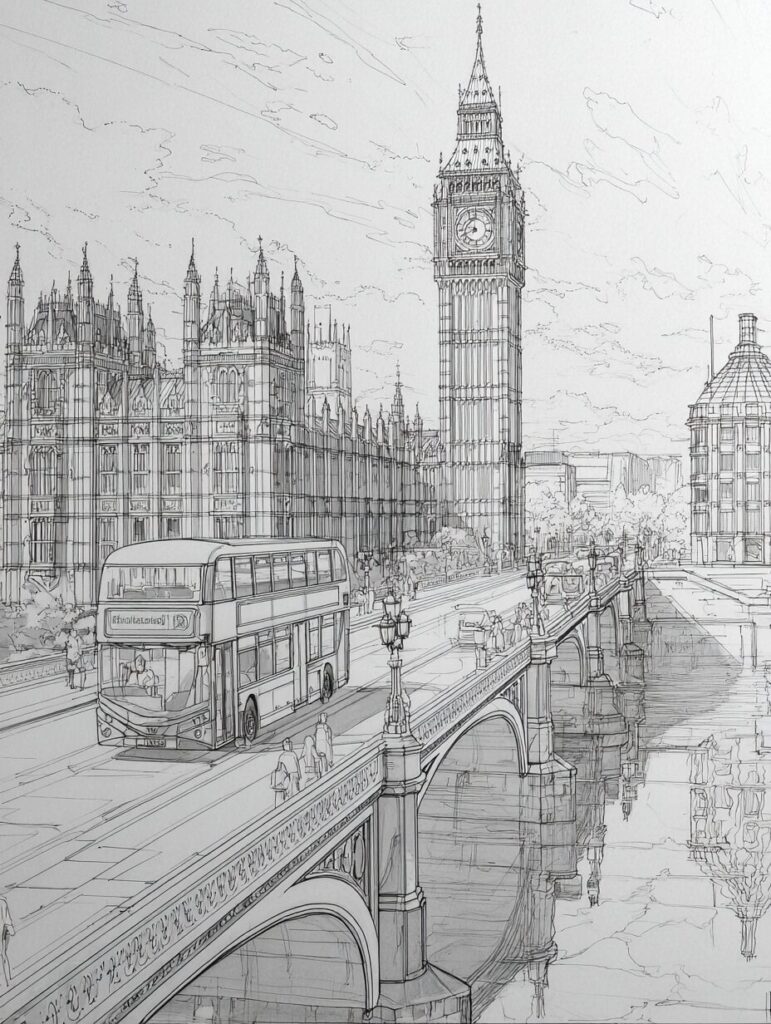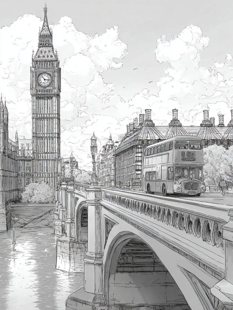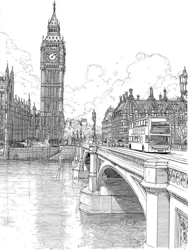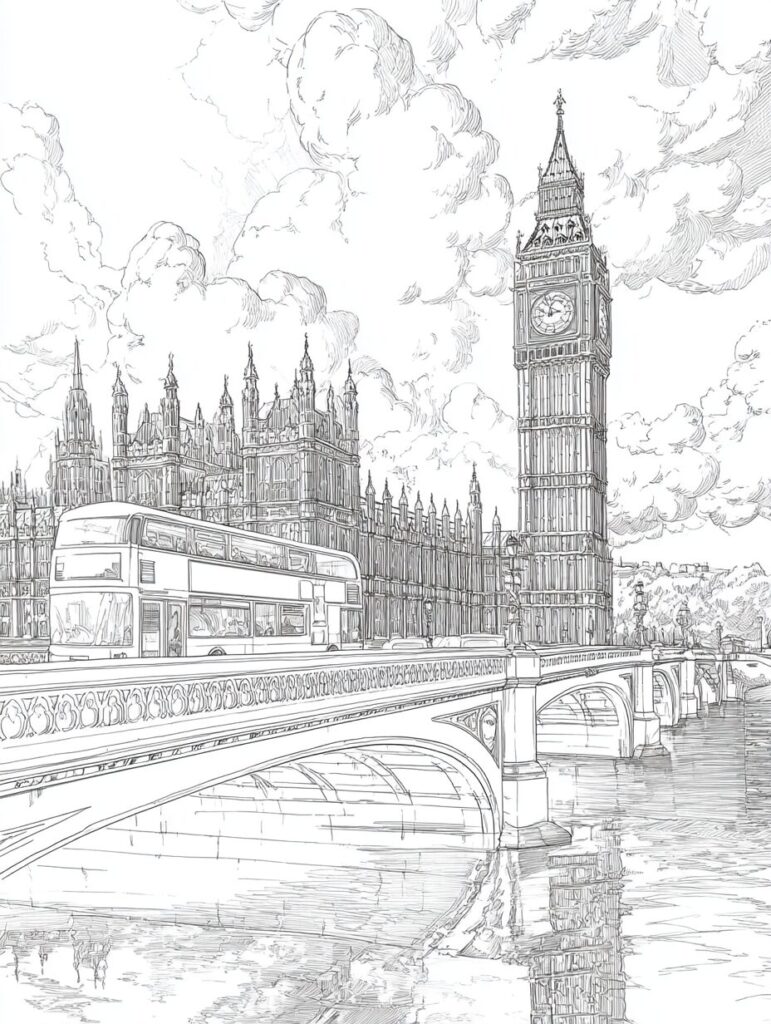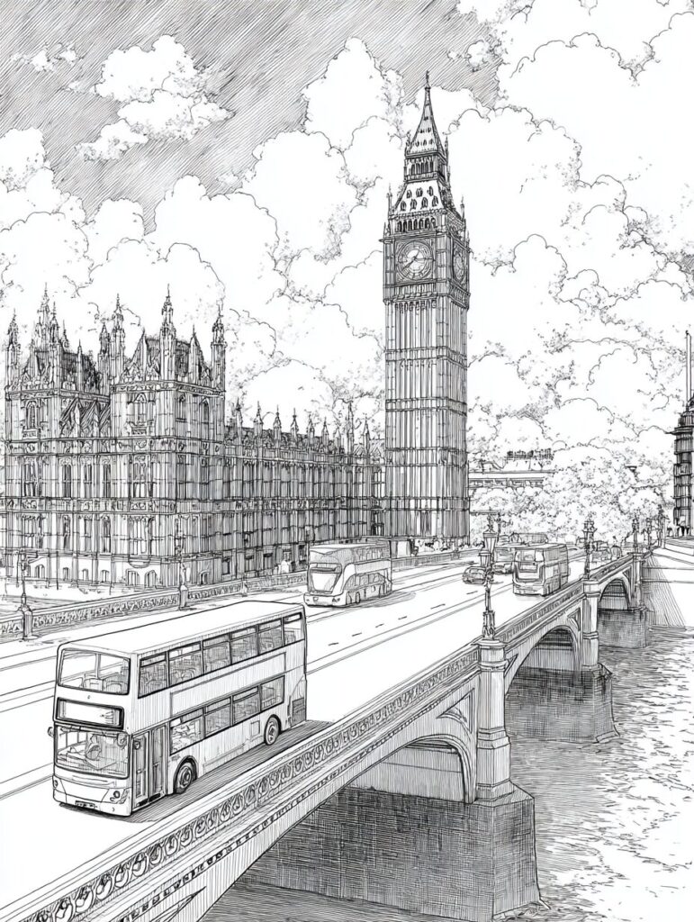 無料塗り絵:ビッグベンのウェストミンスター橋と赤いバス(大人の塗り絵)