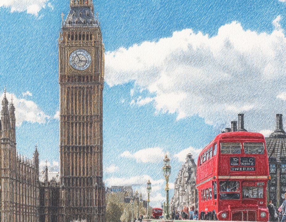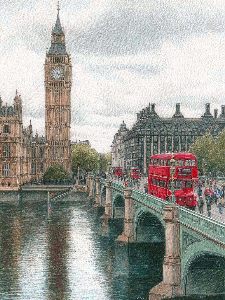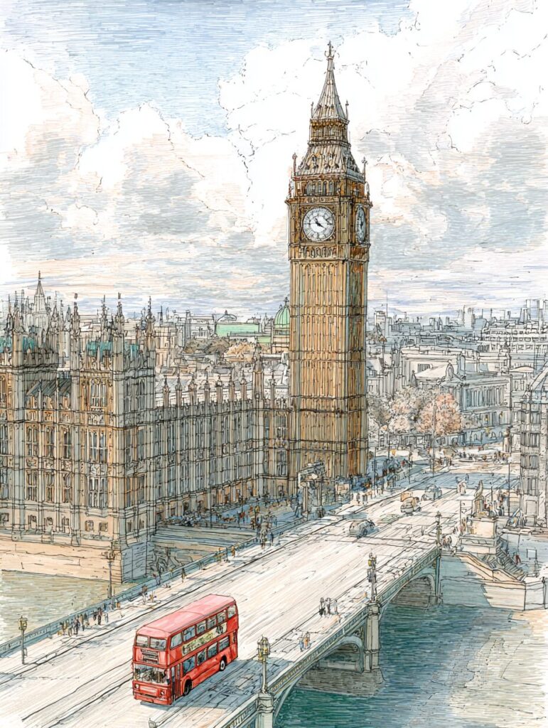 ビッグベンのウェストミンスター橋と赤いバスの風景塗り絵|無料塗り絵プリント/高齢者用