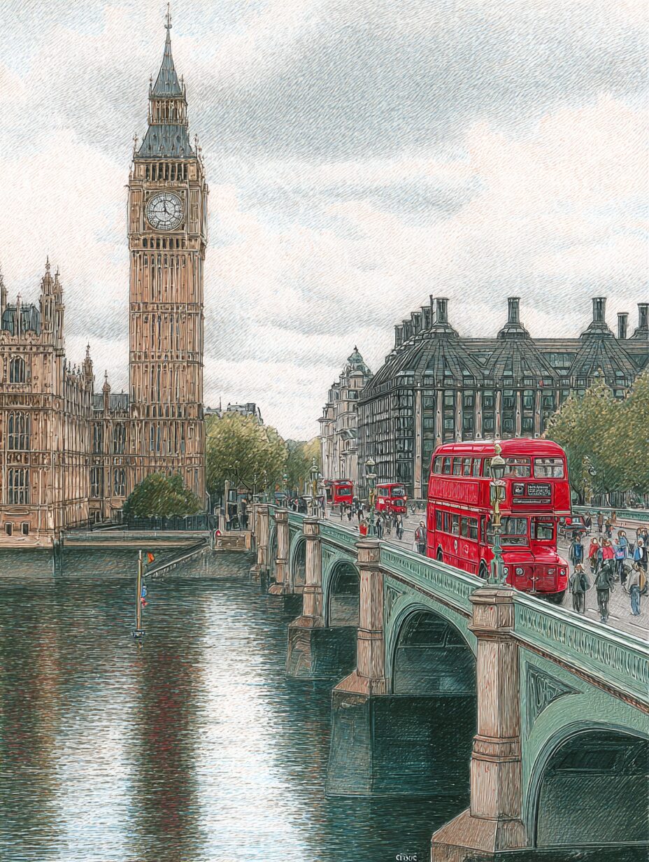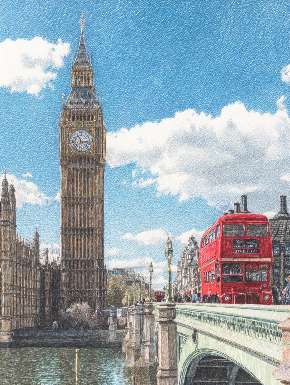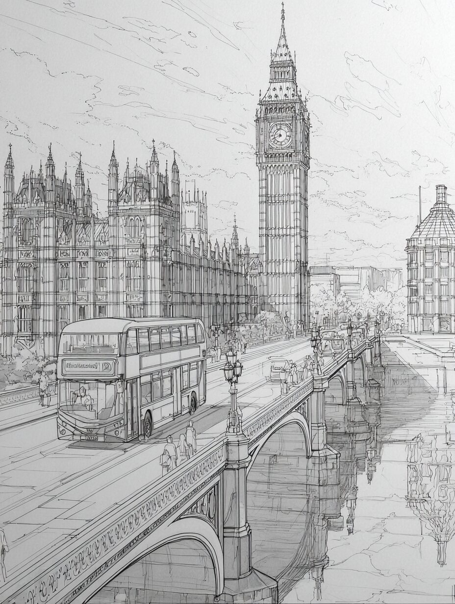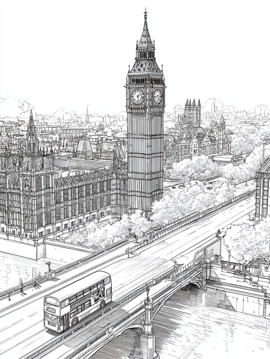 無料塗り絵:ビッグベンのウェストミンスター橋と赤いバス(大人の塗り絵)