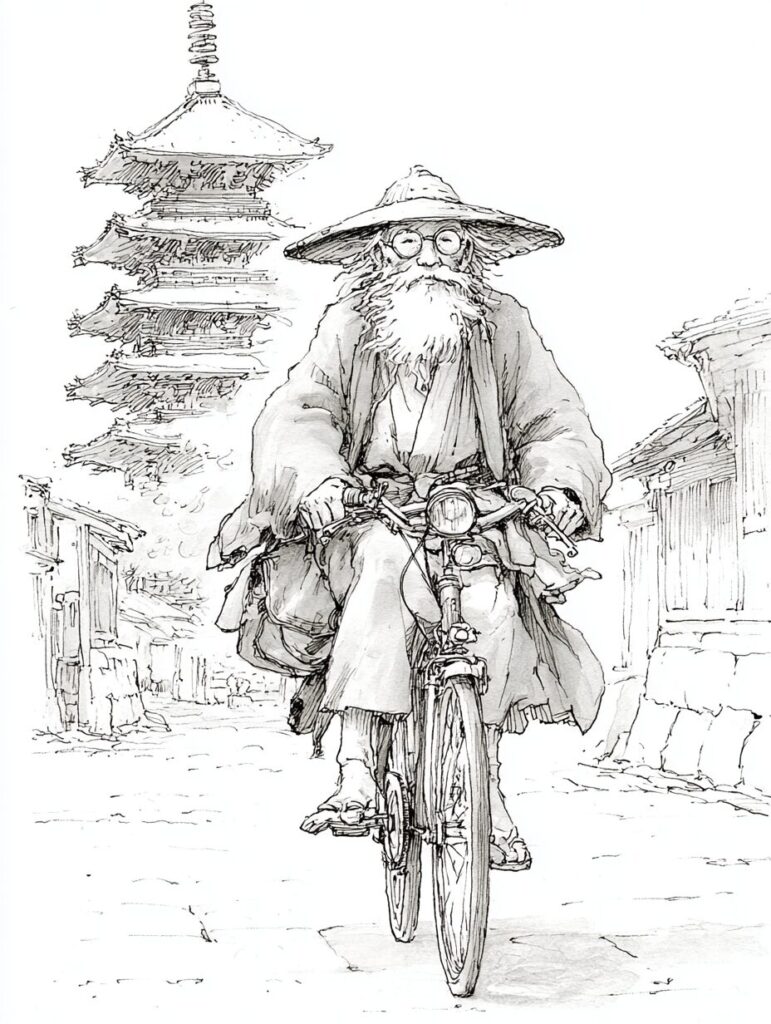 無料塗り絵:レトロなバイクで走るおじいさん(大人の塗り絵)