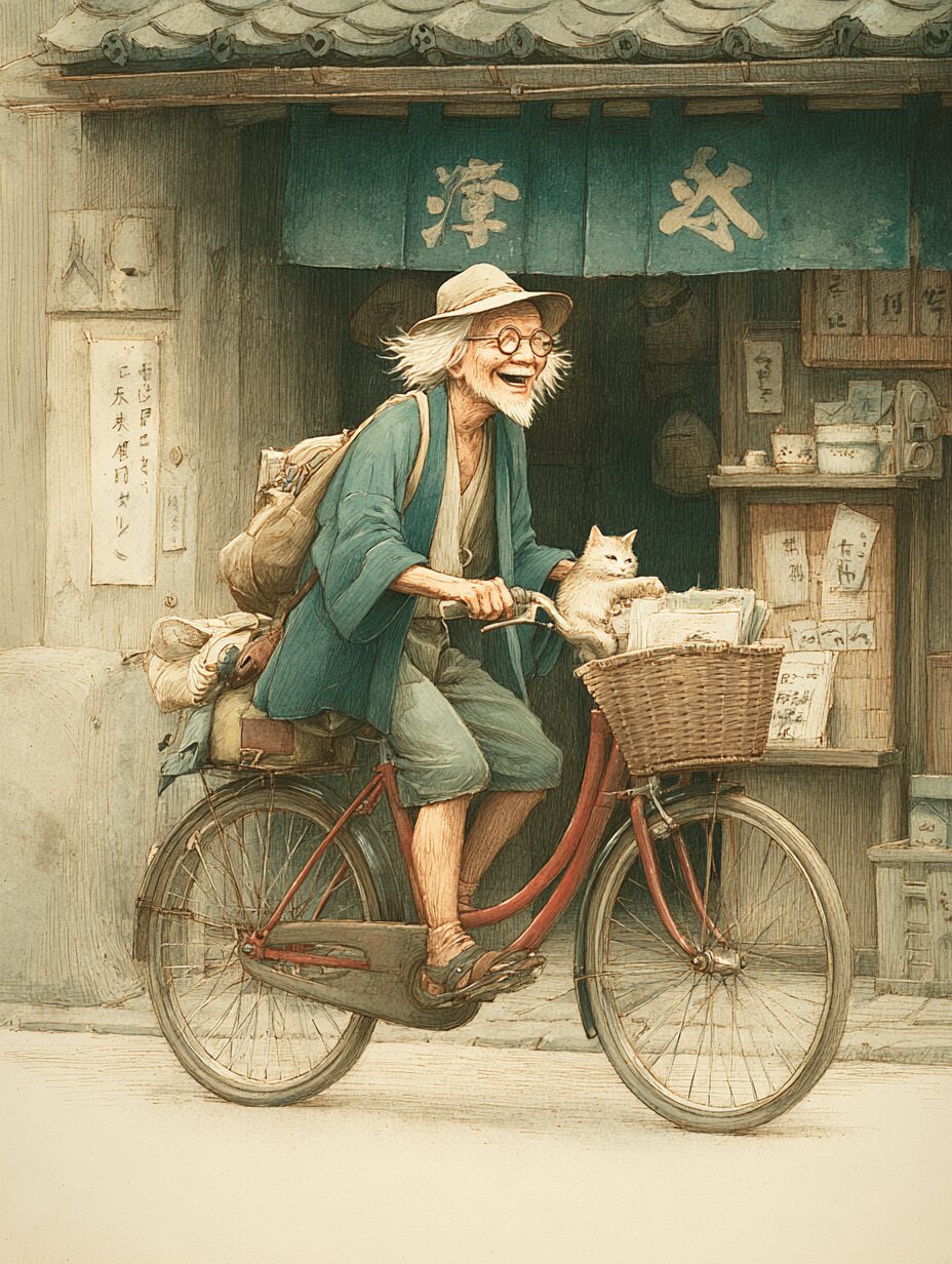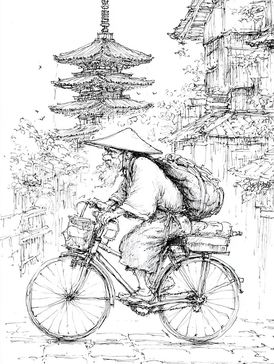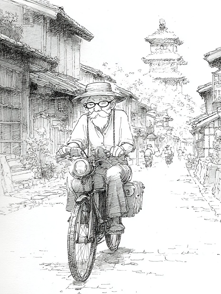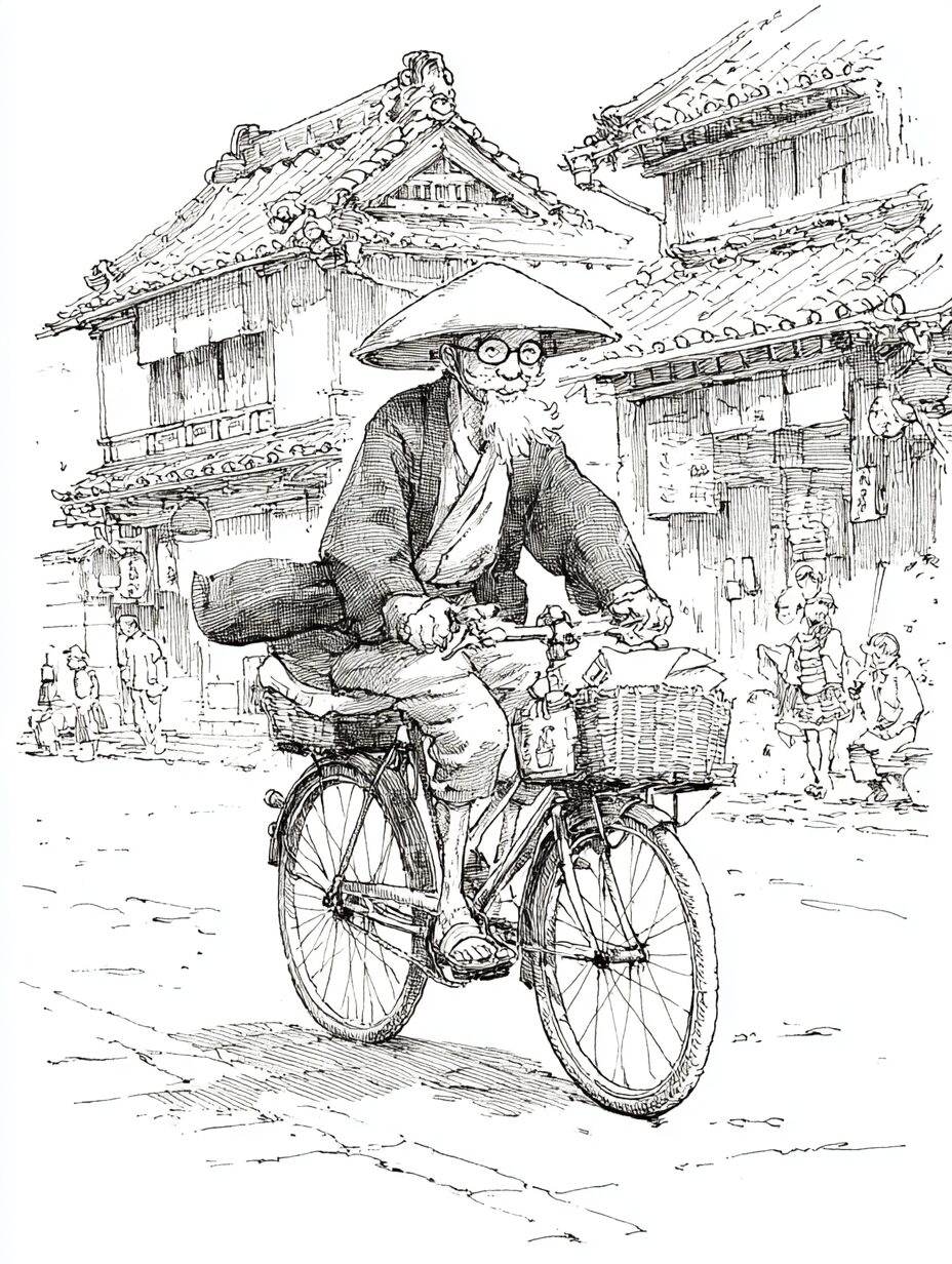 無料塗り絵:レトロなバイクで走るおじいさん(大人の塗り絵)