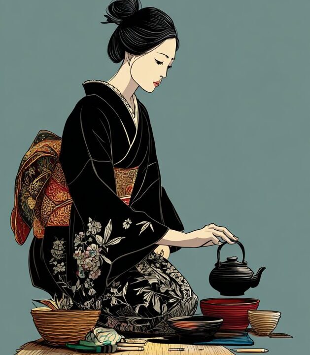 無料塗り絵:茶道をたしなむ女性(大人の塗り絵)