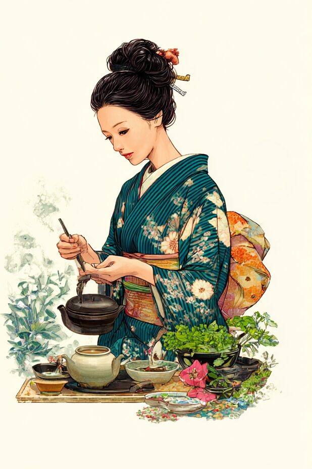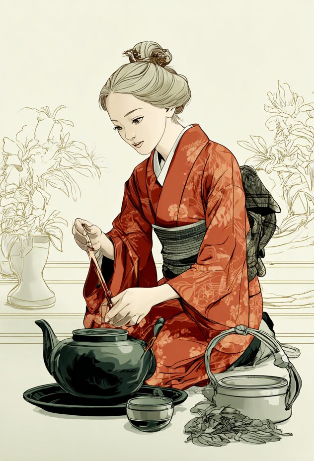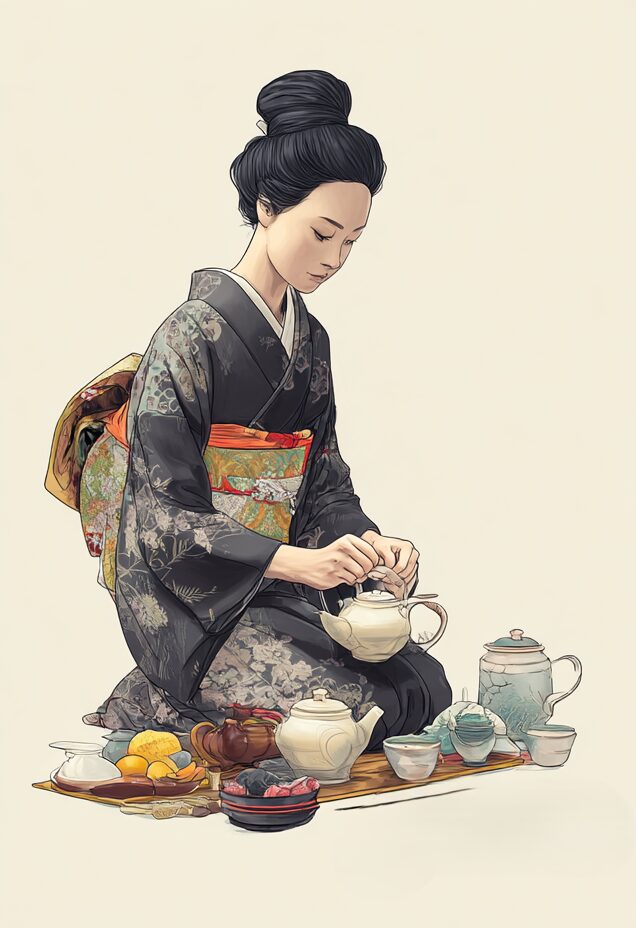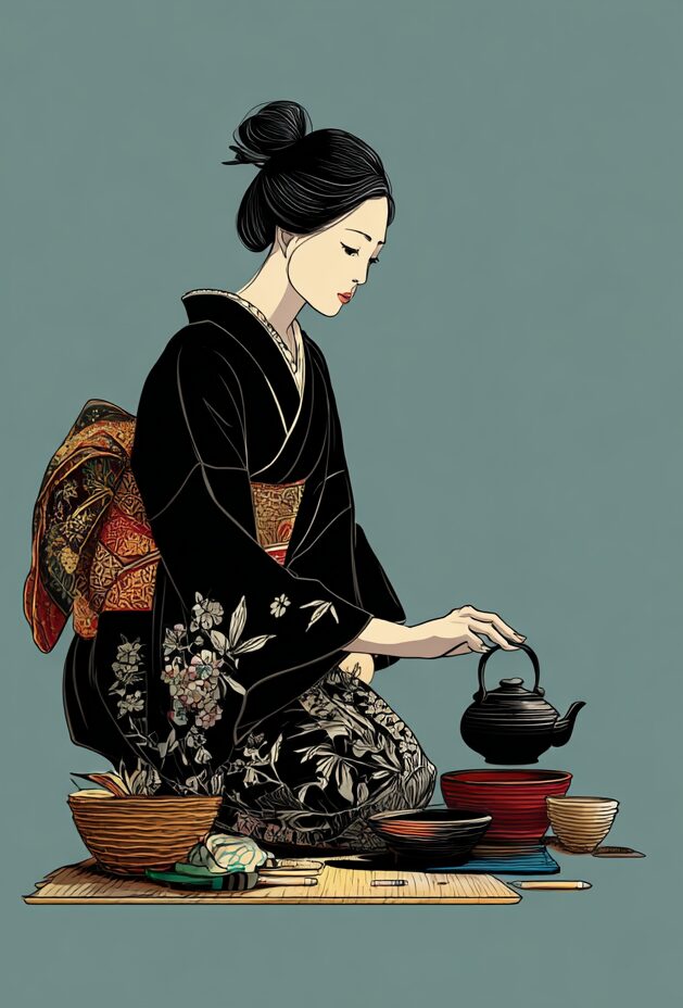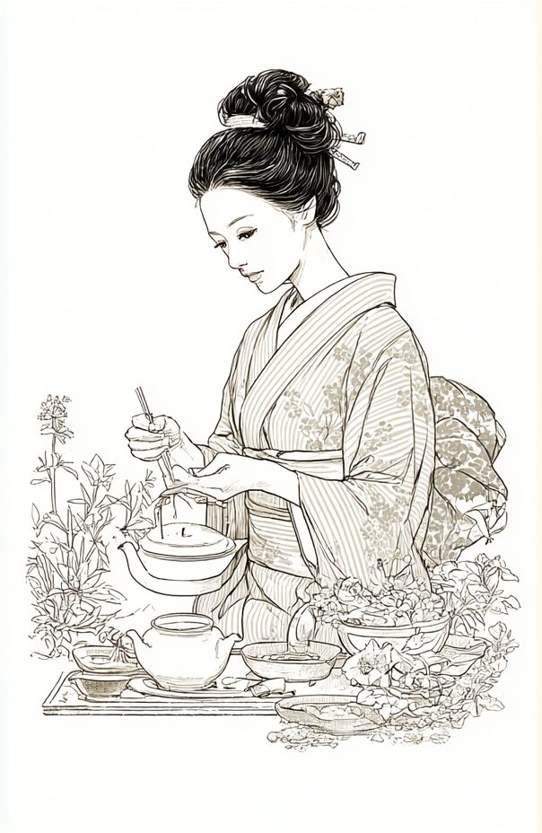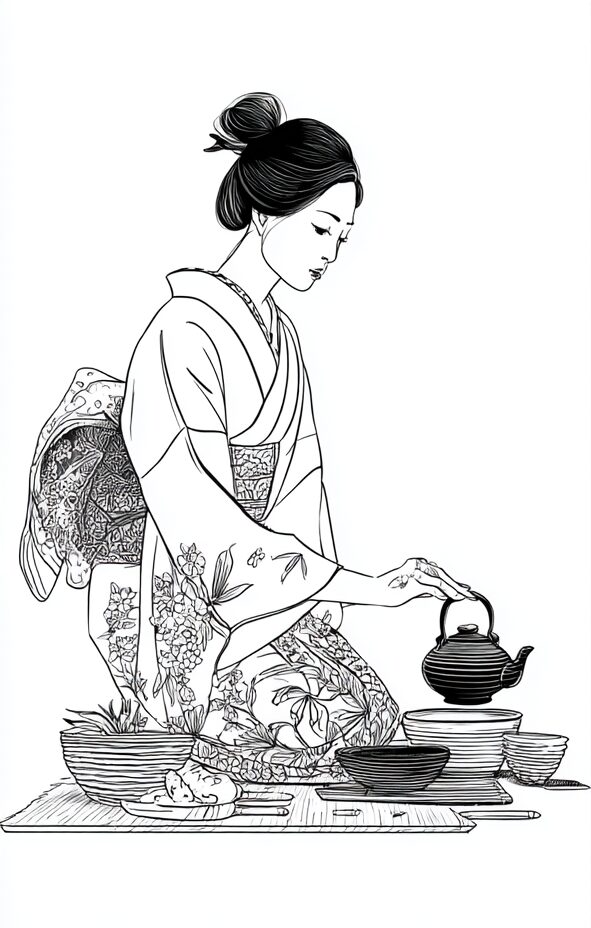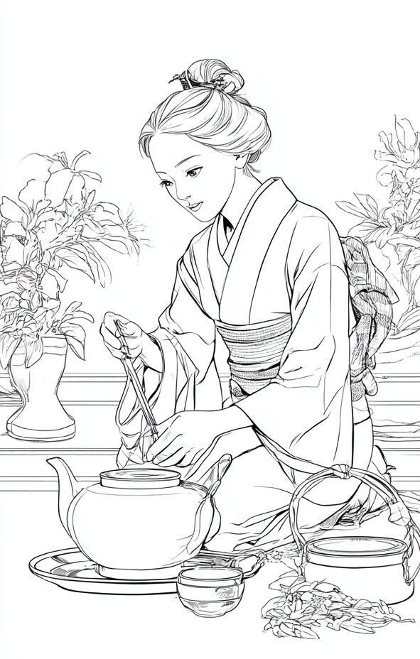無料塗り絵:茶道をたしなむ女性(大人の塗り絵)