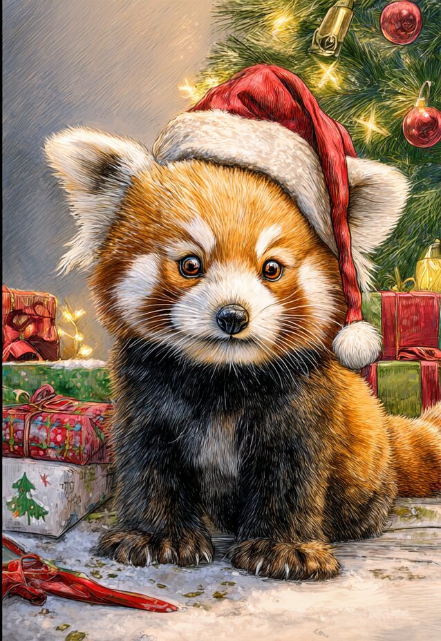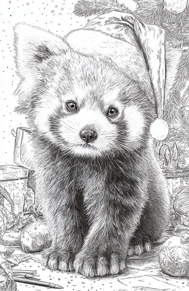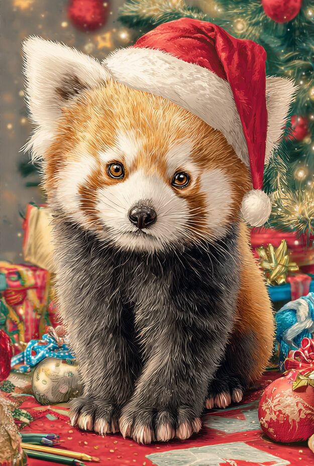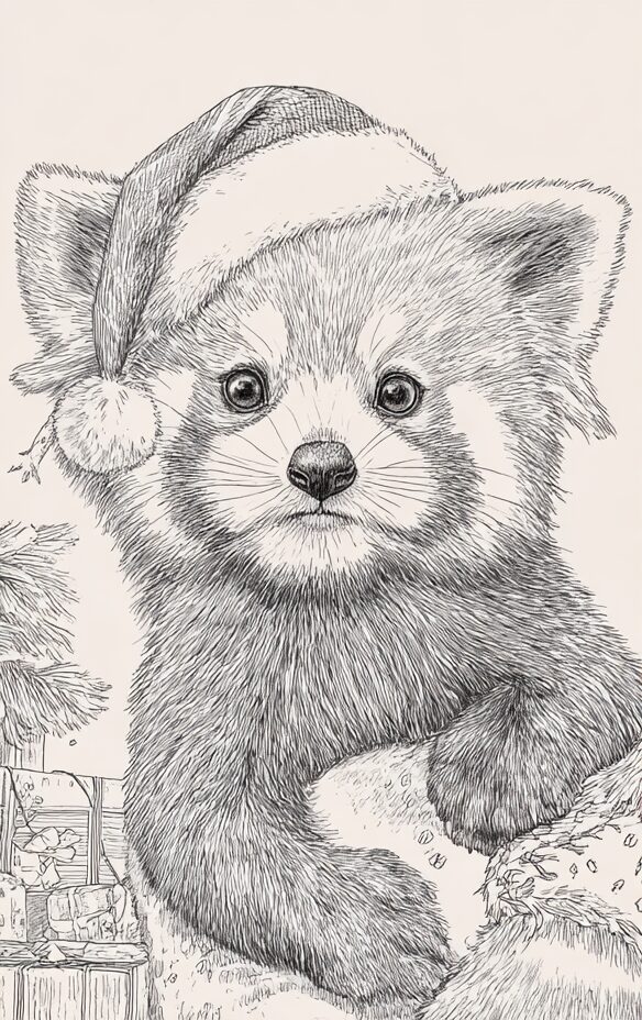 クリスマス衣装のレッサーパンダの塗り絵|無料塗り絵プリント/高齢者用