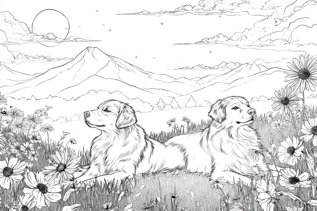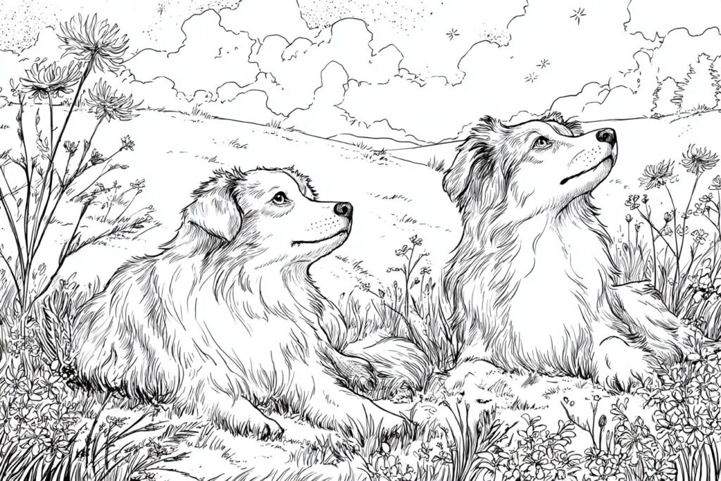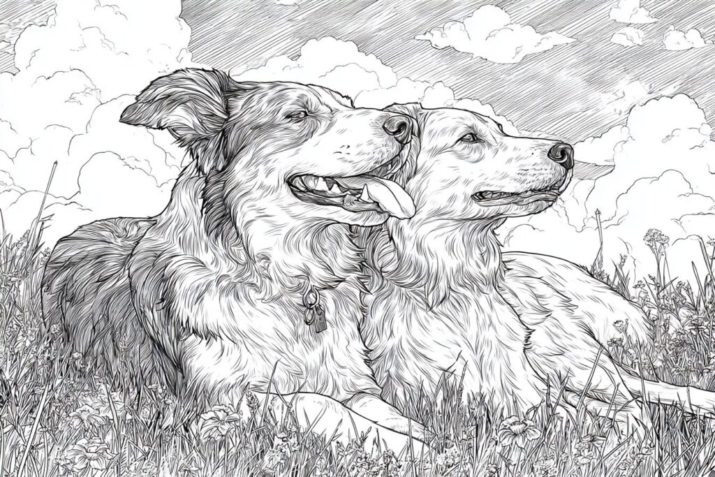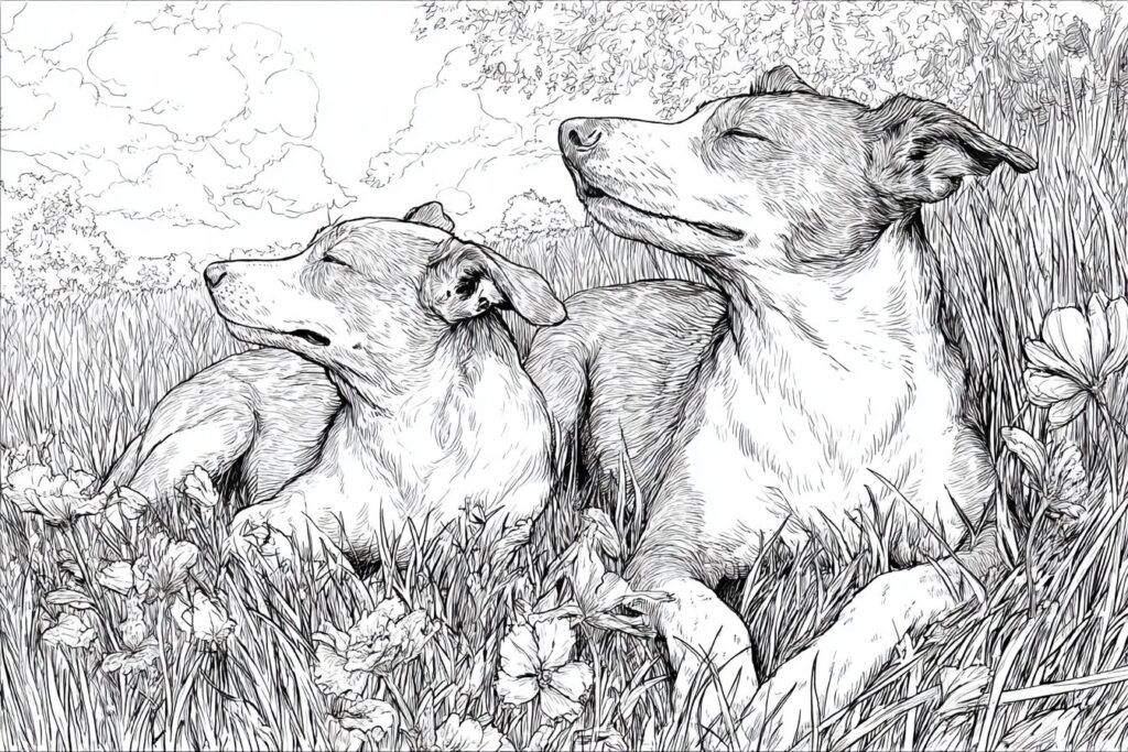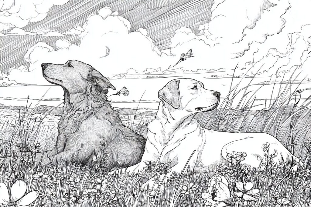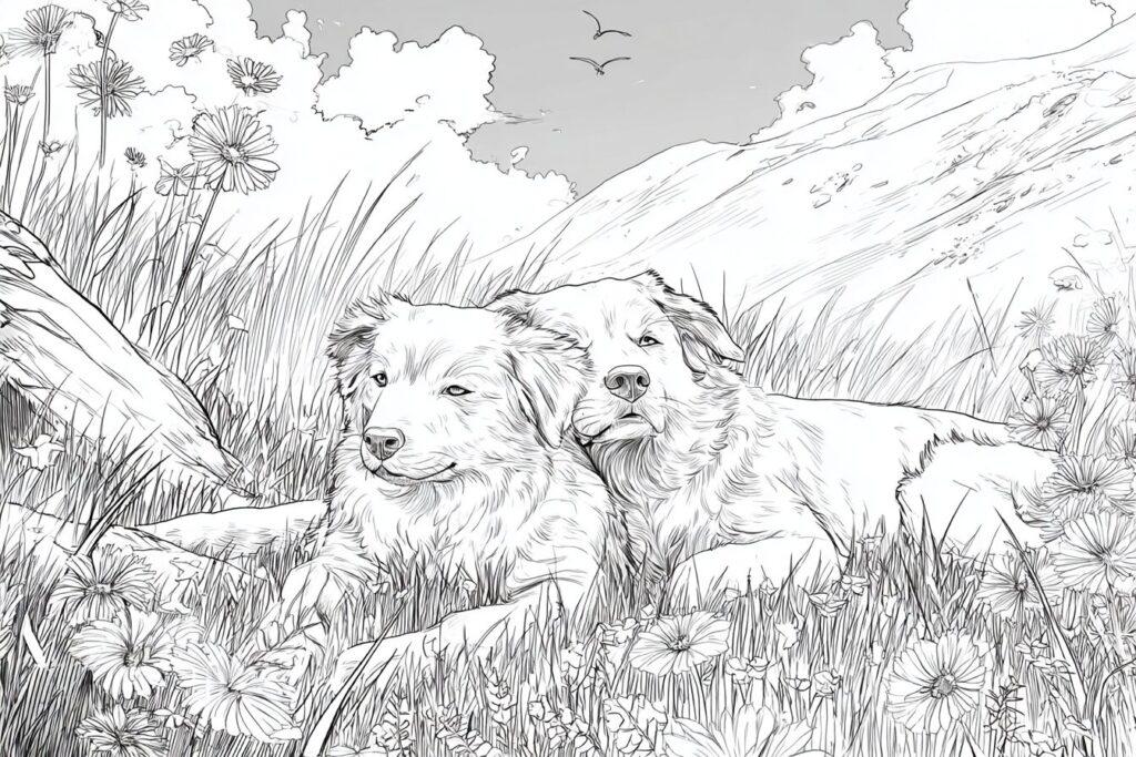 無料塗り絵:牧草地でくつろぐ犬(大人の塗り絵)