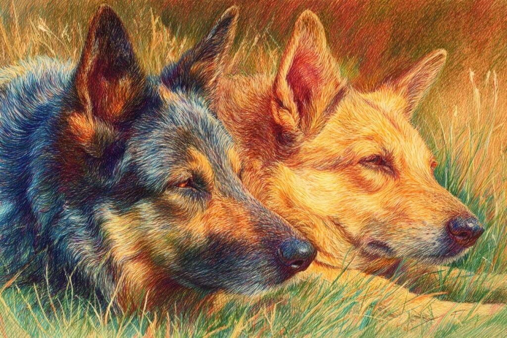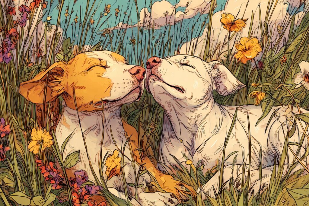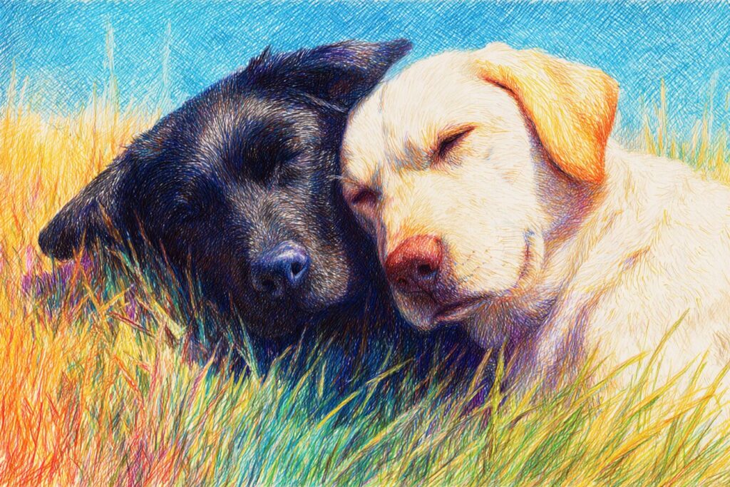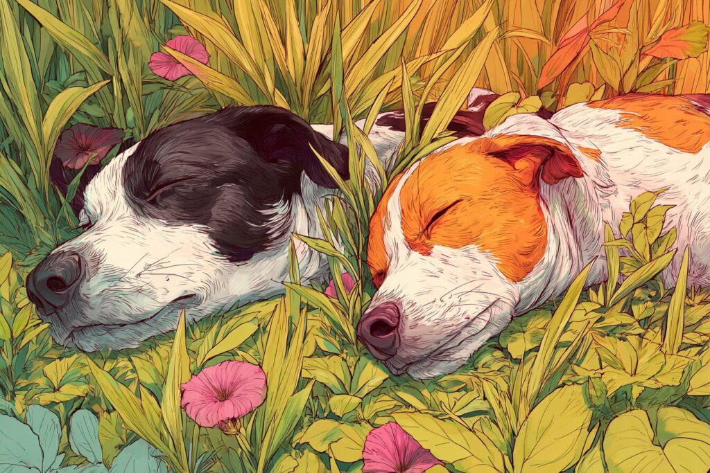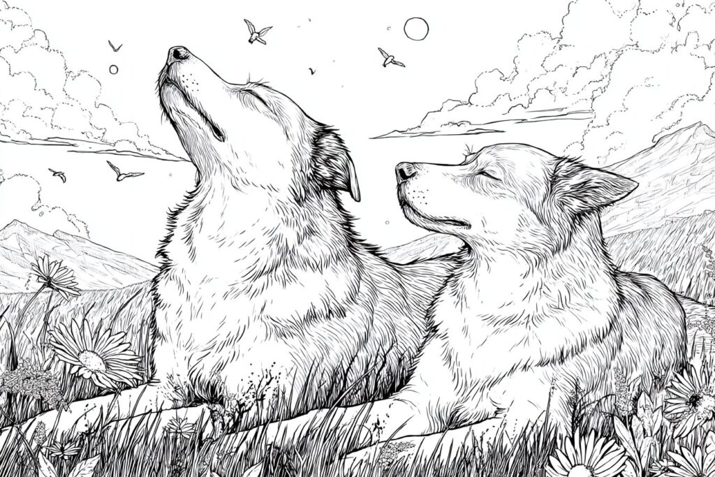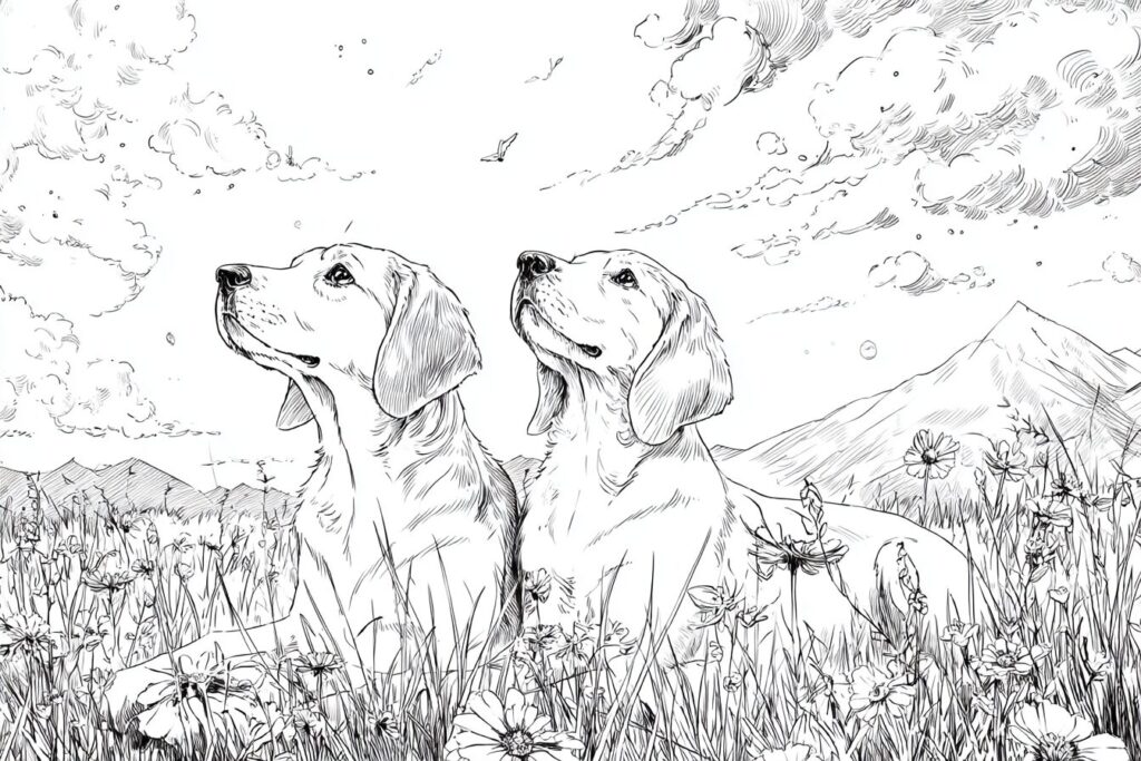 無料塗り絵:牧草地でくつろぐ犬(大人の塗り絵)