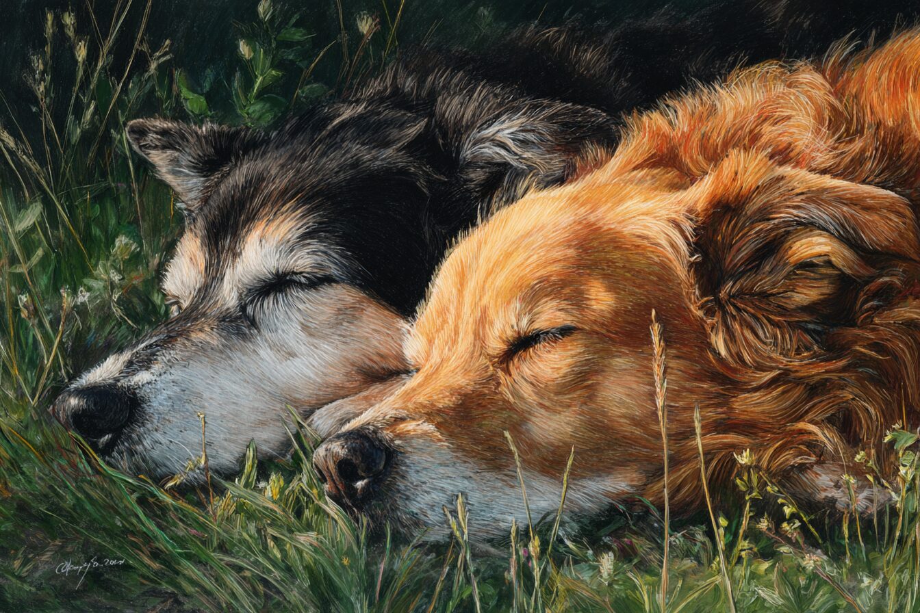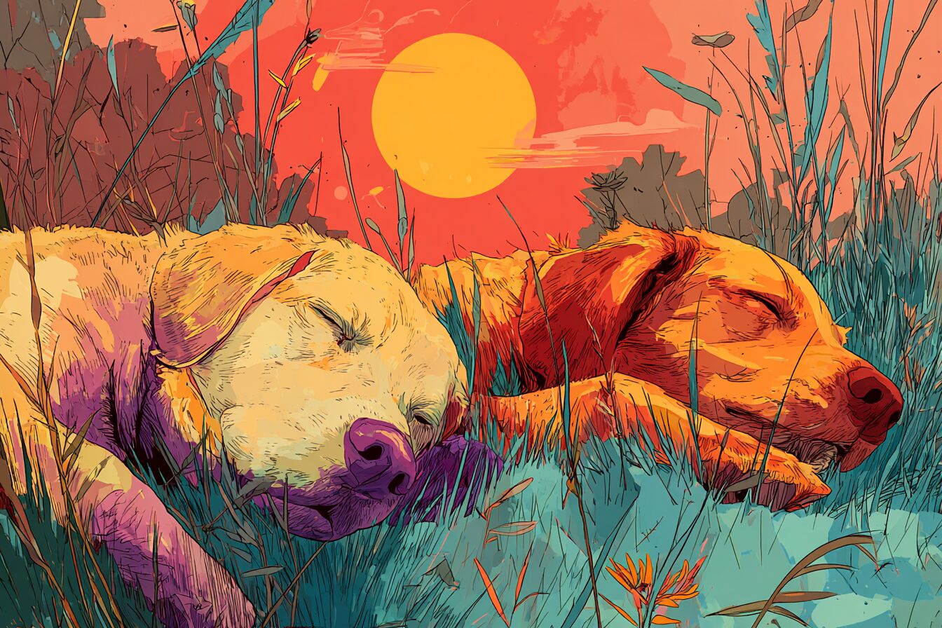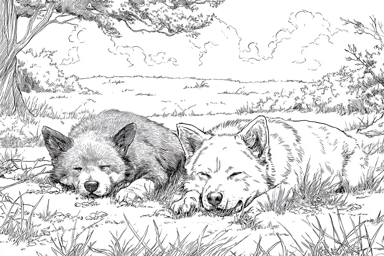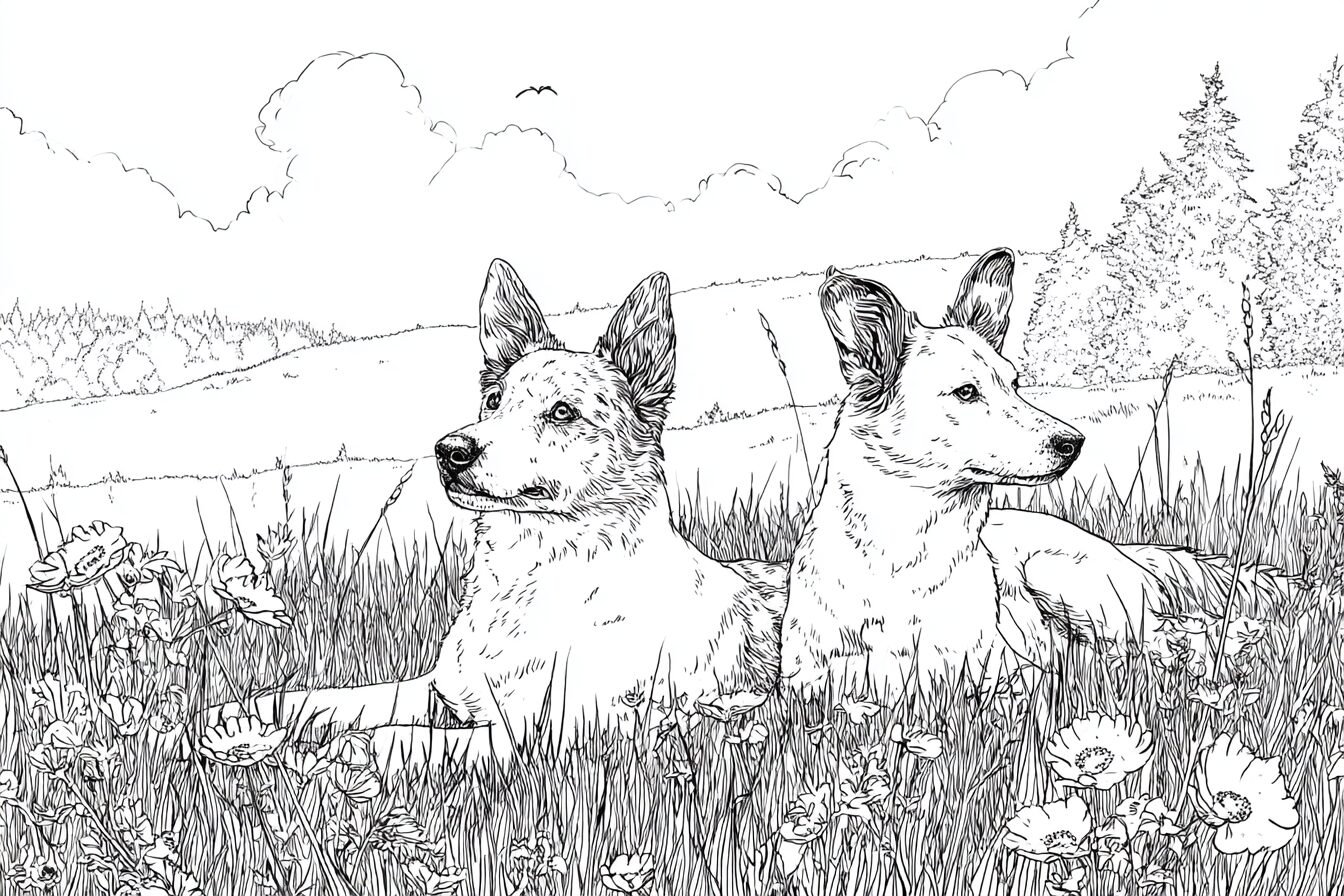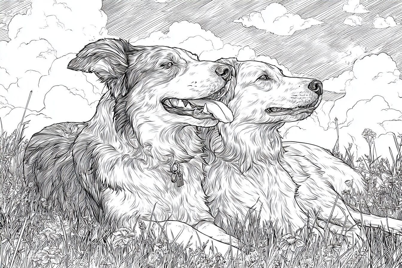 無料塗り絵:牧草地でくつろぐ犬(大人の塗り絵)