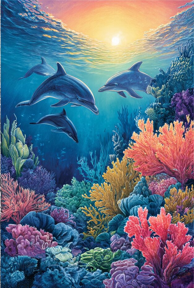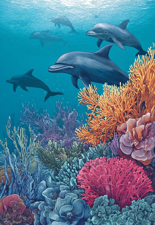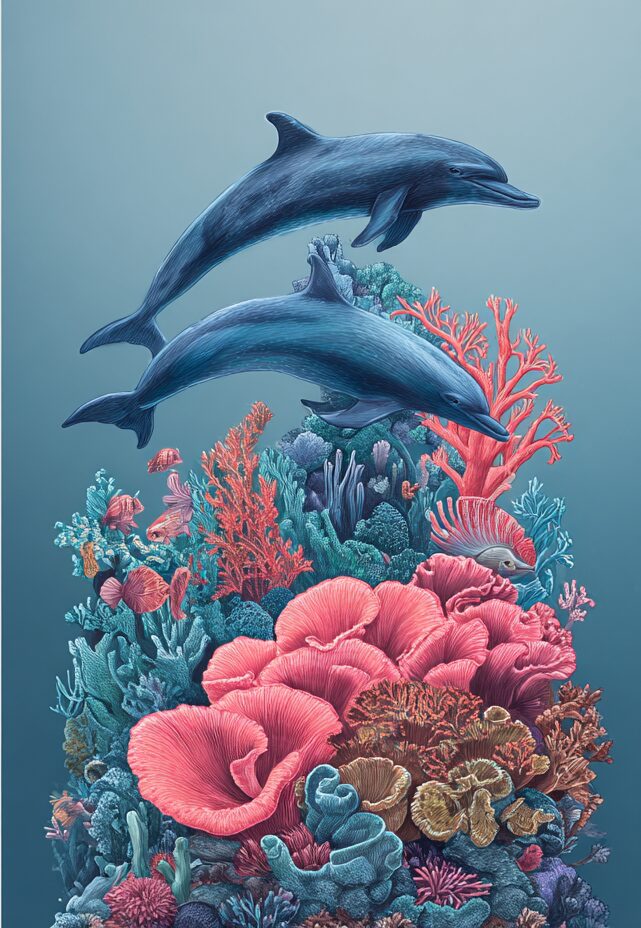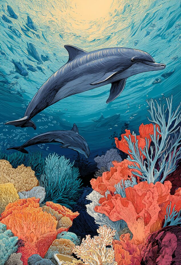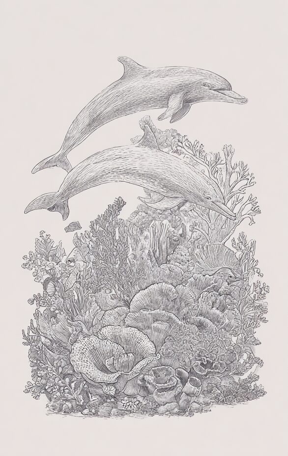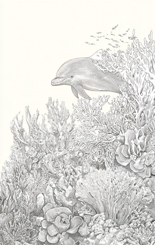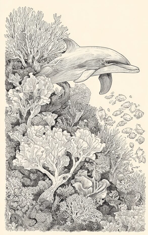 無料塗り絵:サンゴとイルカ(大人の塗り絵)