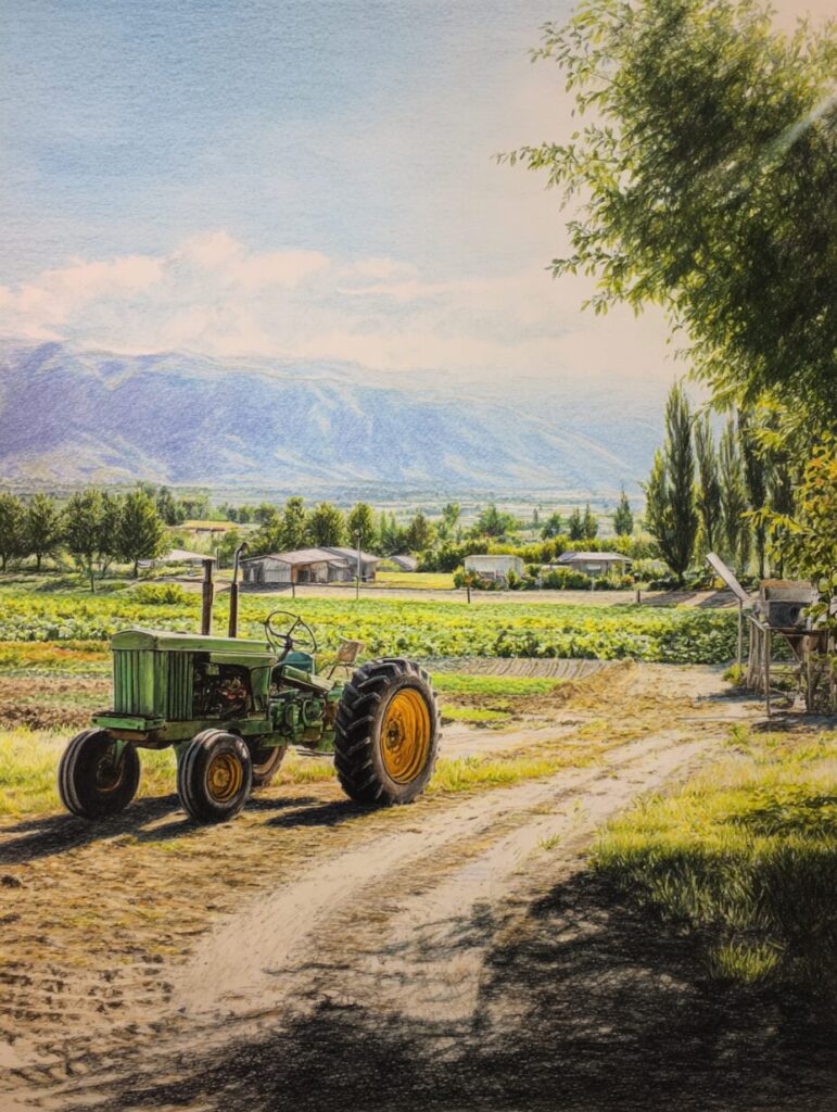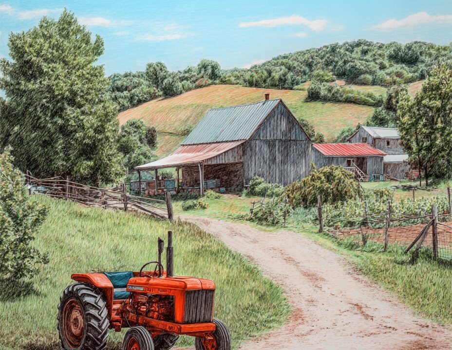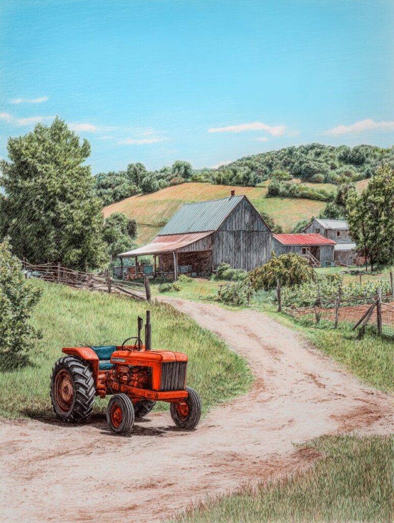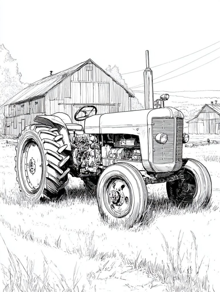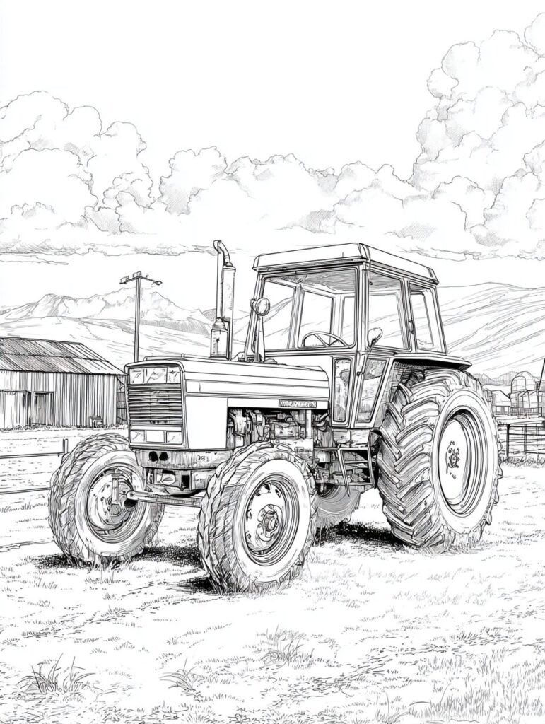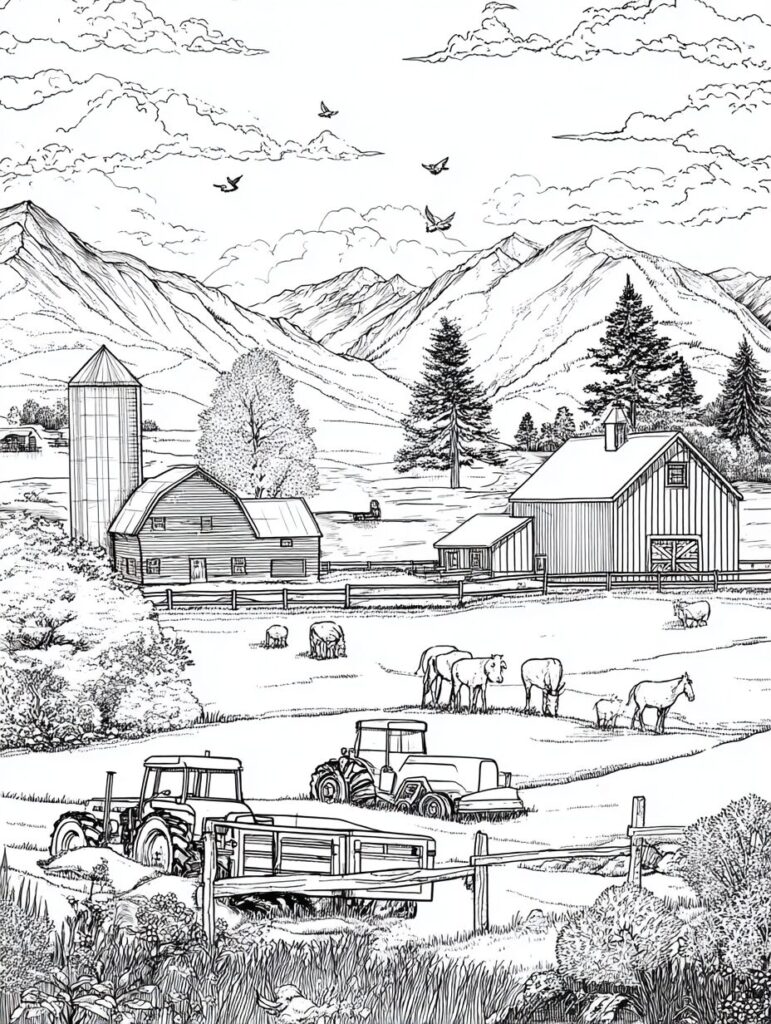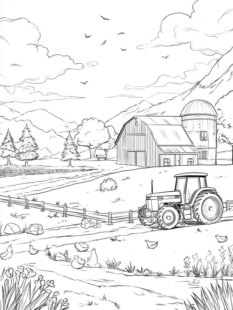 無料塗り絵:農場とトラクターの風景(大人の塗り絵)