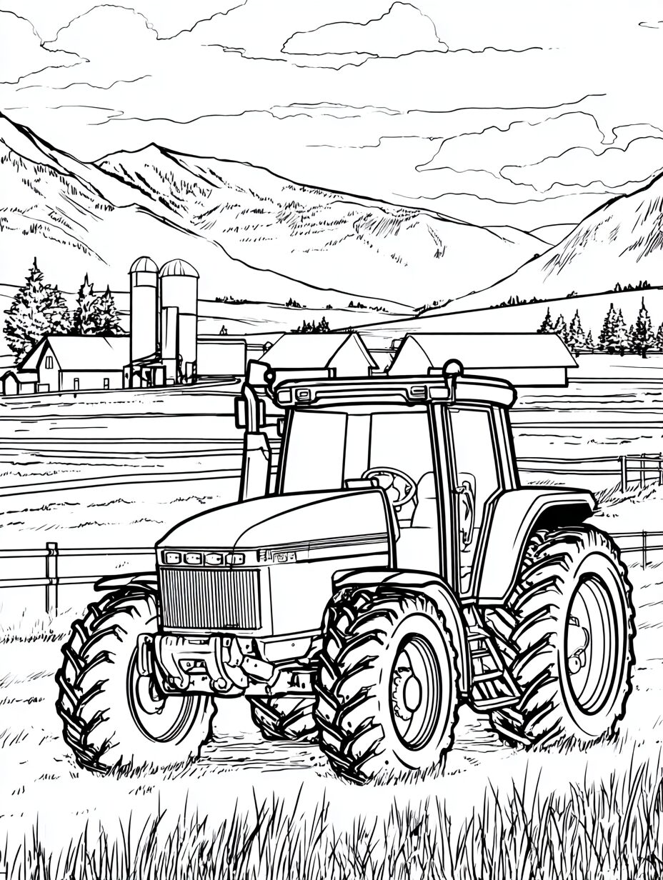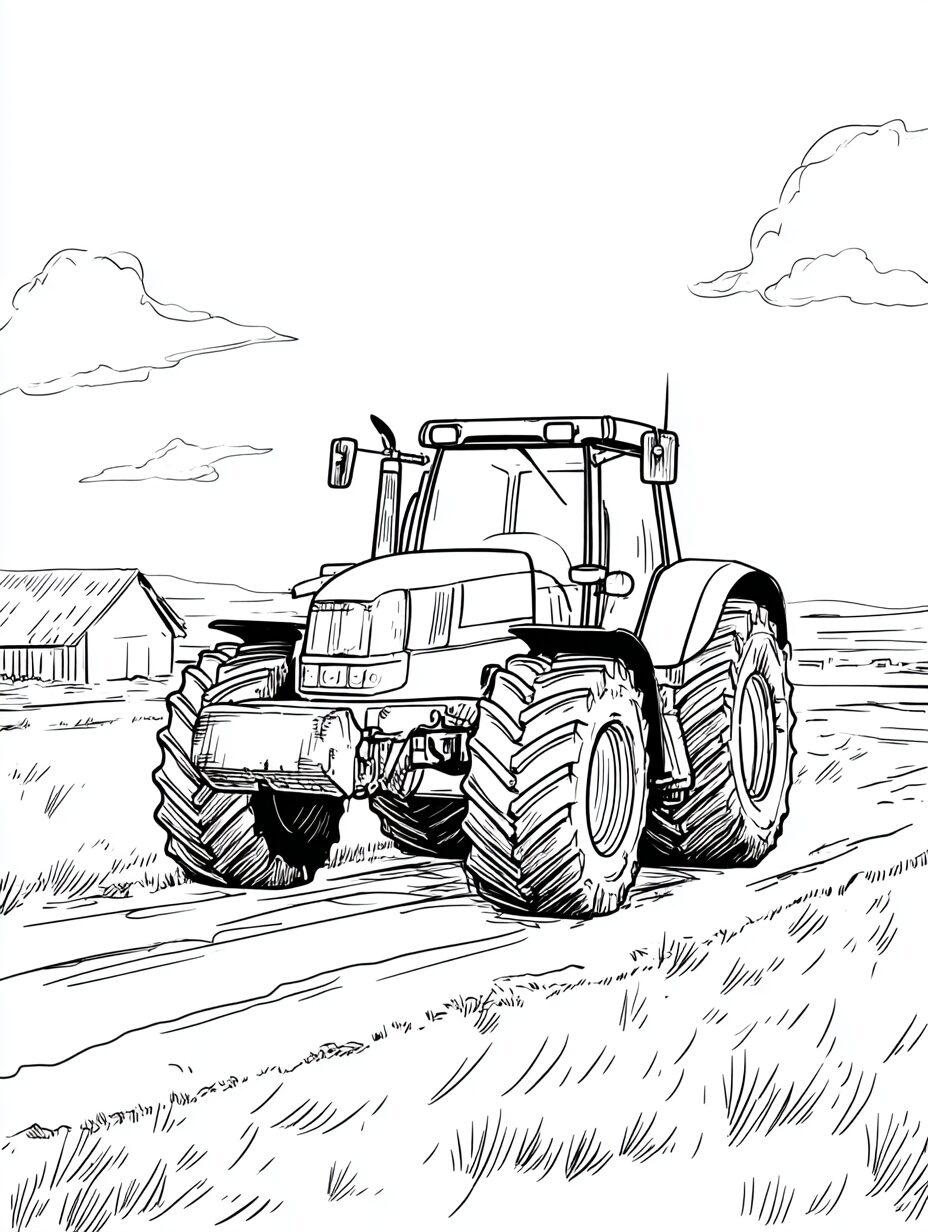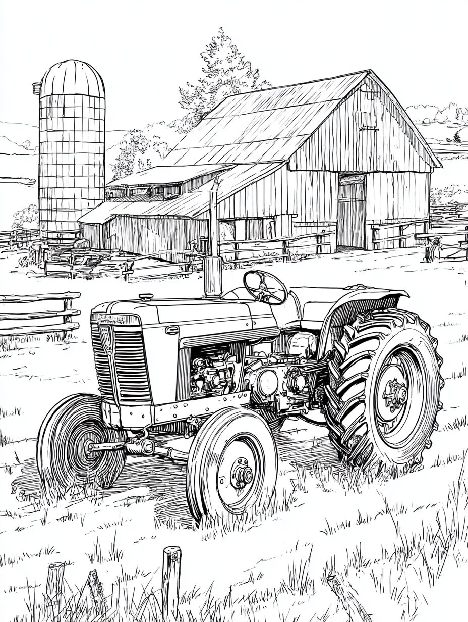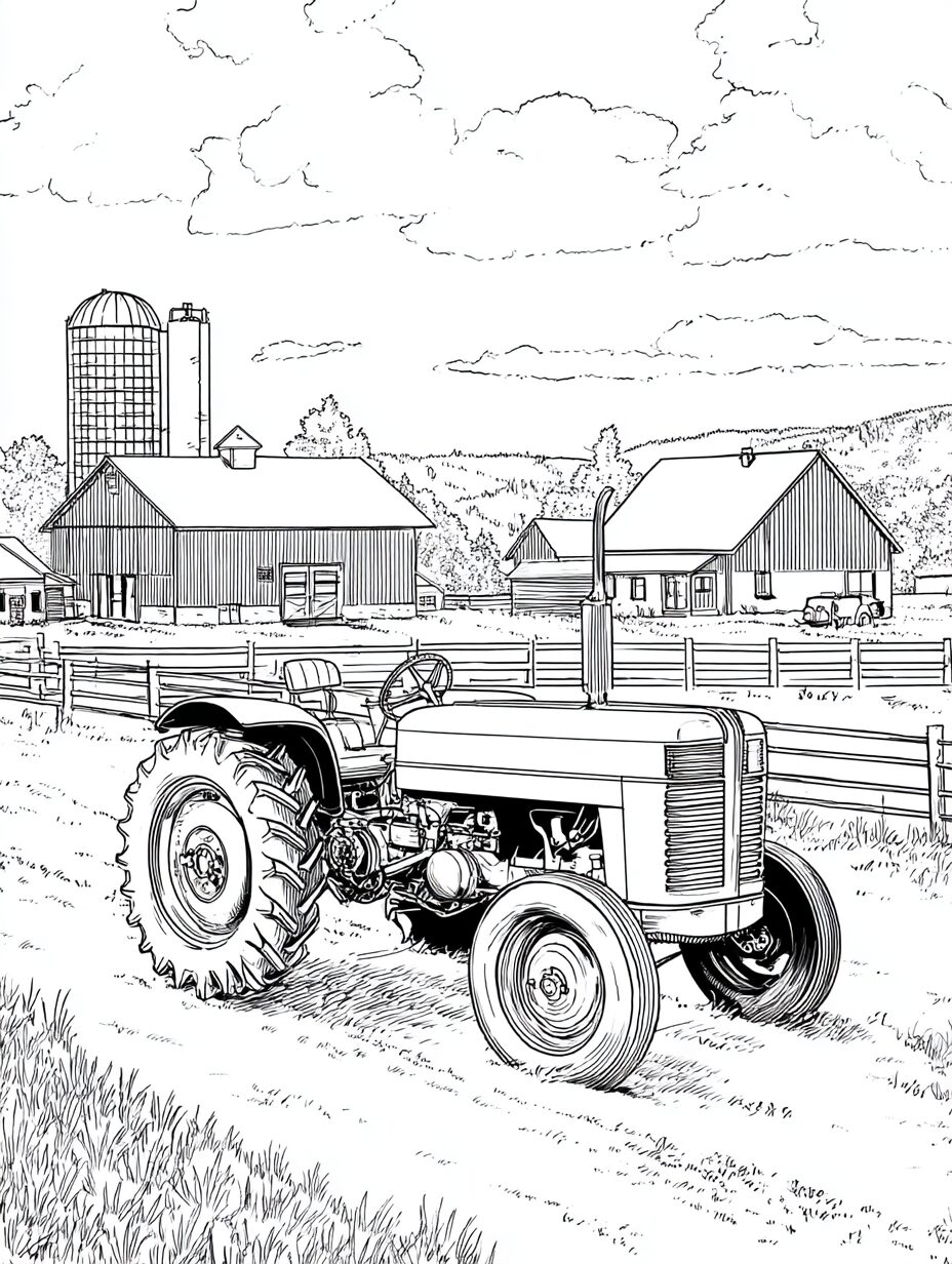 無料塗り絵:農場とトラクターの風景(大人の塗り絵)
