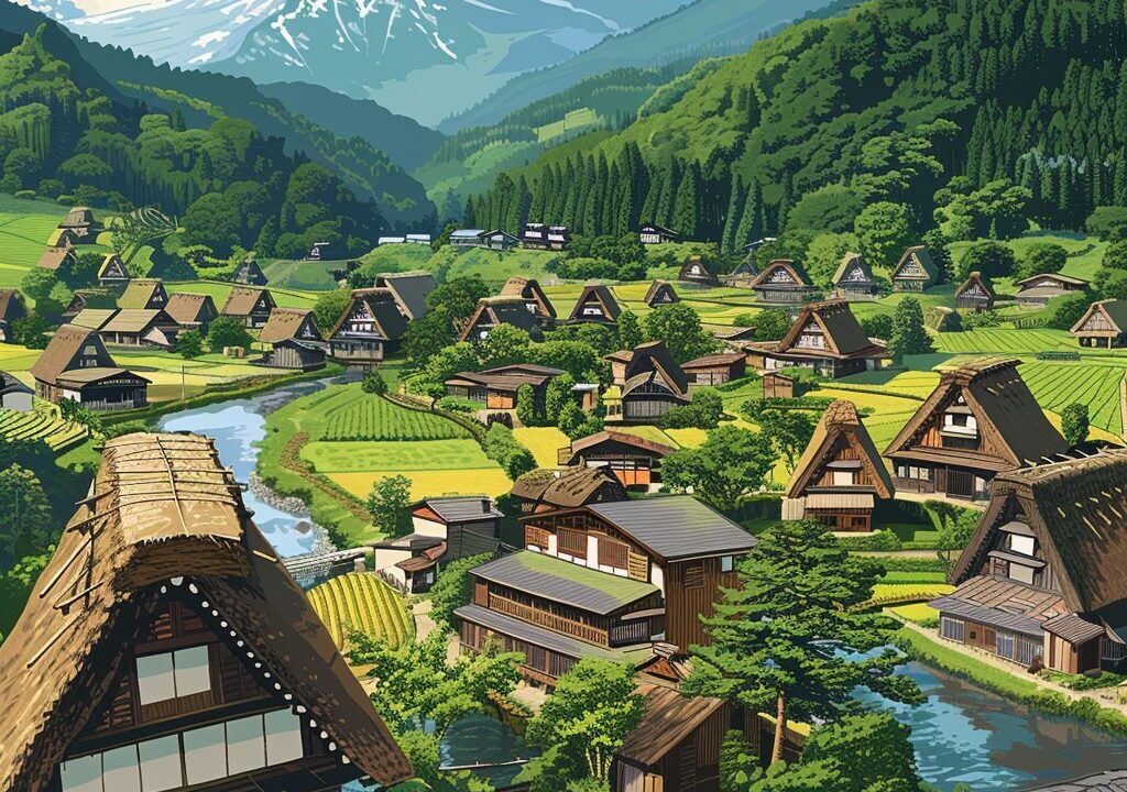 第1問:世界遺産にも登録されている、独特の屋根の形をした家並みが有名な村はどこ?