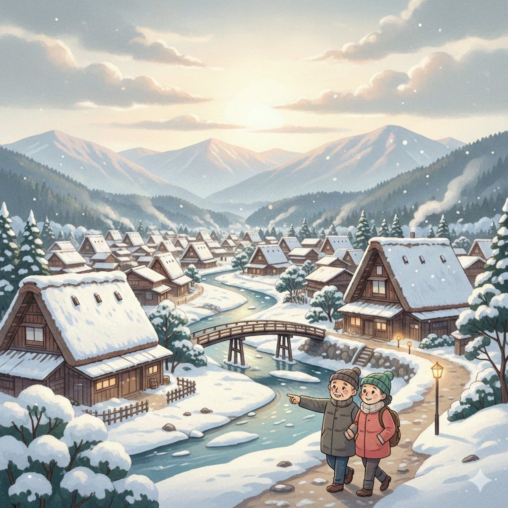 【解説・豆知識】急勾配の茅葺き屋根が、手を合わせているように見えることから「合掌造り」と呼ばれます。雪深い地域ならではの知恵ですね。