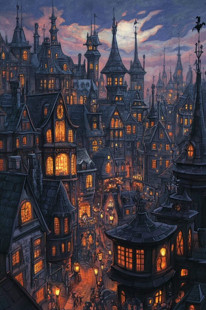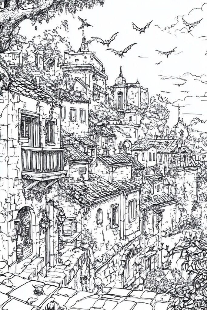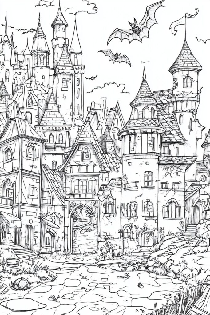 無料塗り絵:ハロウィンの街並み(大人の塗り絵)