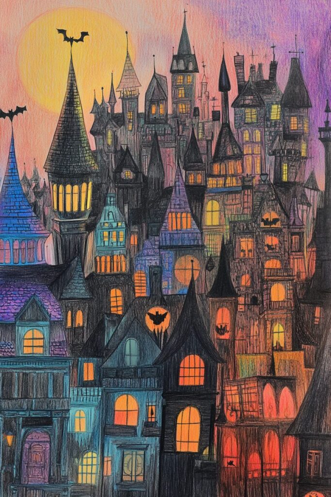 ハロウィンの街並みの塗り絵|無料塗り絵プリント/高齢者用