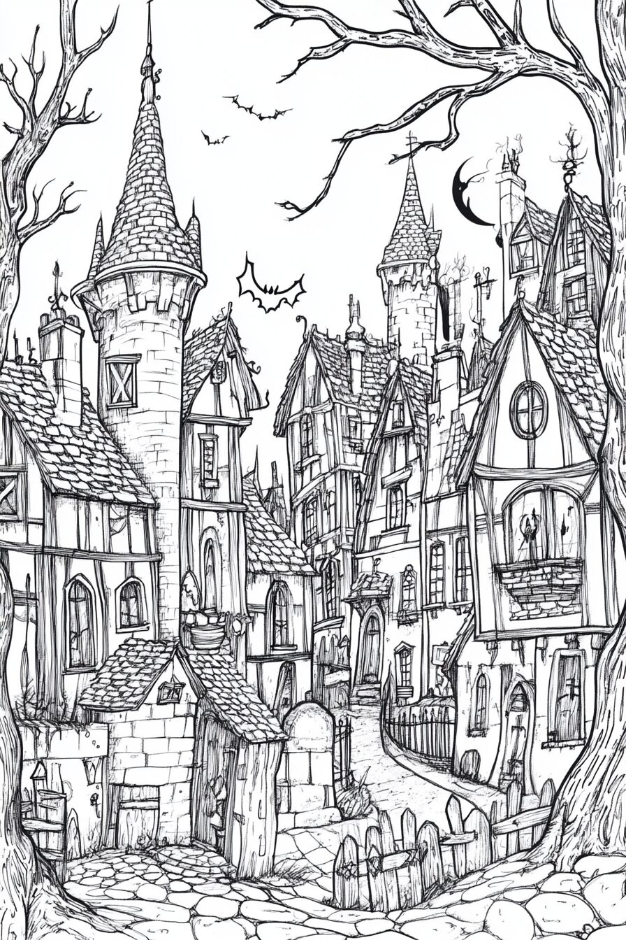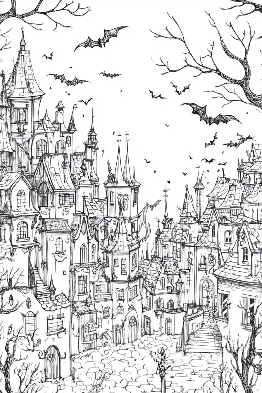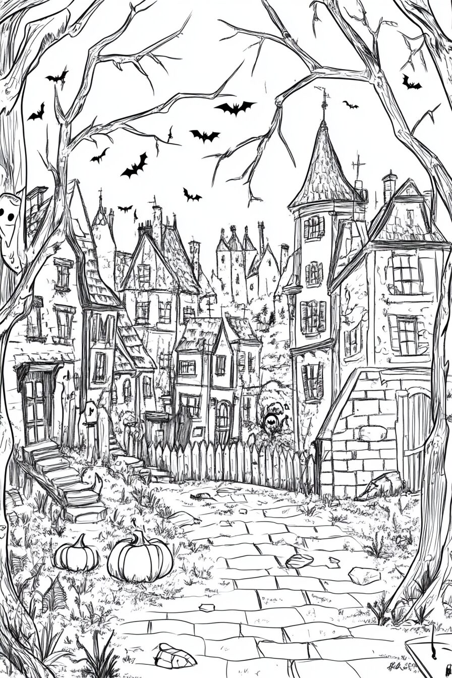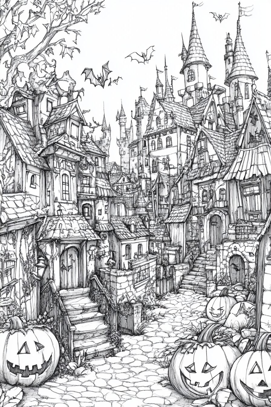 無料塗り絵:ハロウィンの街並み(大人の塗り絵)