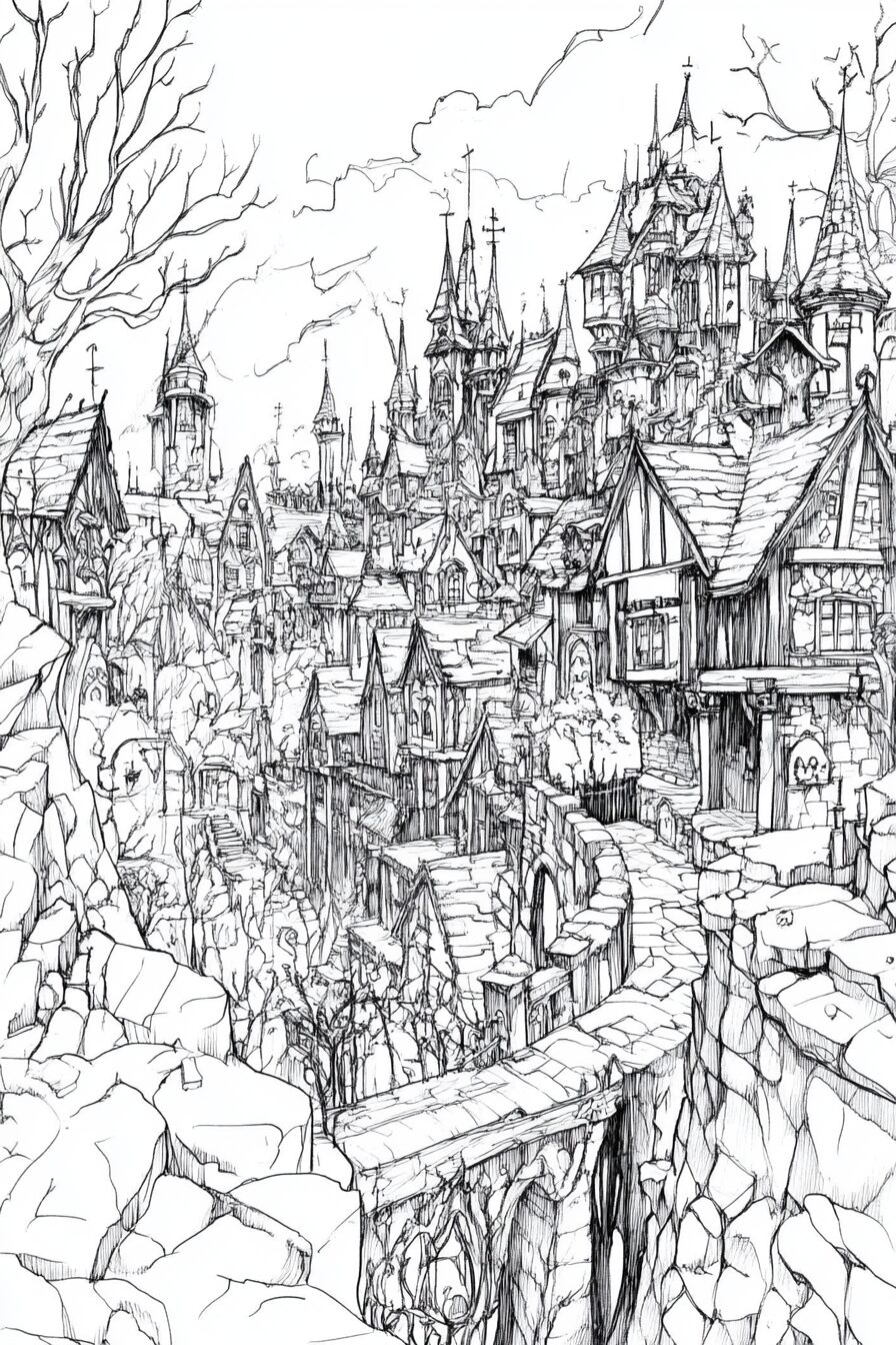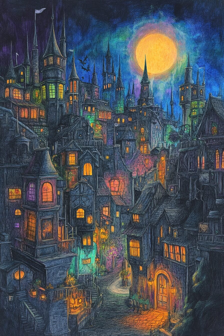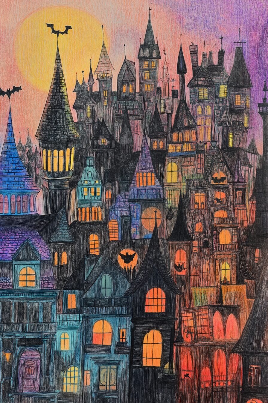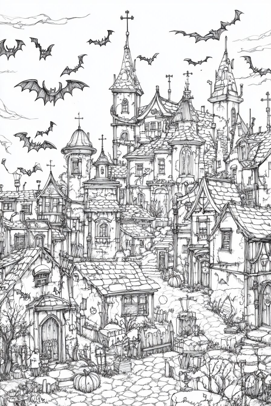 無料塗り絵:ハロウィンの街並み(大人の塗り絵)