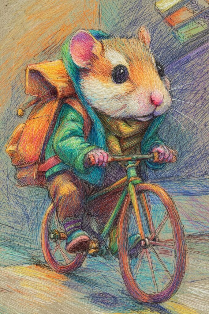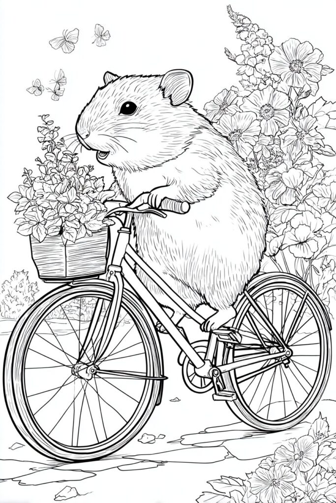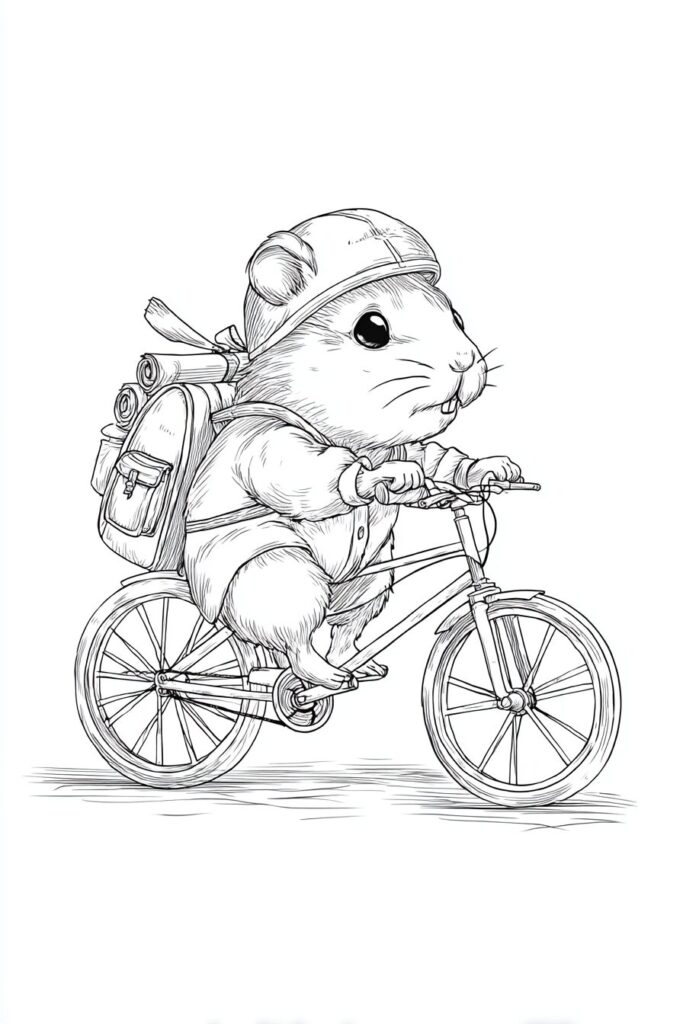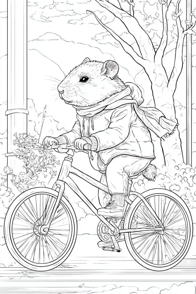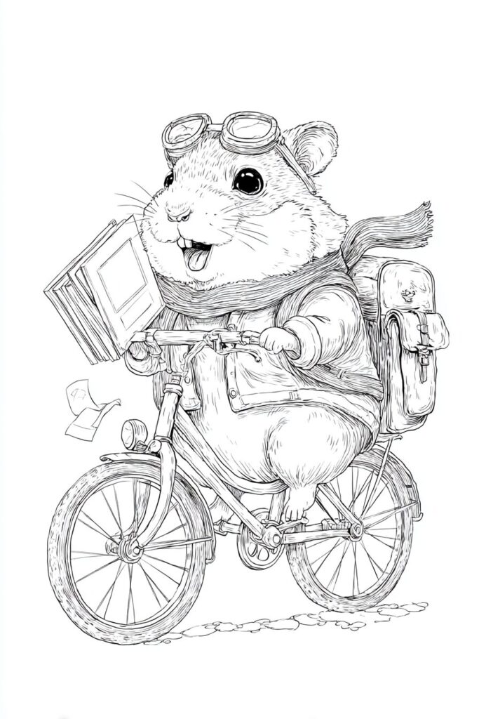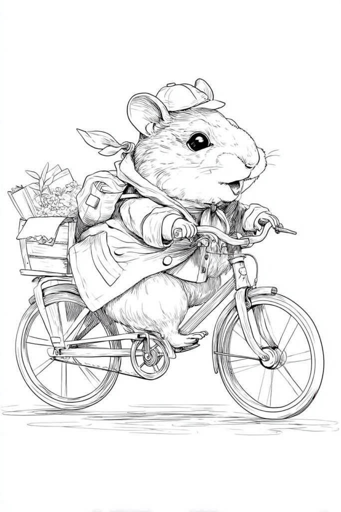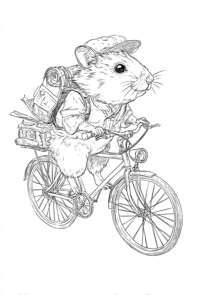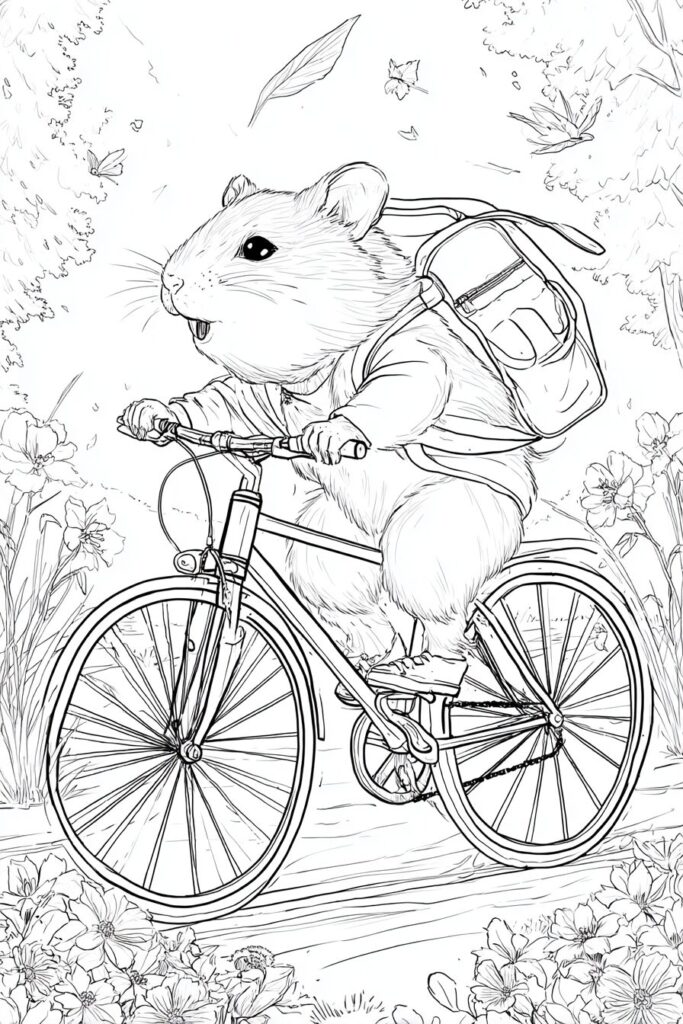 無料塗り絵:自転車に乗るハムスター(大人の塗り絵)