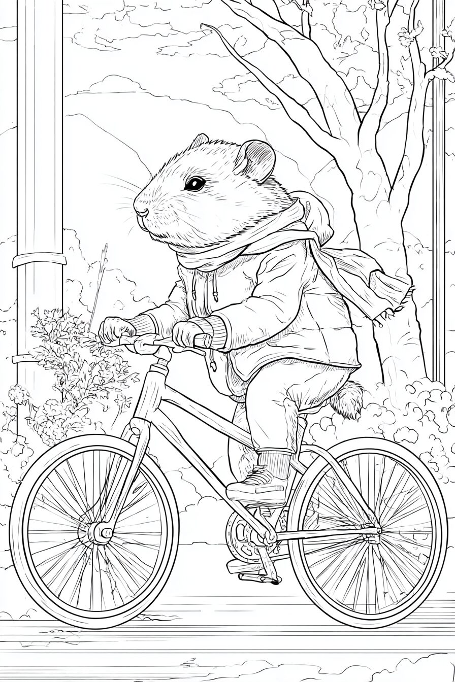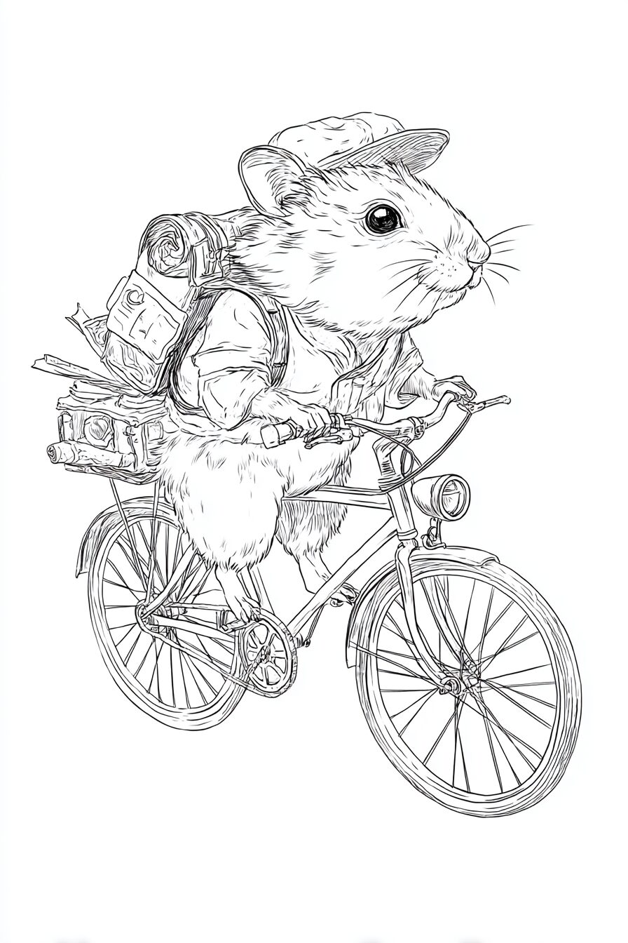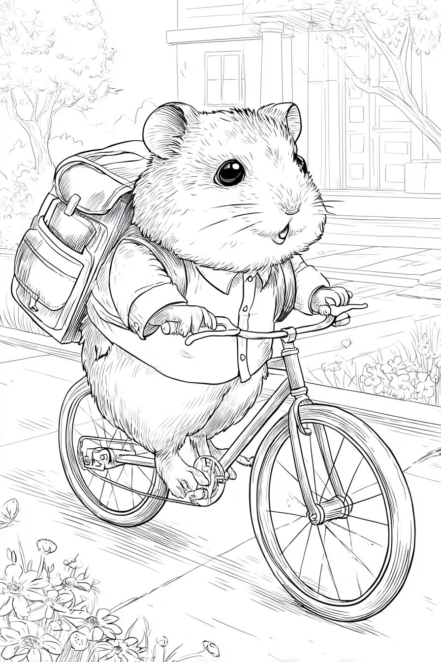 無料塗り絵:自転車に乗るハムスター(大人の塗り絵)