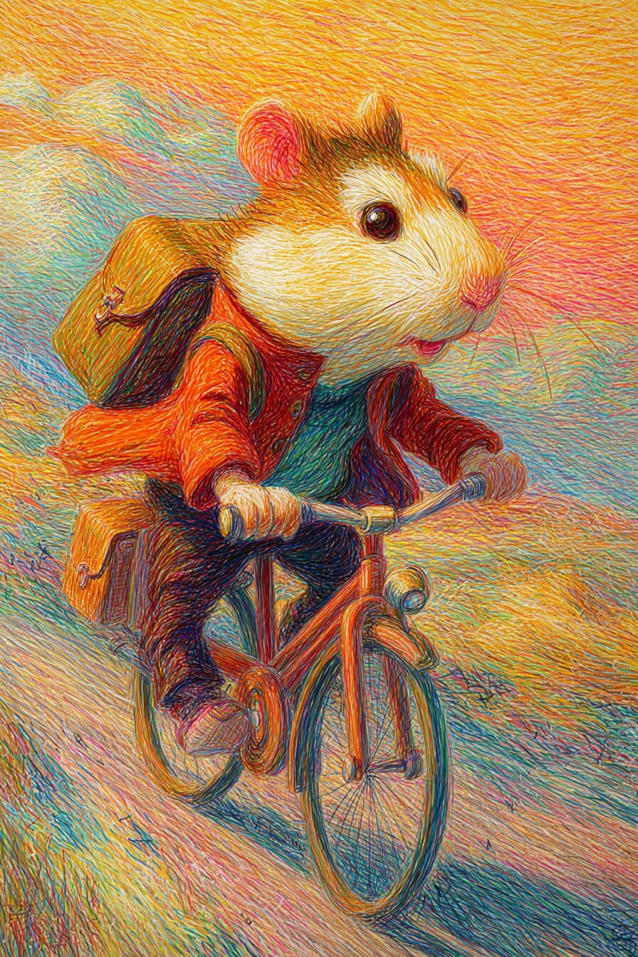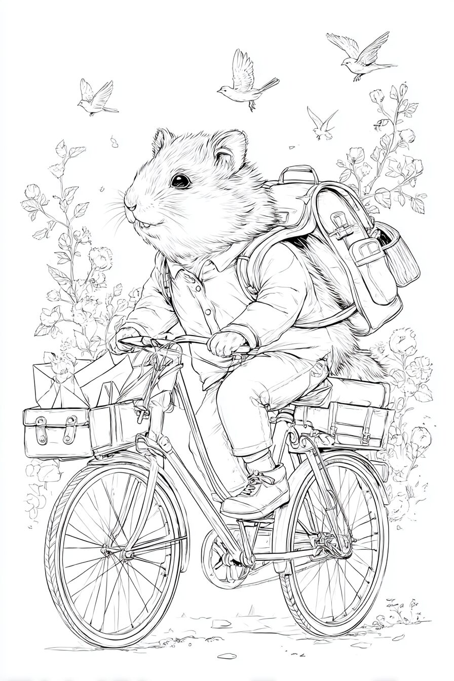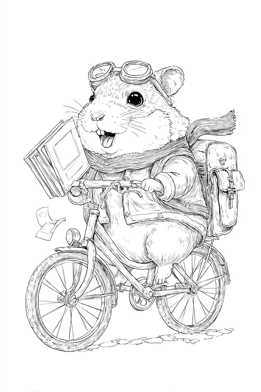 無料塗り絵:自転車に乗るハムスター(大人の塗り絵)