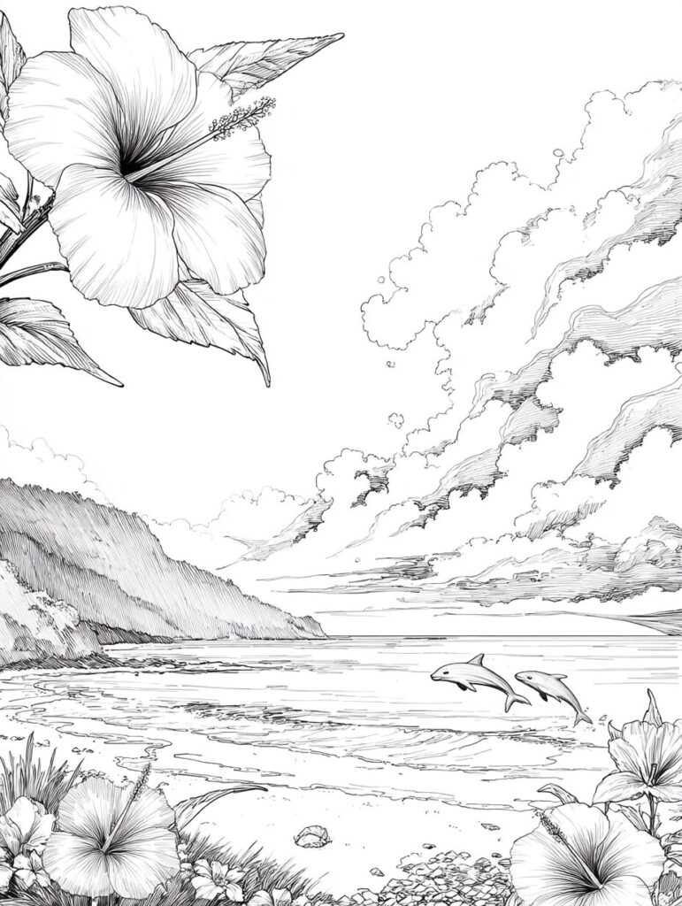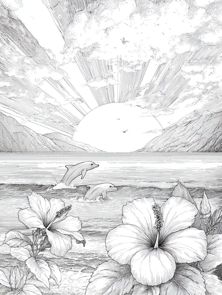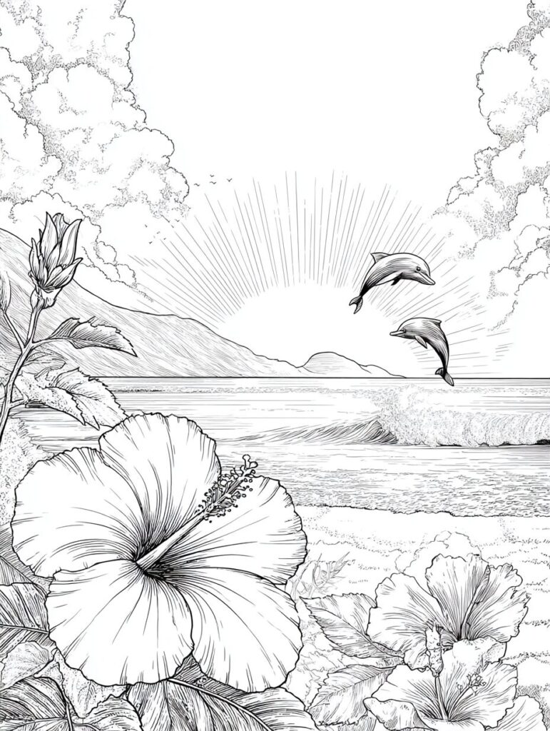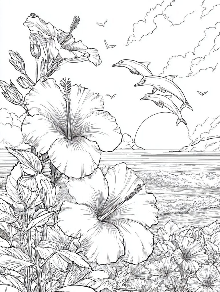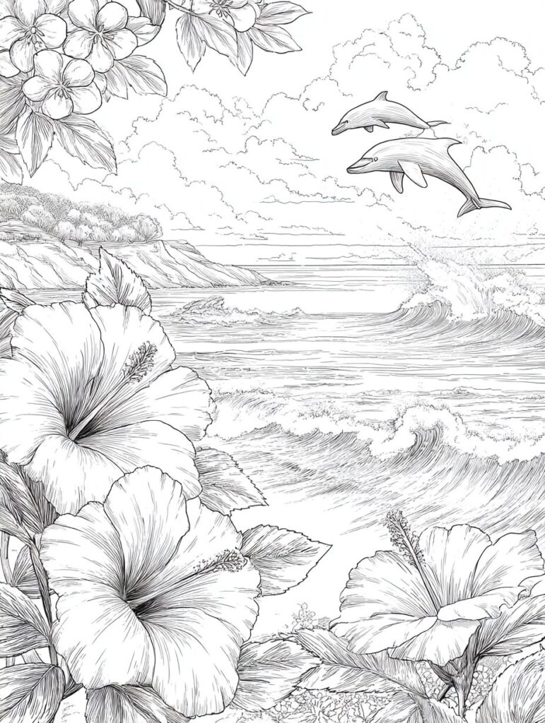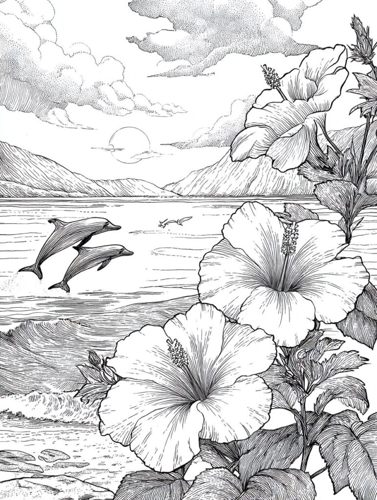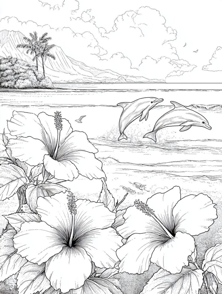 無料塗り絵:ハイビスカスとイルカの風景(大人の塗り絵)