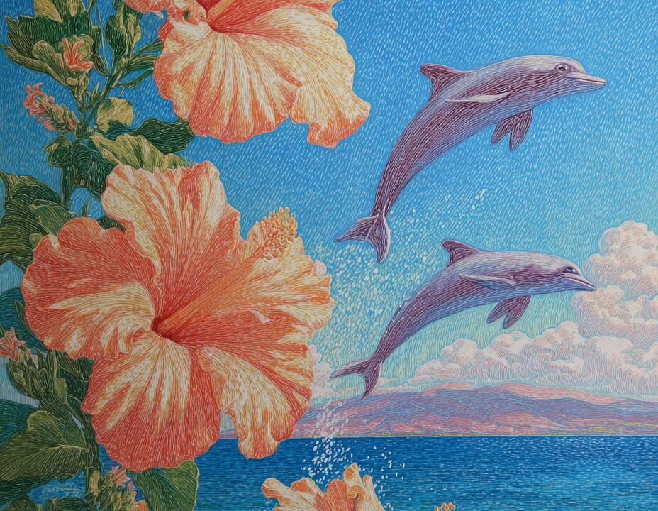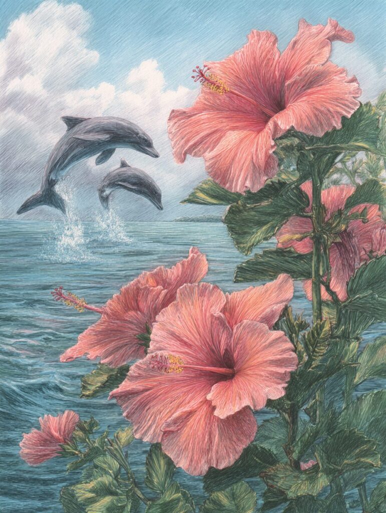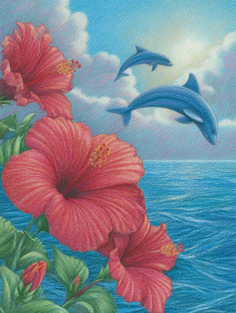 ハイビスカスとイルカの風景塗り絵|無料塗り絵プリント/高齢者用