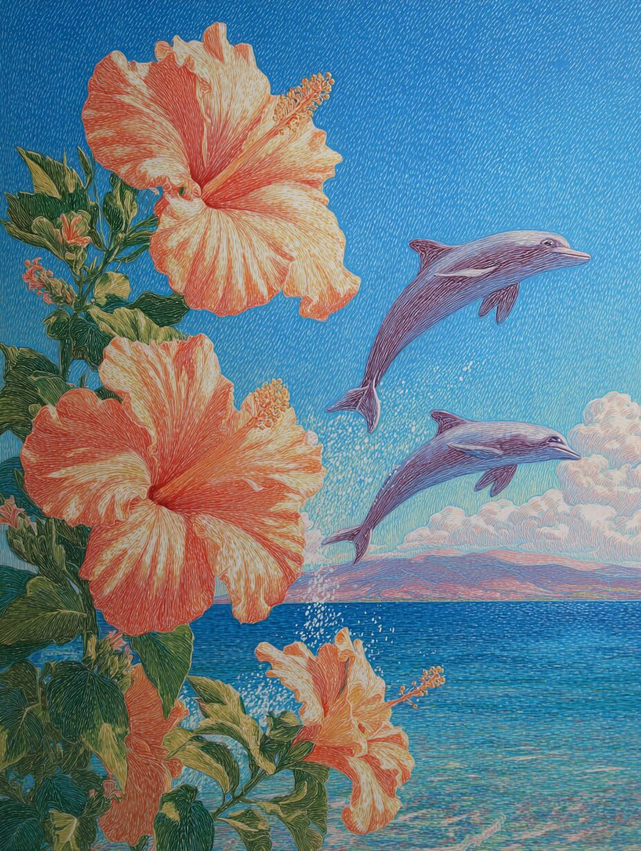 無料塗り絵:ハイビスカスとイルカの風景(大人の塗り絵)