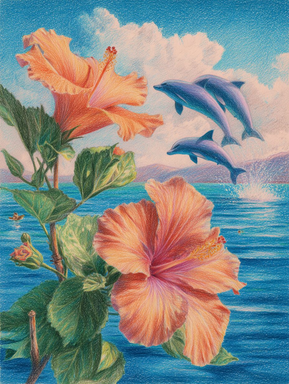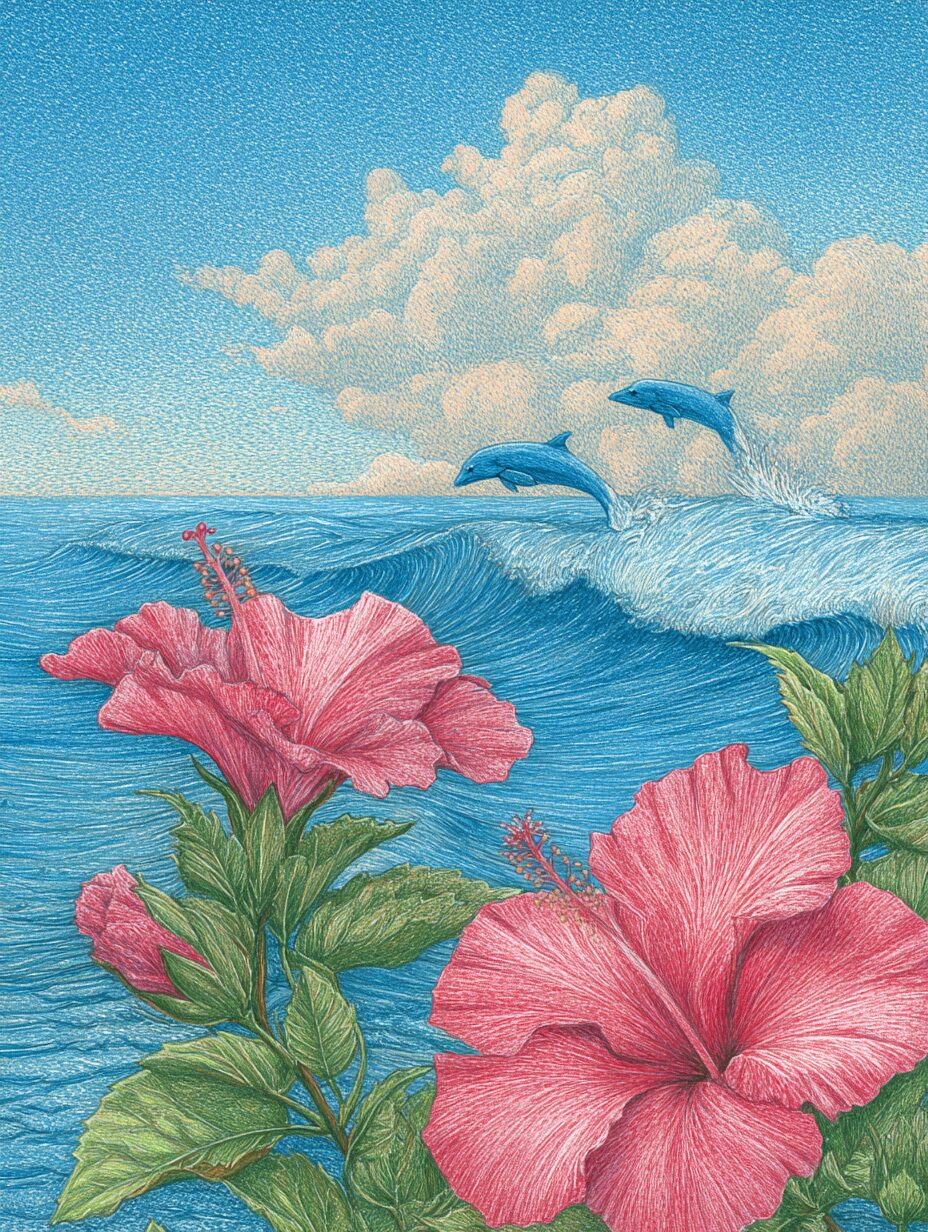 ハイビスカスとイルカの風景塗り絵|無料塗り絵プリント/高齢者用