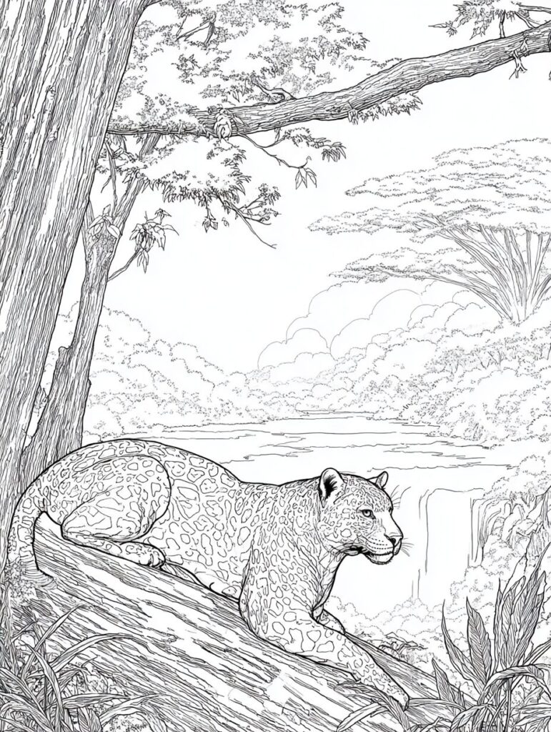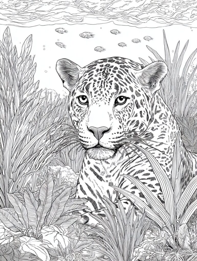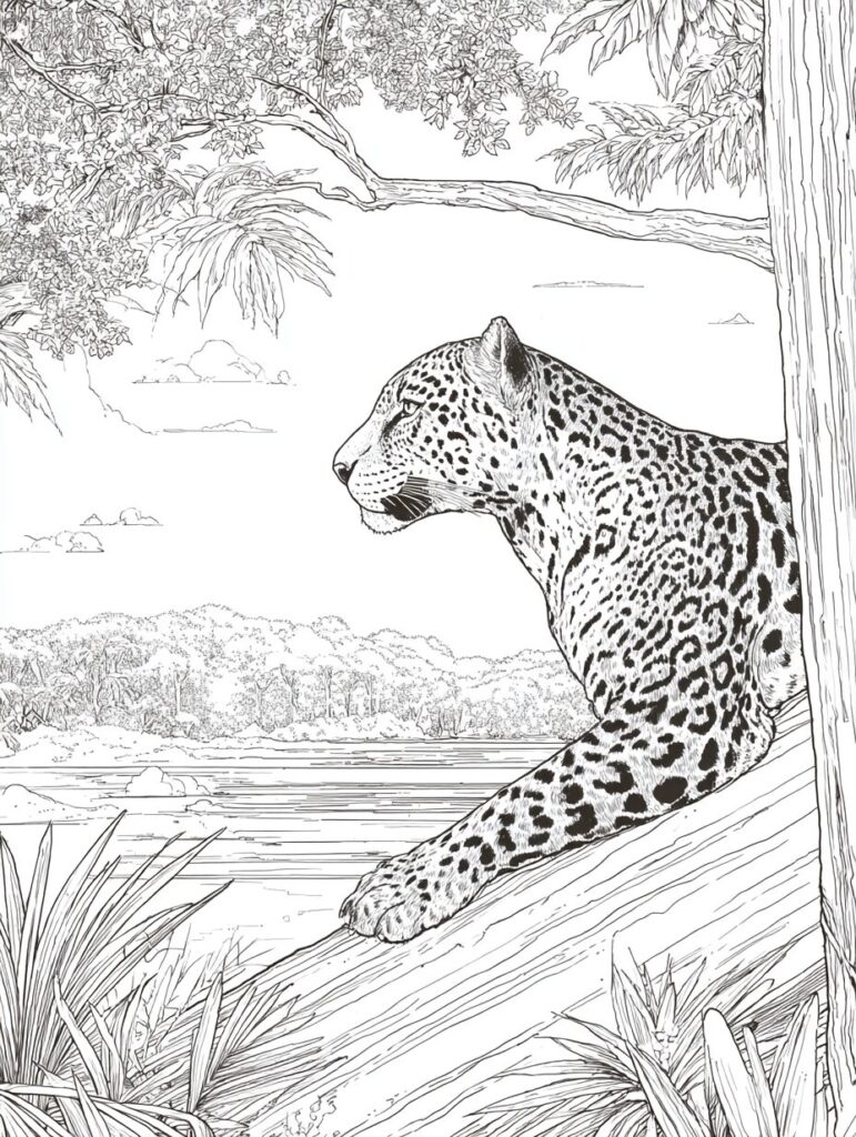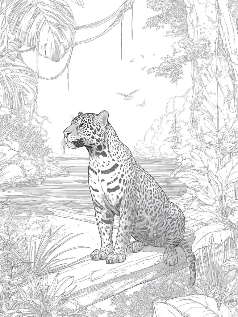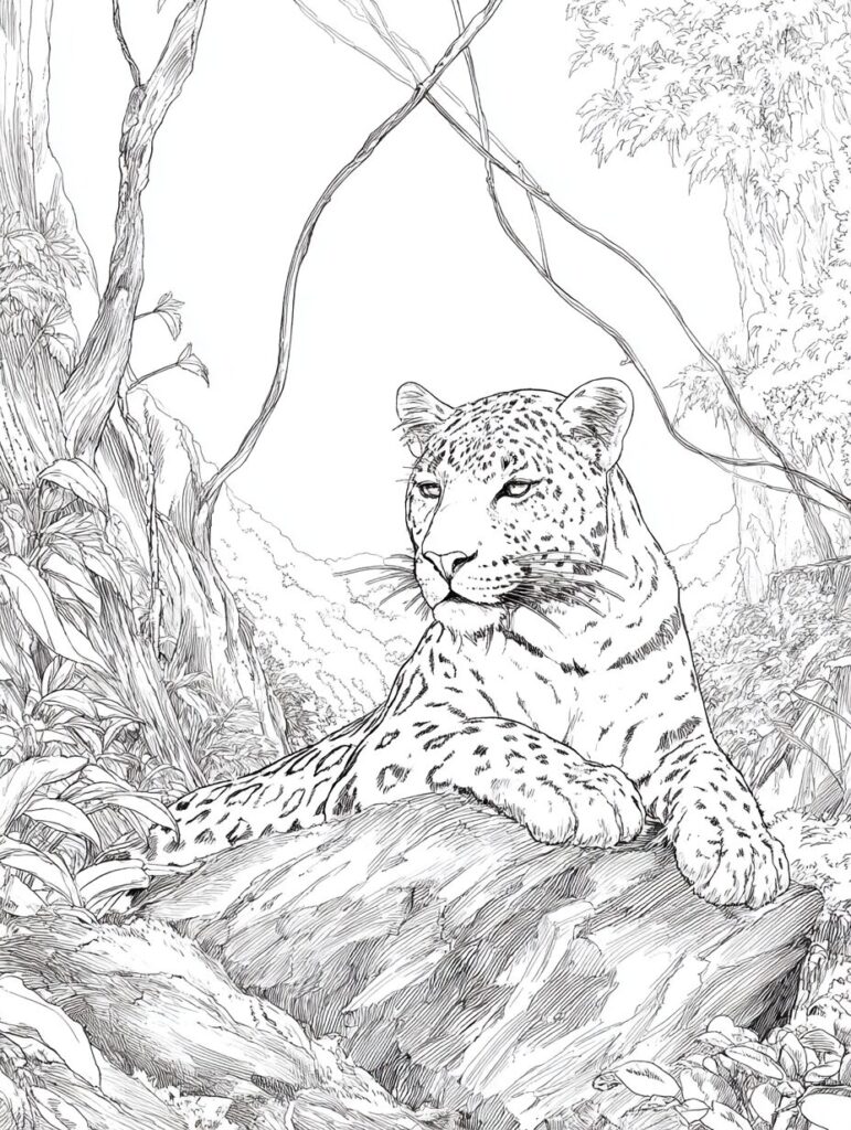 無料塗り絵:ジャガーとジャングル(大人の塗り絵)