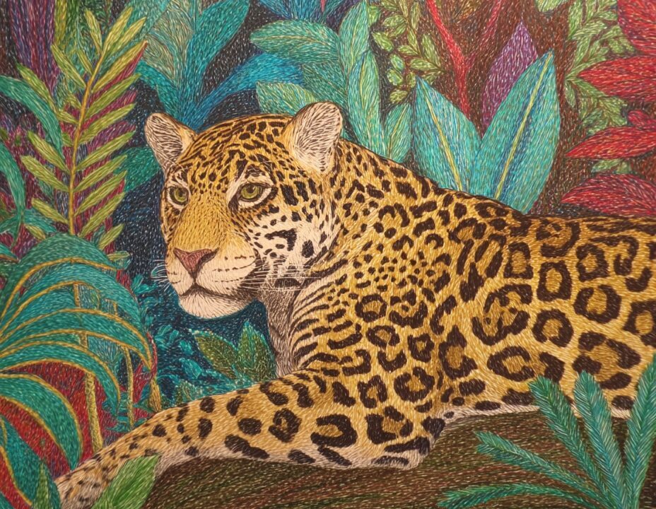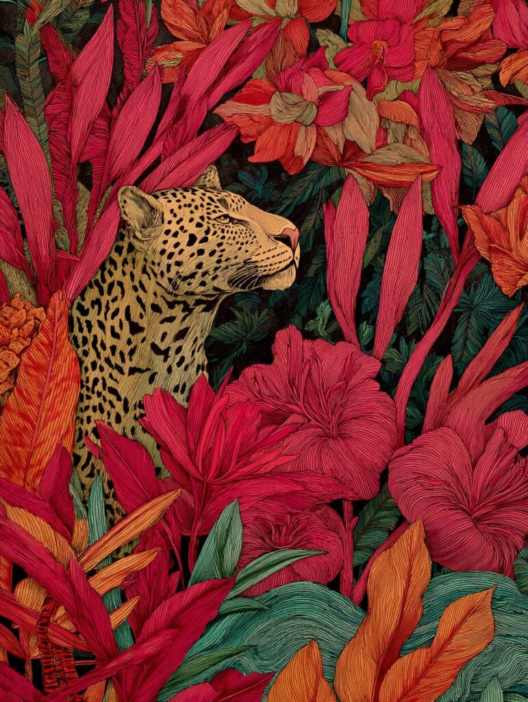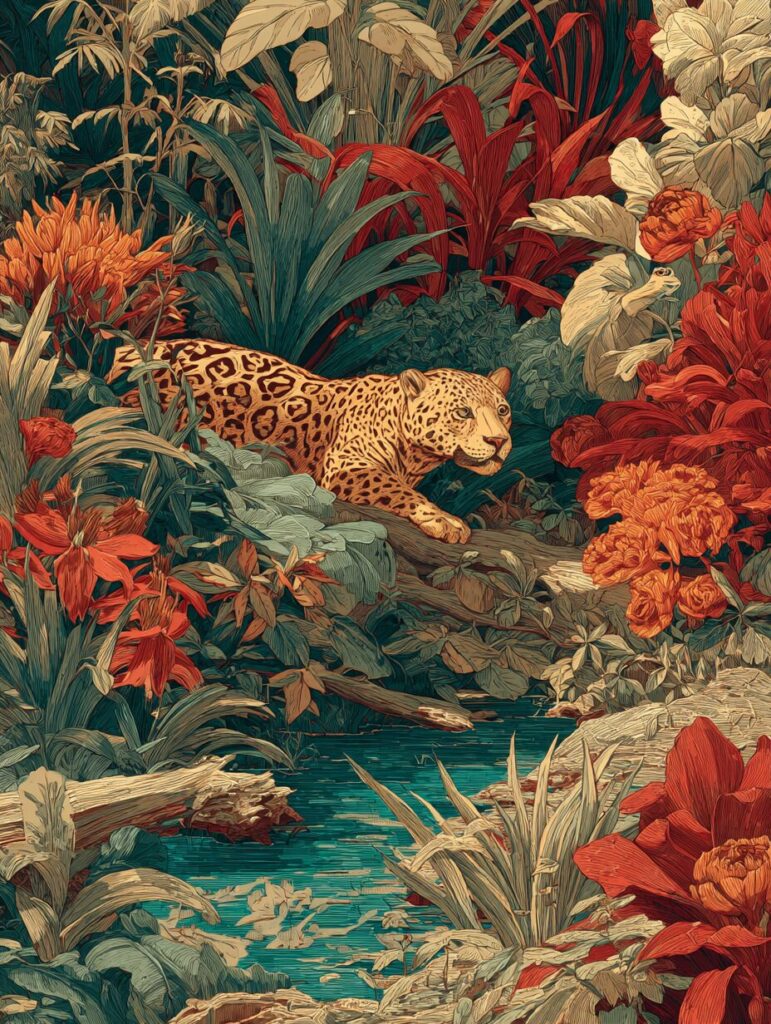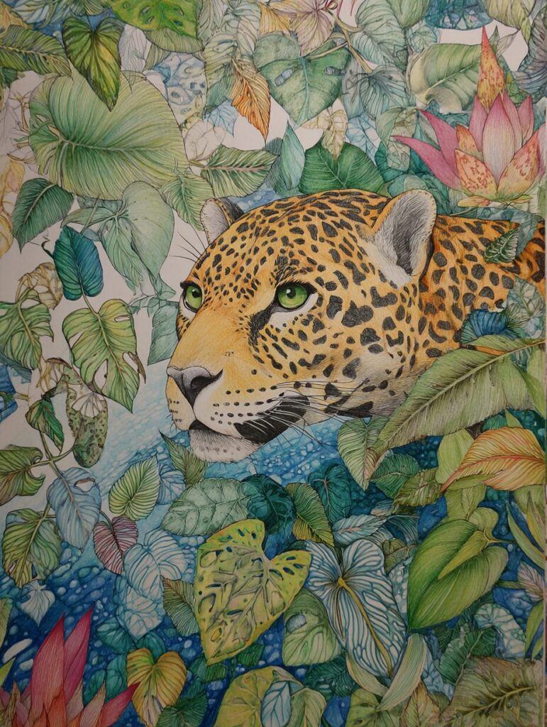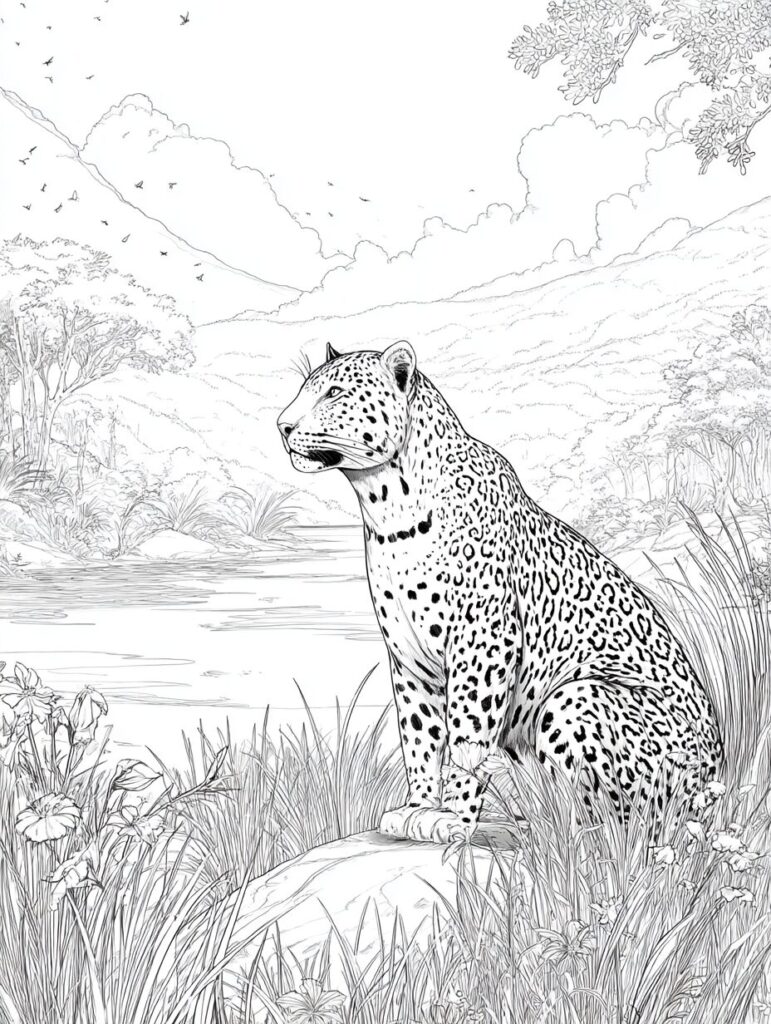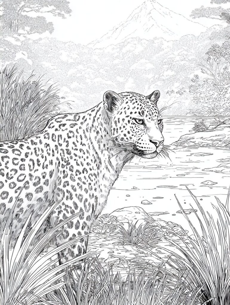 無料塗り絵:ジャガーとジャングル(大人の塗り絵)