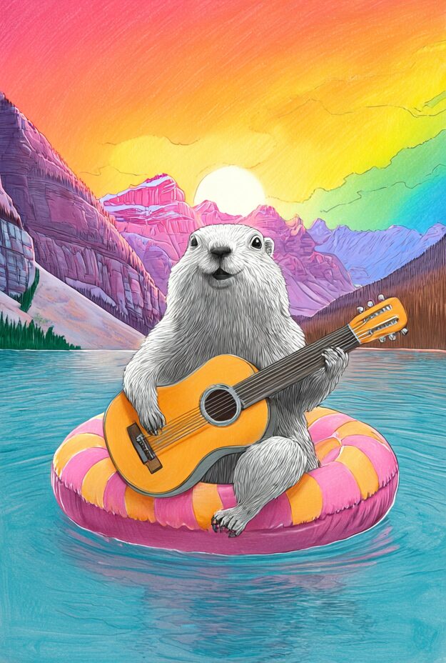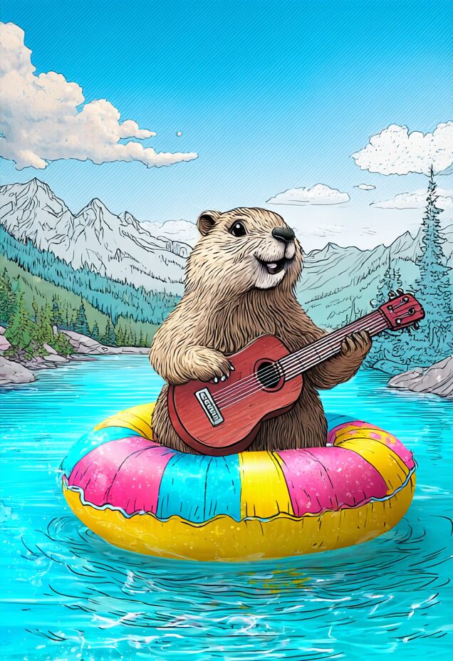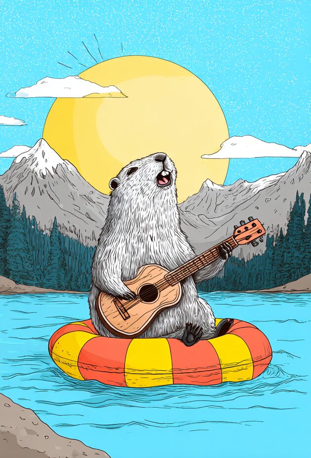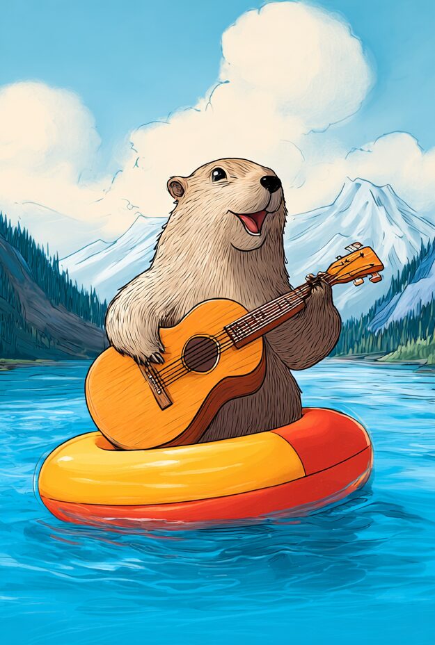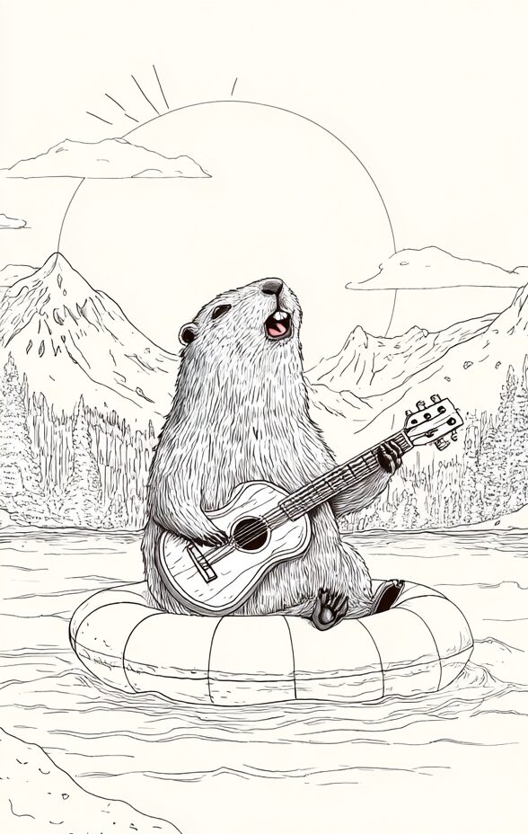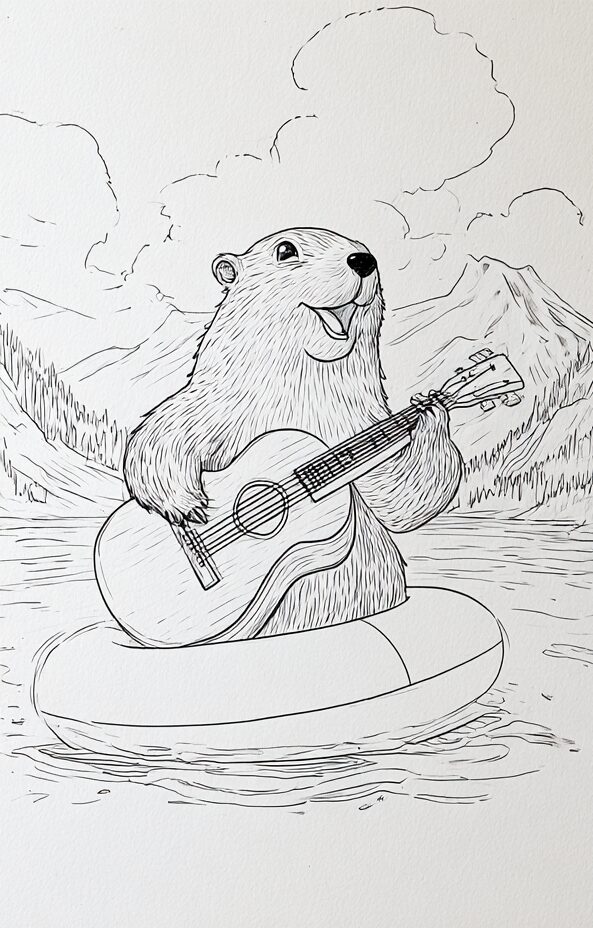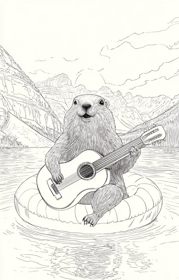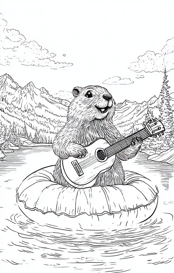 無料塗り絵:浮き輪の上でギターを弾くマーモット(大人の塗り絵)