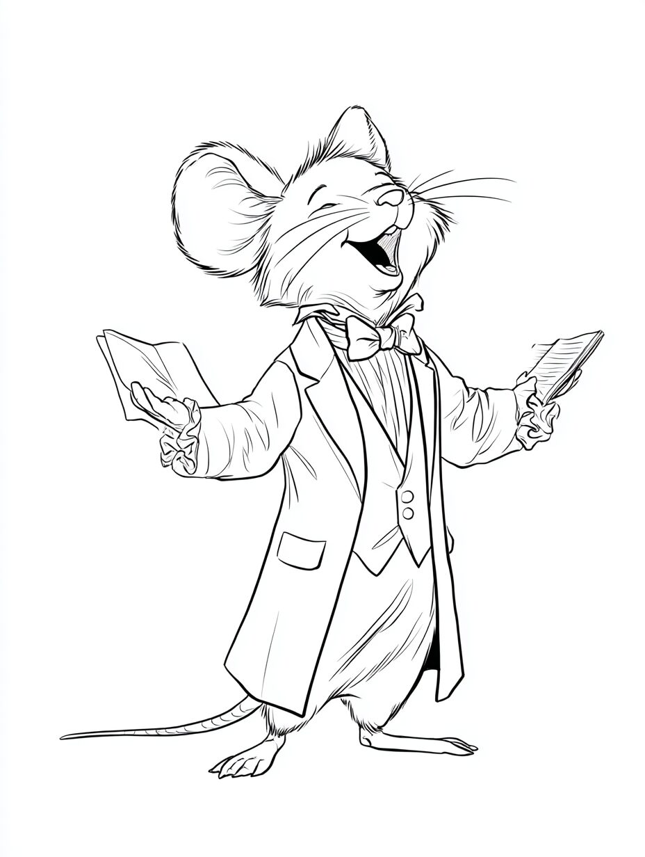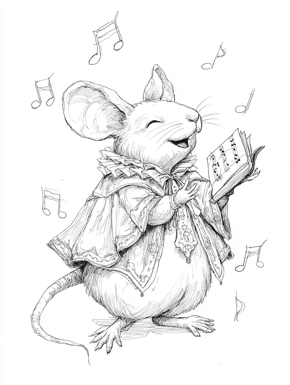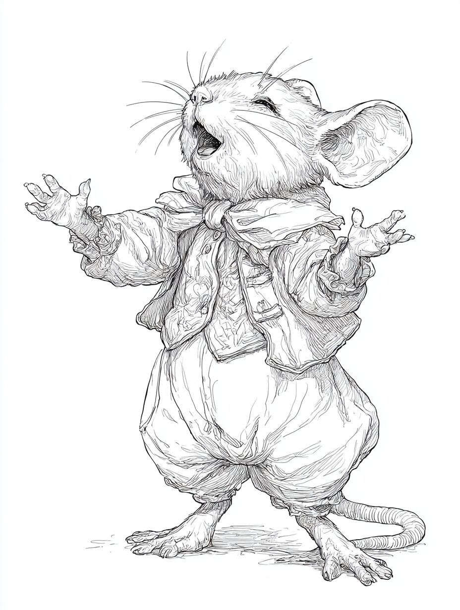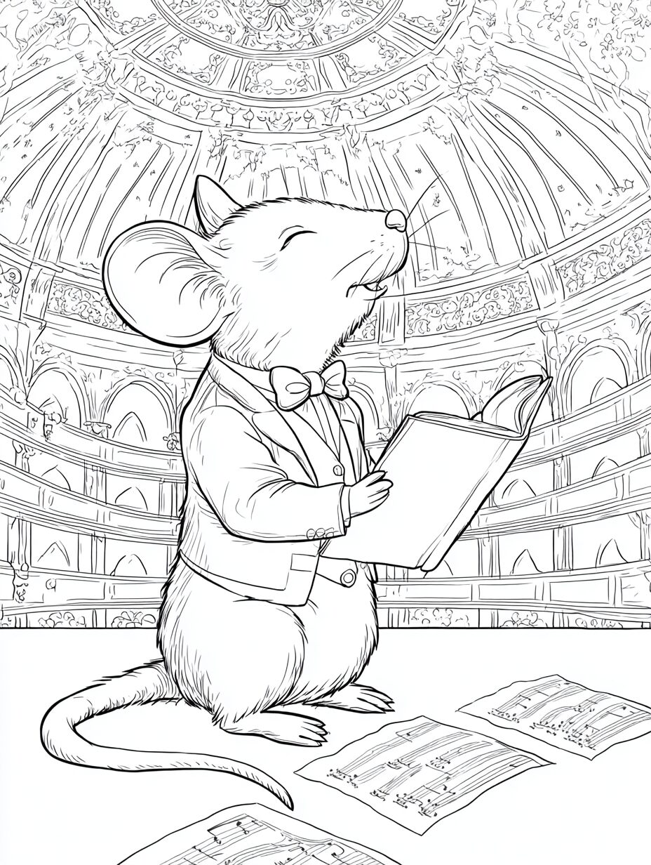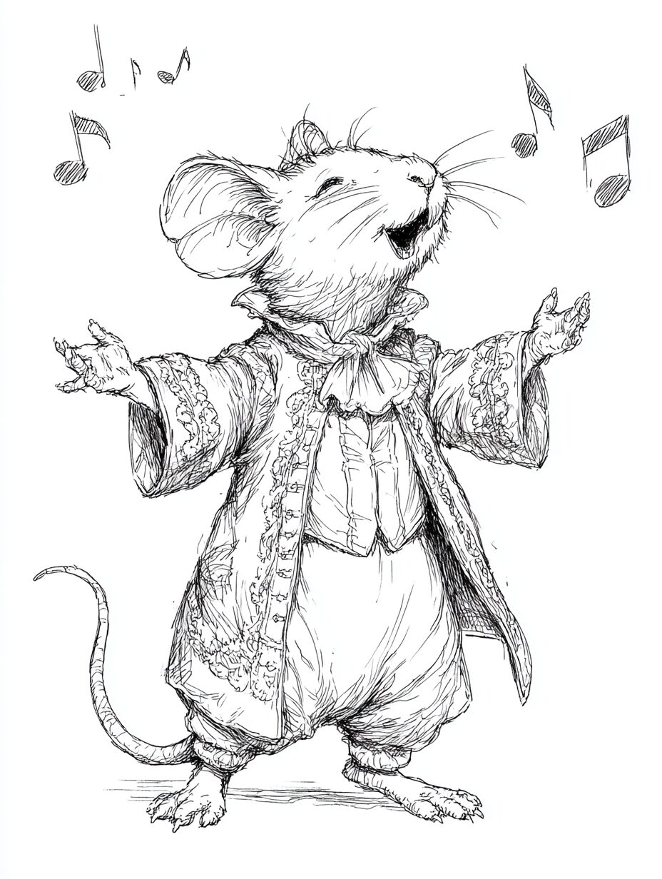 無料塗り絵:オペラを歌うマウス(大人の塗り絵)