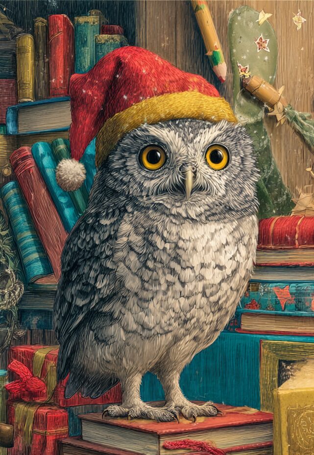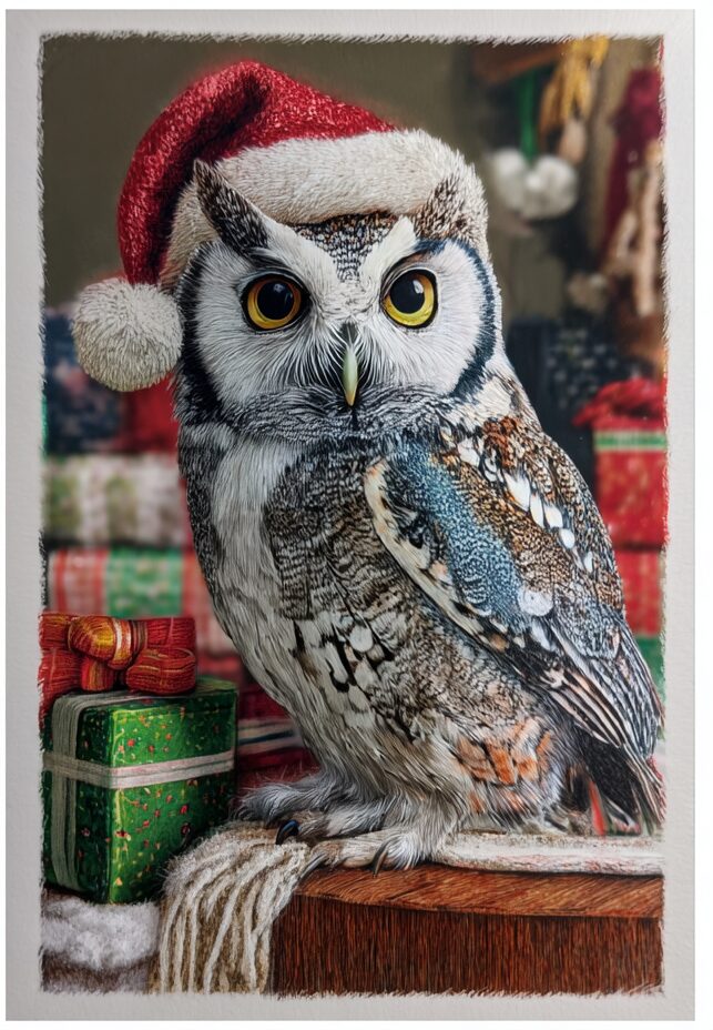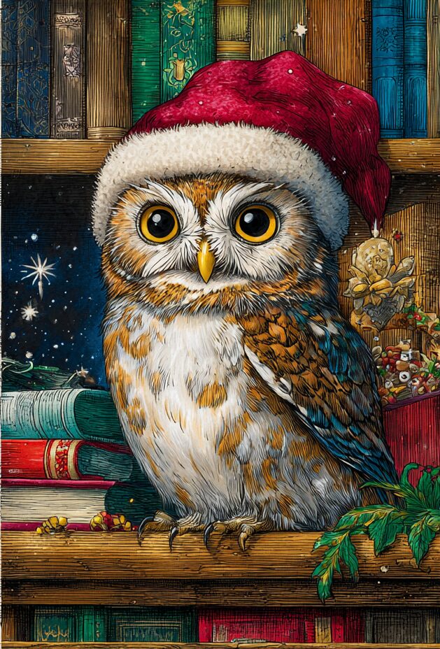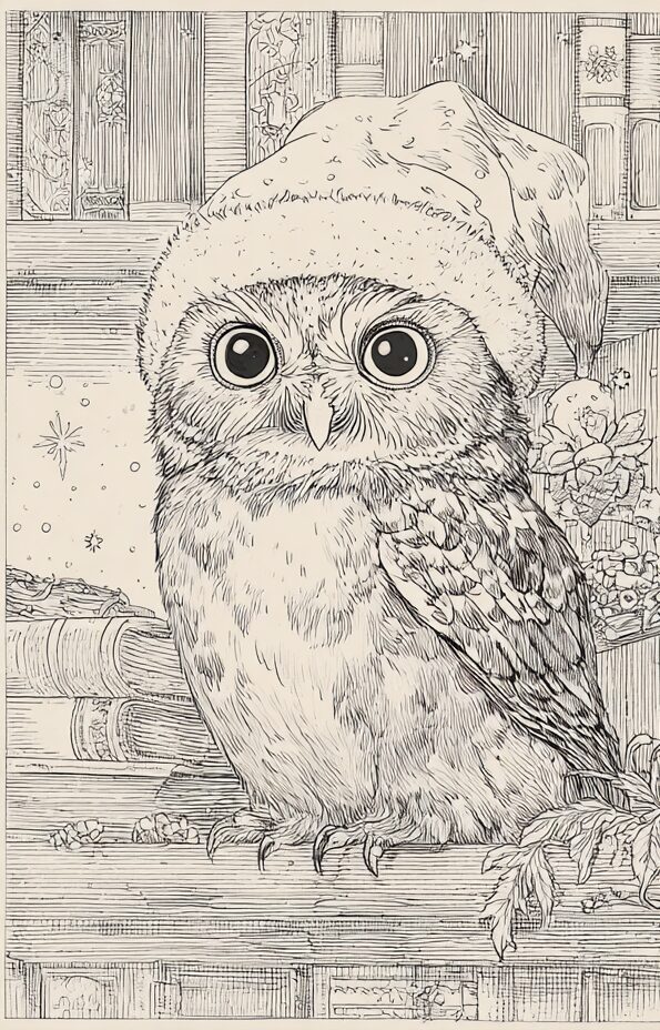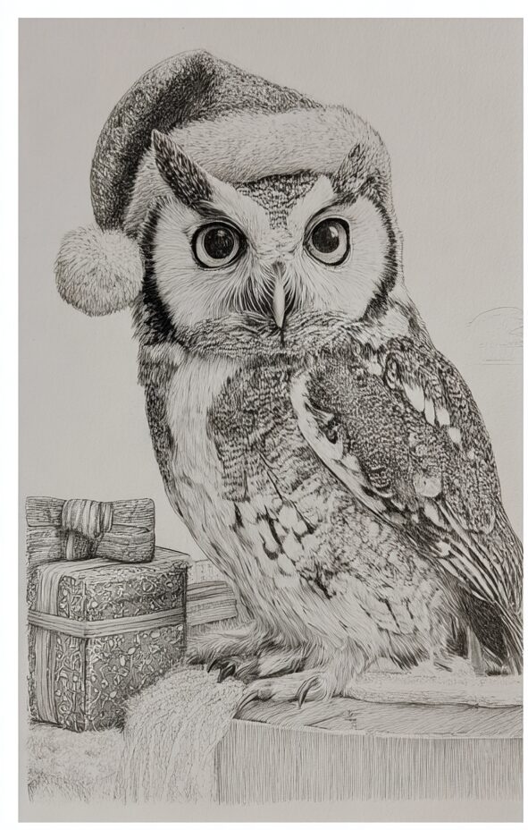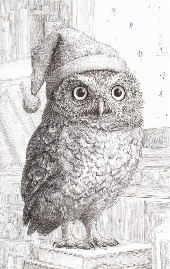 無料塗り絵:クリスマス衣装のふくろう(大人の塗り絵)