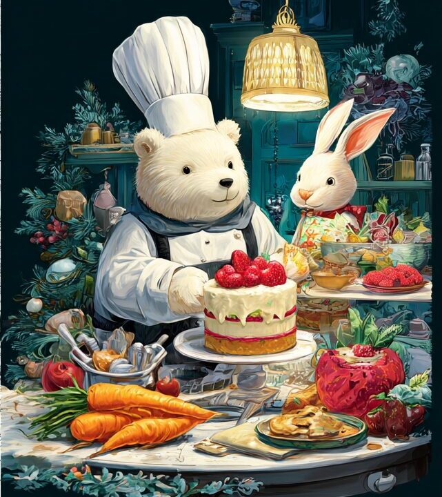 無料塗り絵:クリスマスケーキを作る白熊(大人の塗り絵)