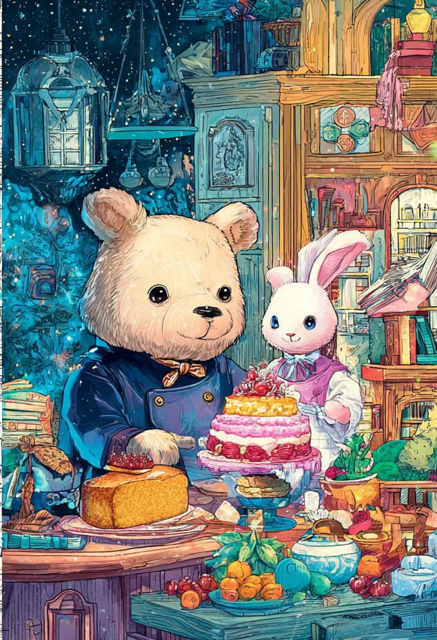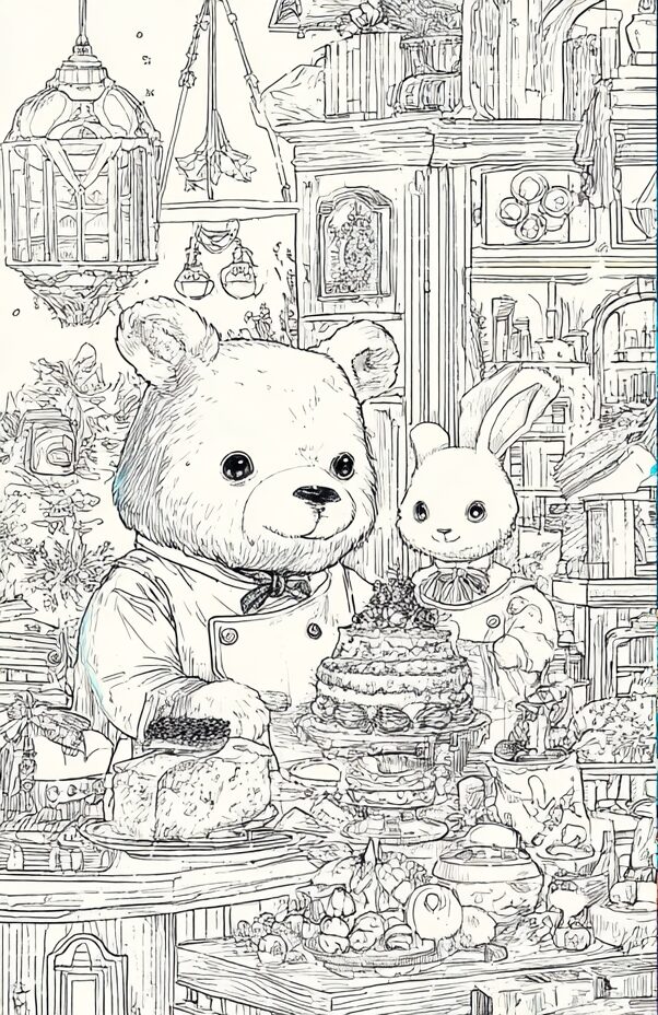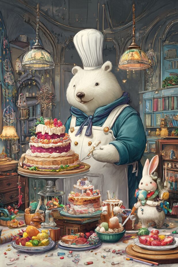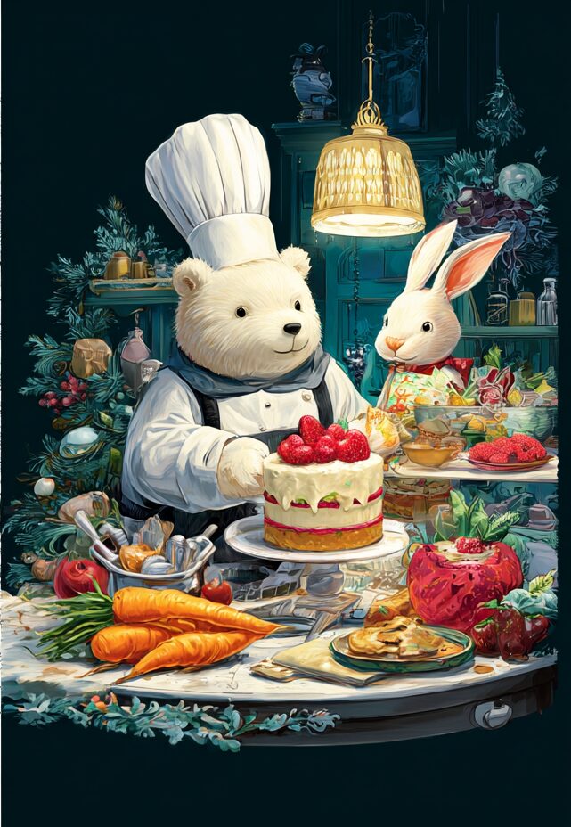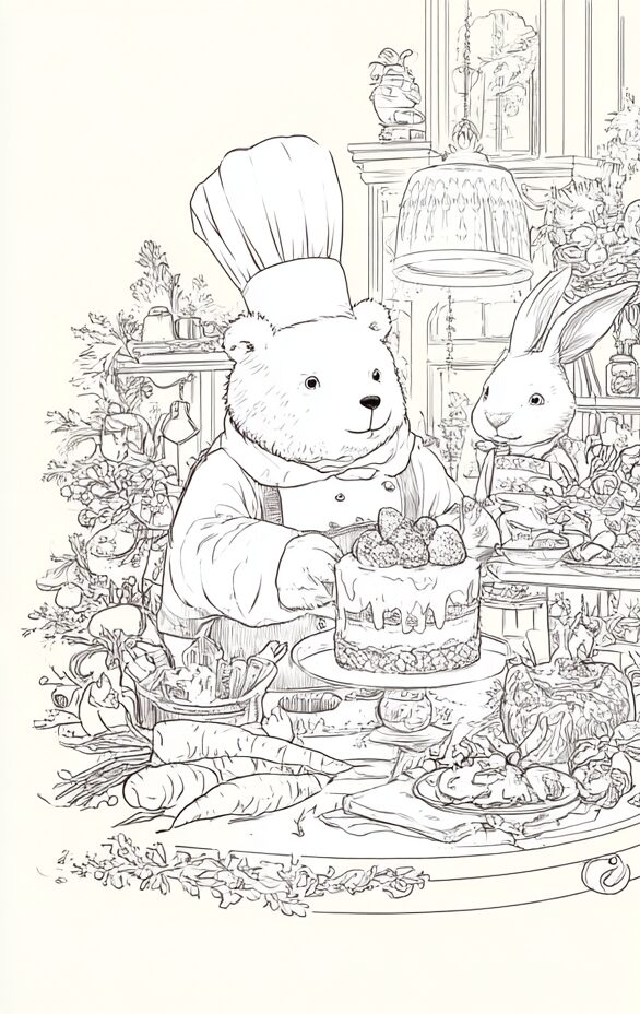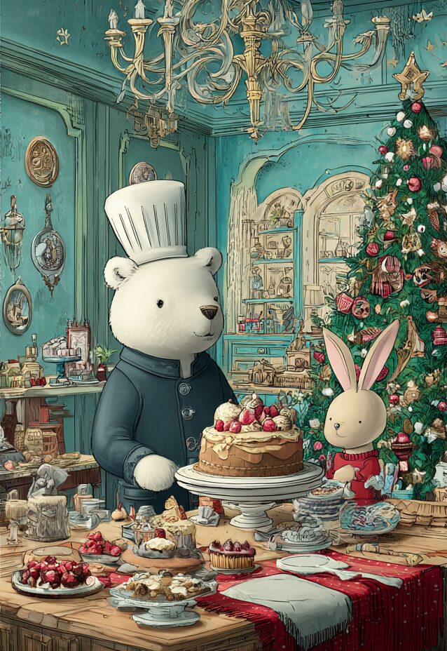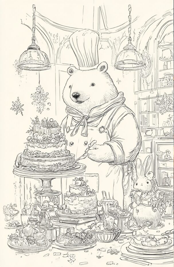 無料塗り絵:クリスマスケーキを作る白熊(大人の塗り絵)