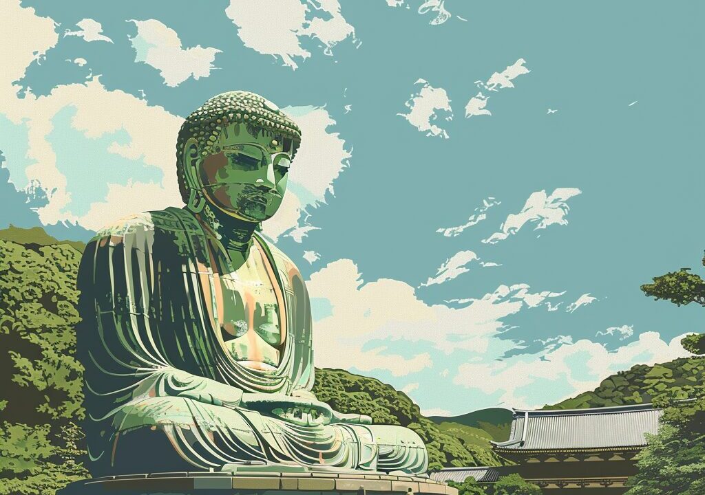 【解説・豆知識】 高徳院の本尊である「鎌倉大仏」は、高さ約11メートル。昔は建物の中にありましたが、津波で建物が流され、今のように屋外に座る形になったといわれています。