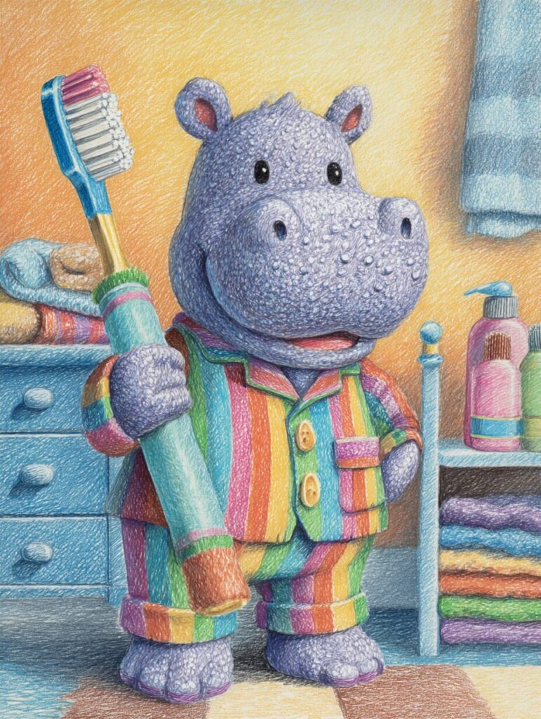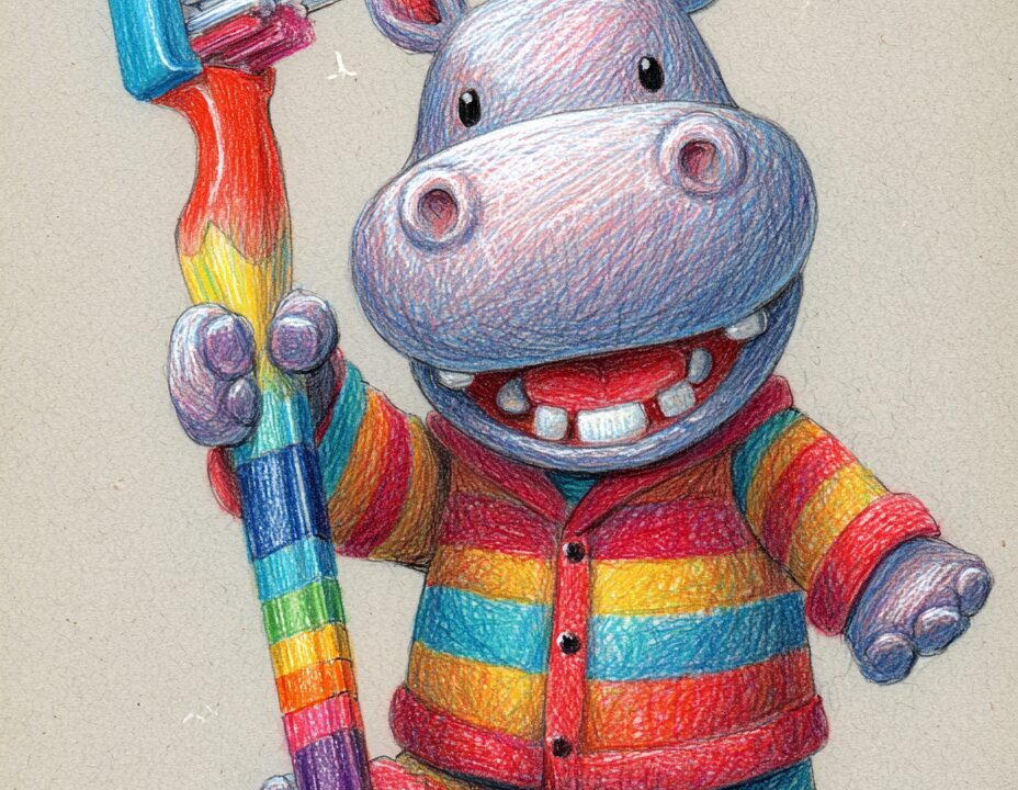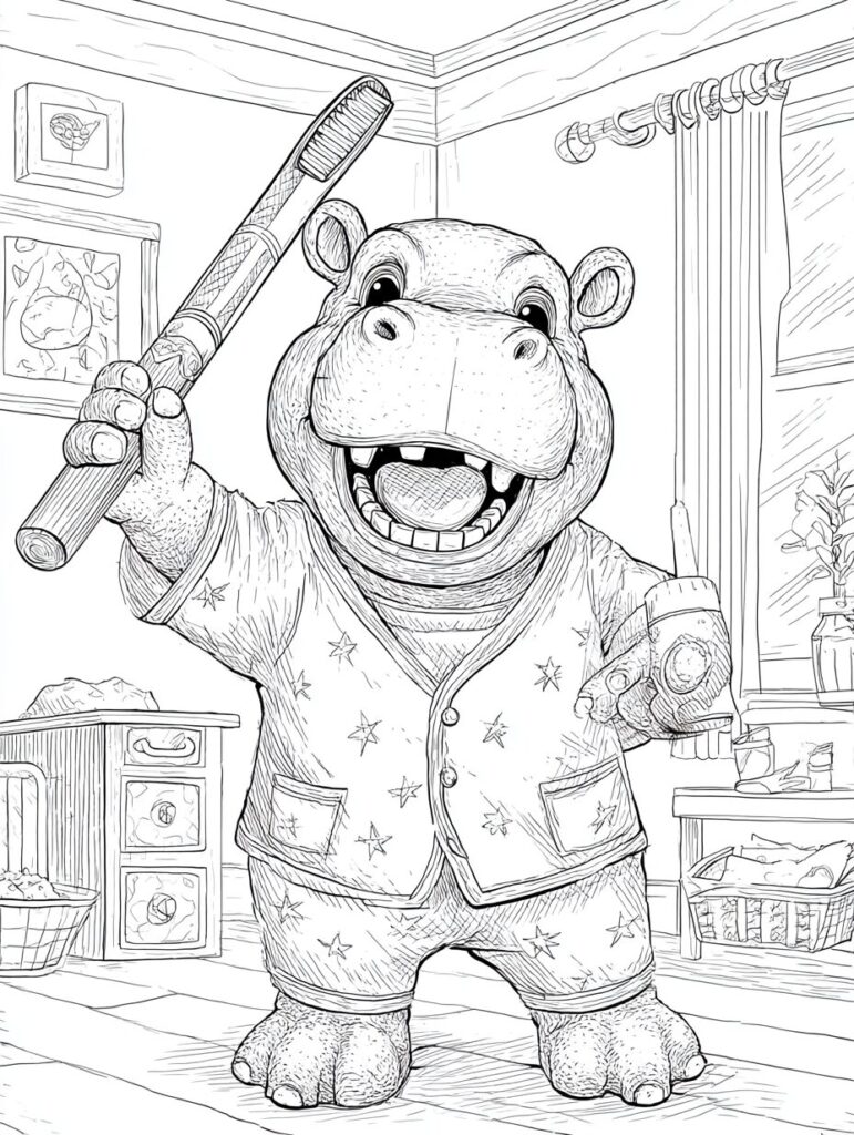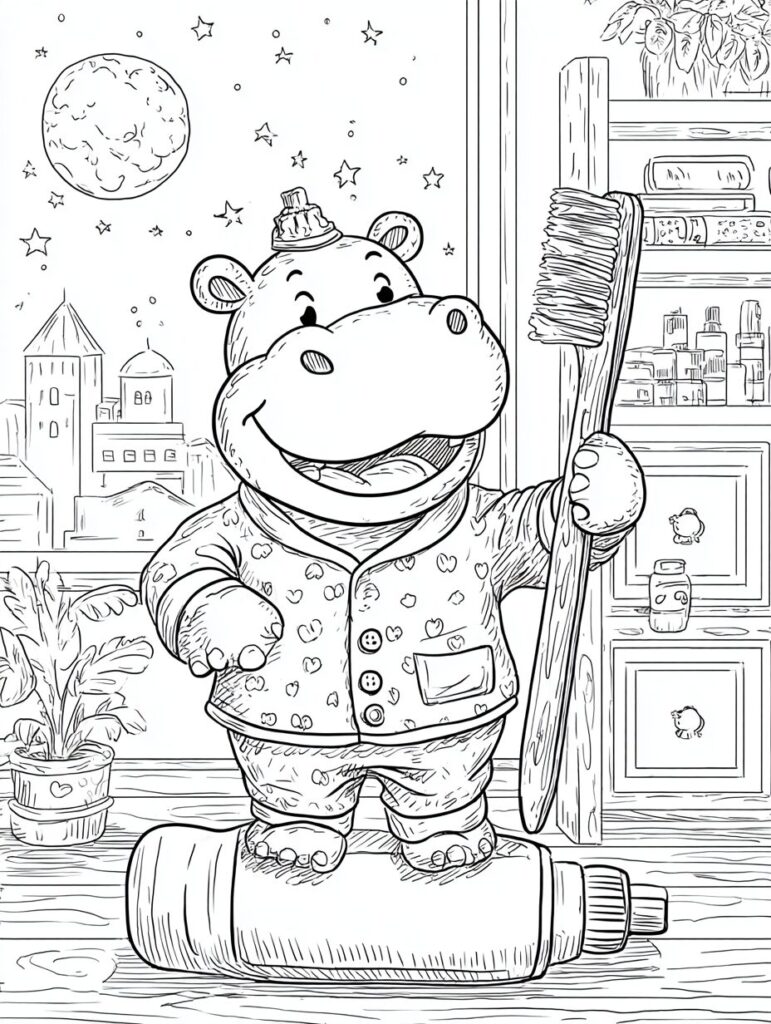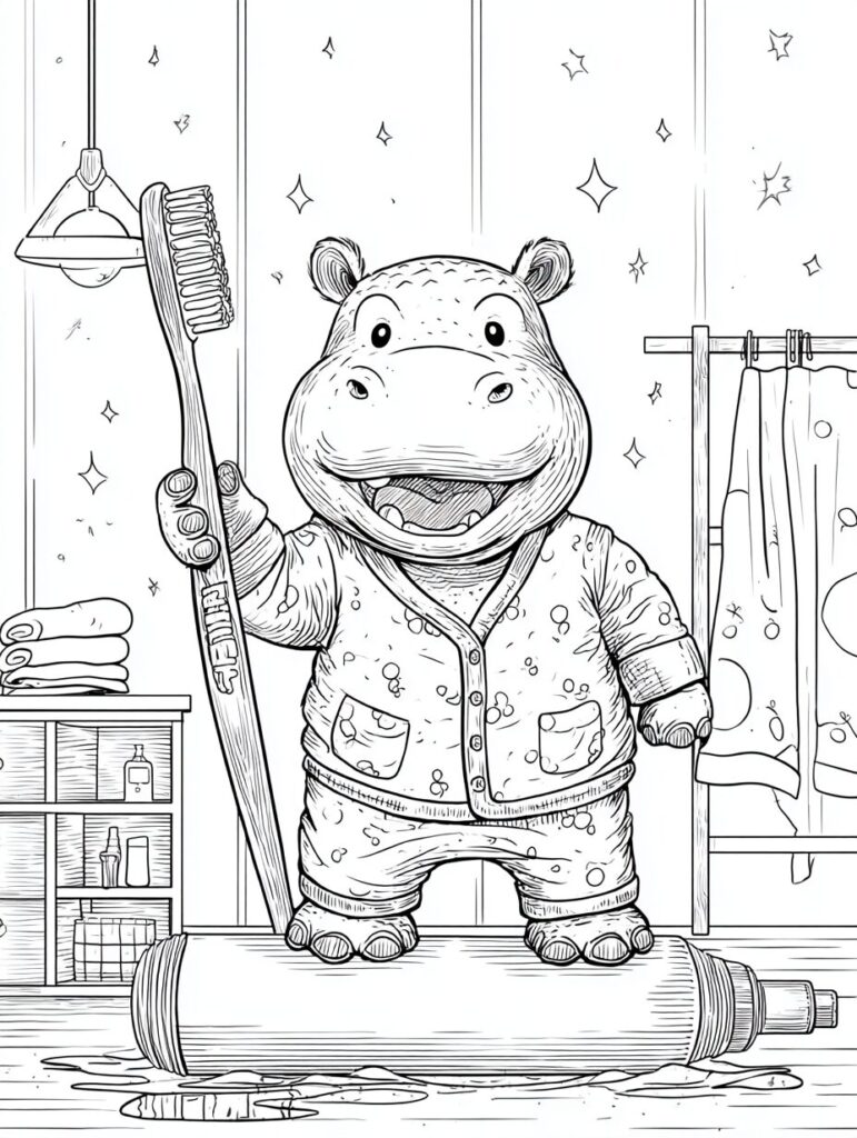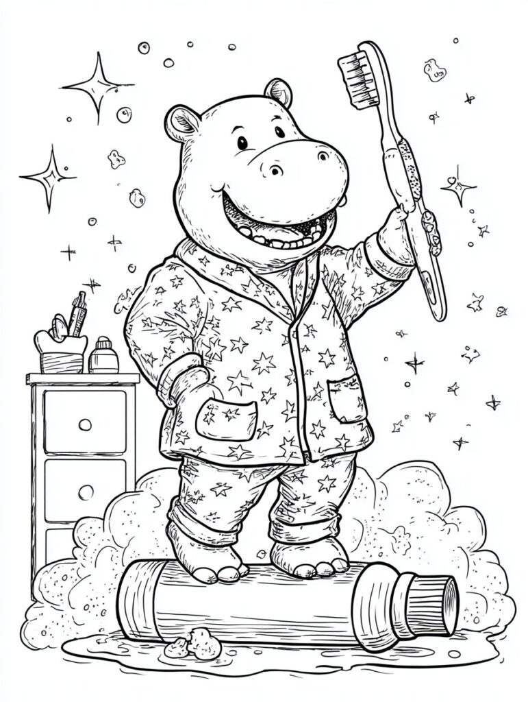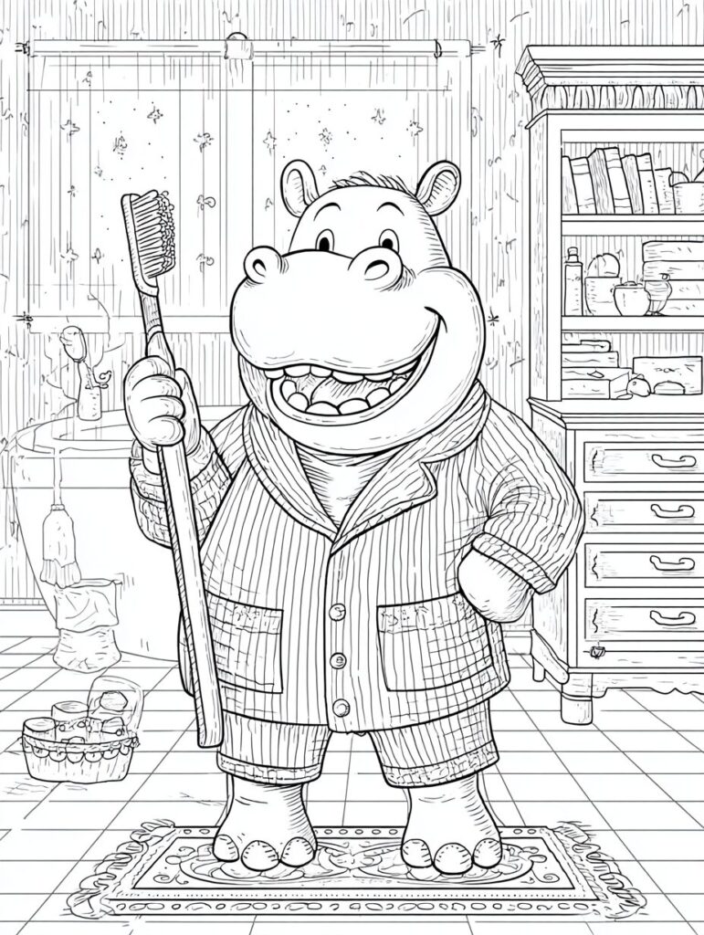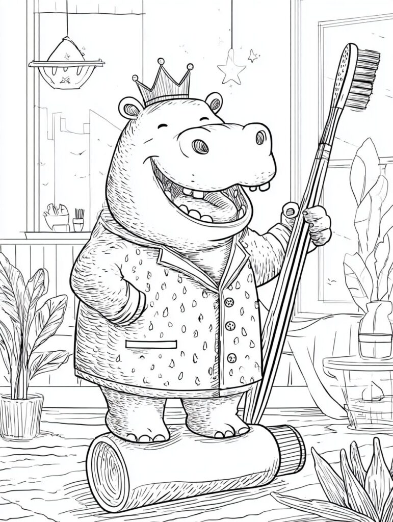 無料塗り絵:虹色歯ブラシとカバ(大人の塗り絵)