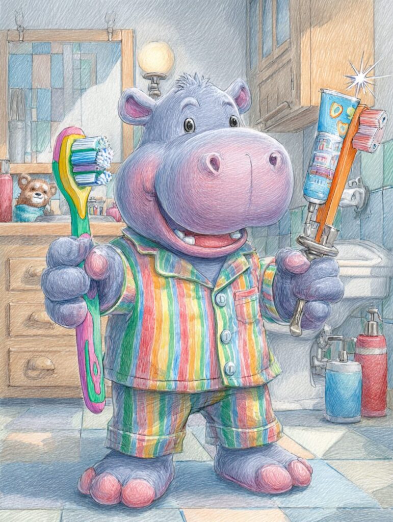虹色歯ブラシとカバの塗り絵|無料塗り絵プリント/高齢者用