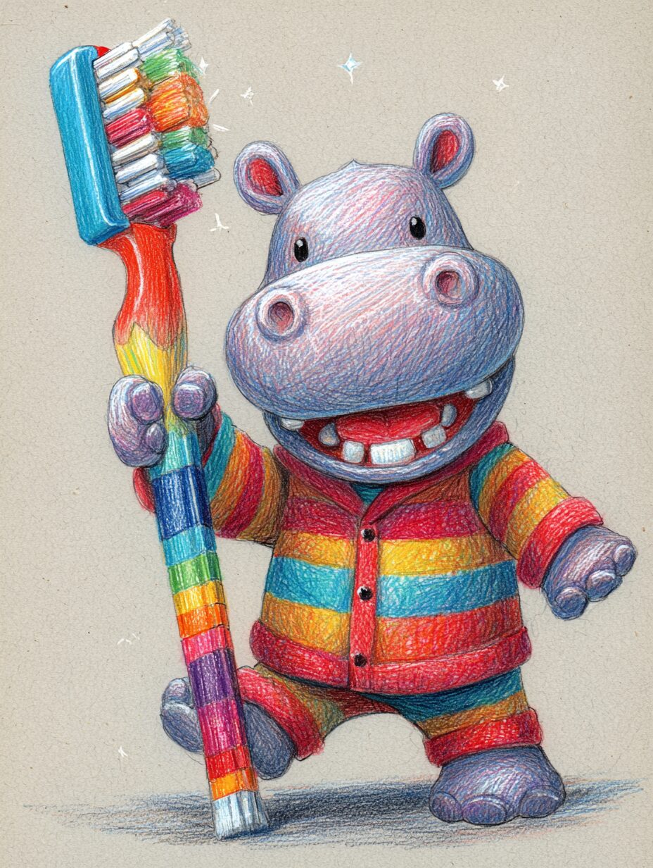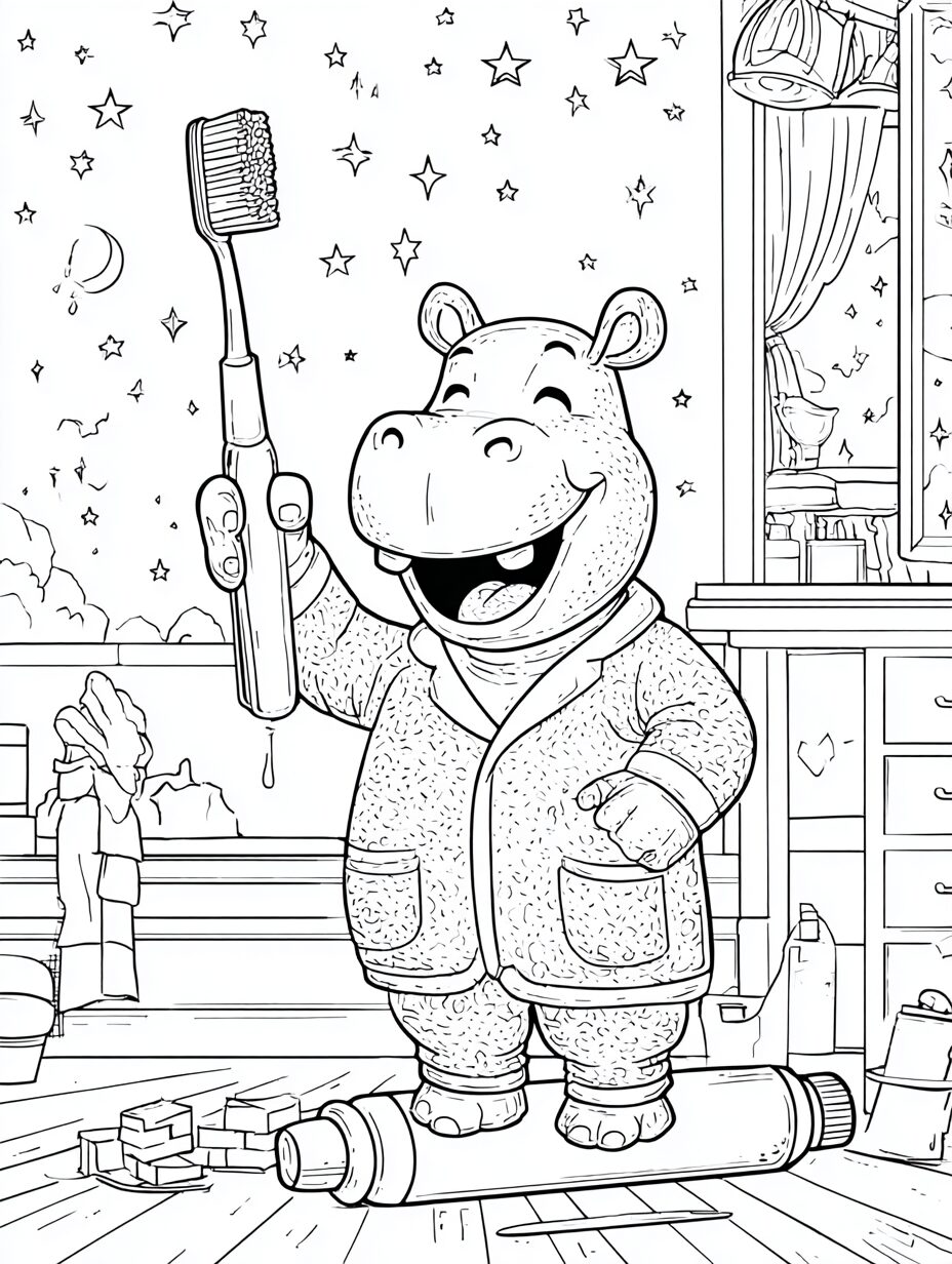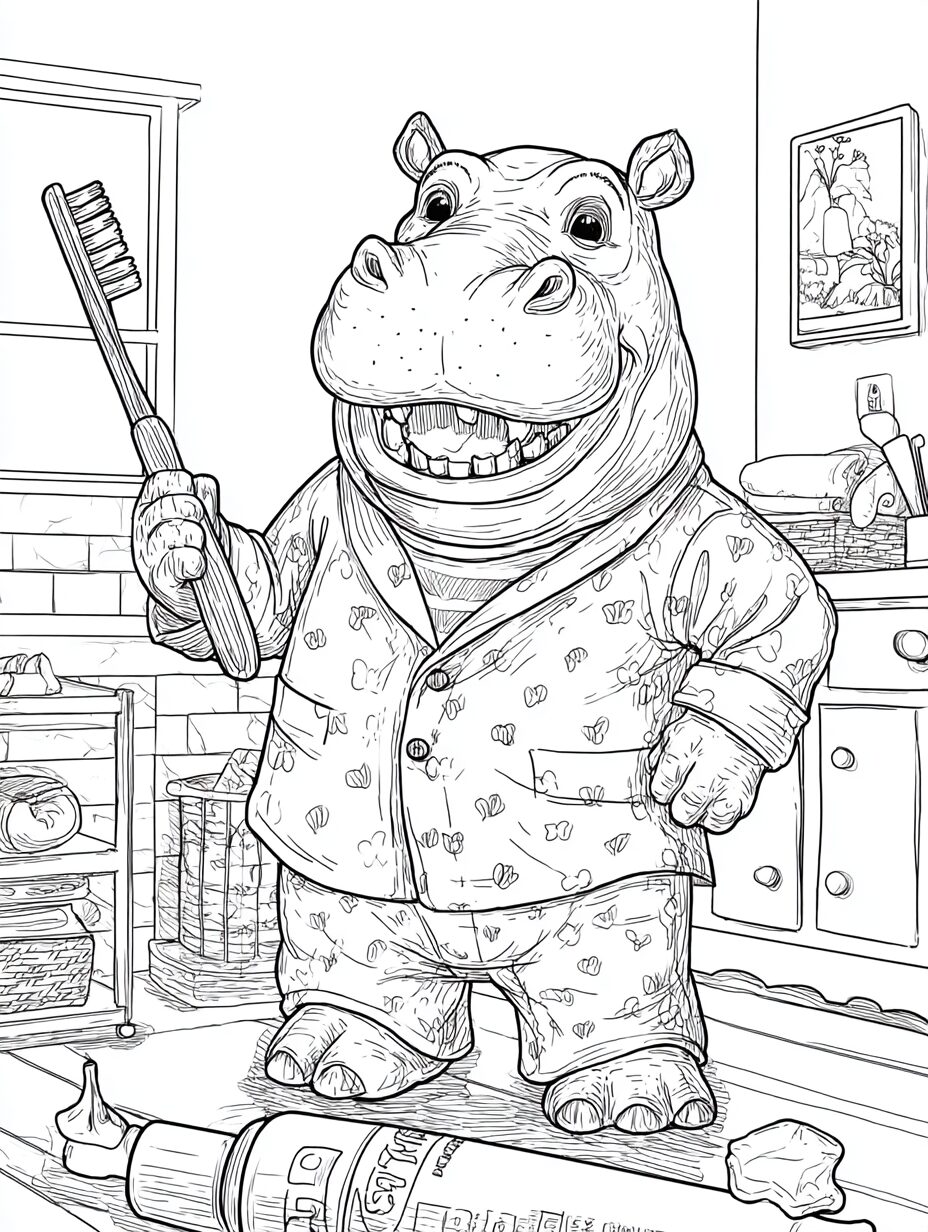 無料塗り絵:虹色歯ブラシとカバ(大人の塗り絵)